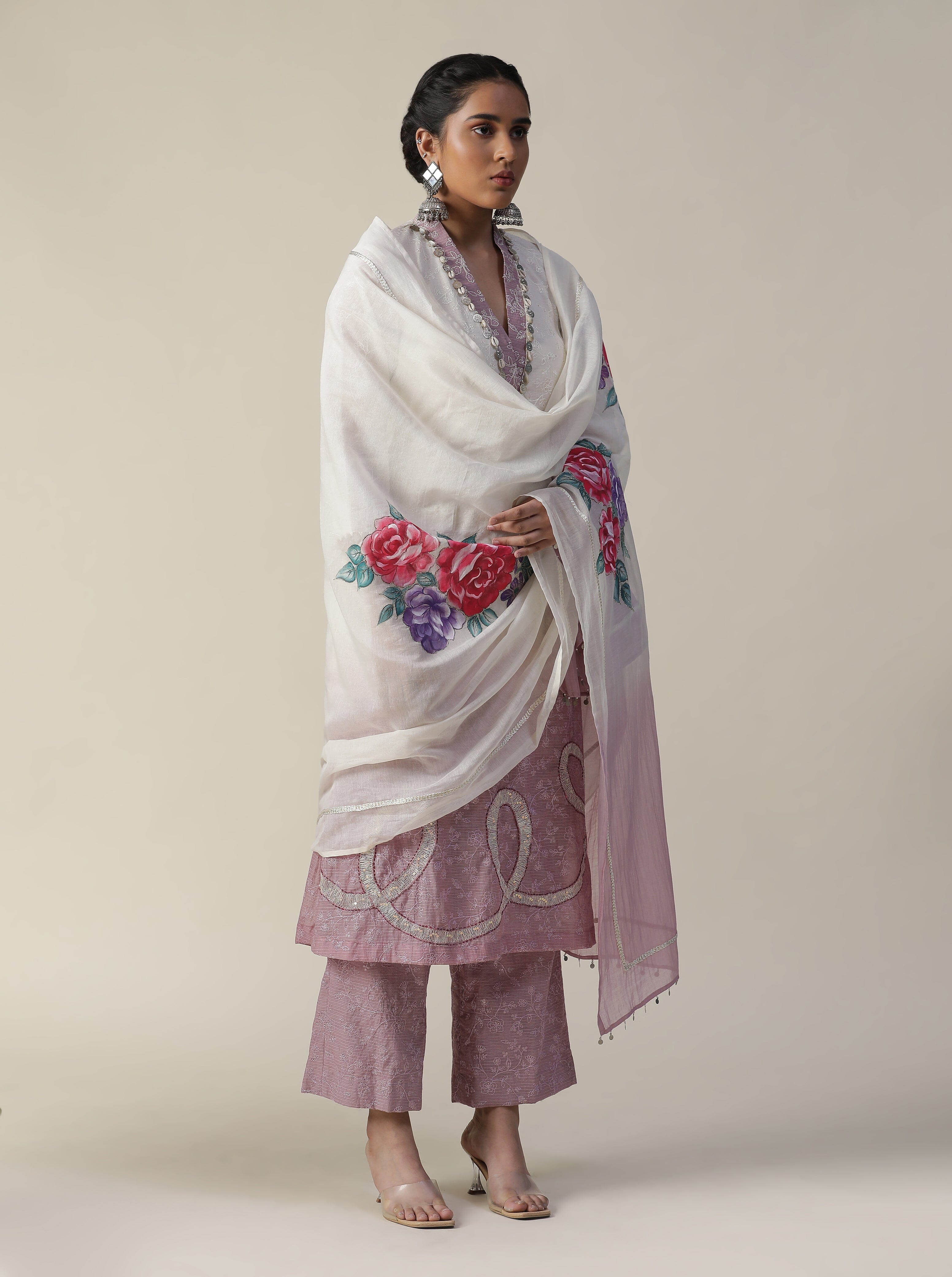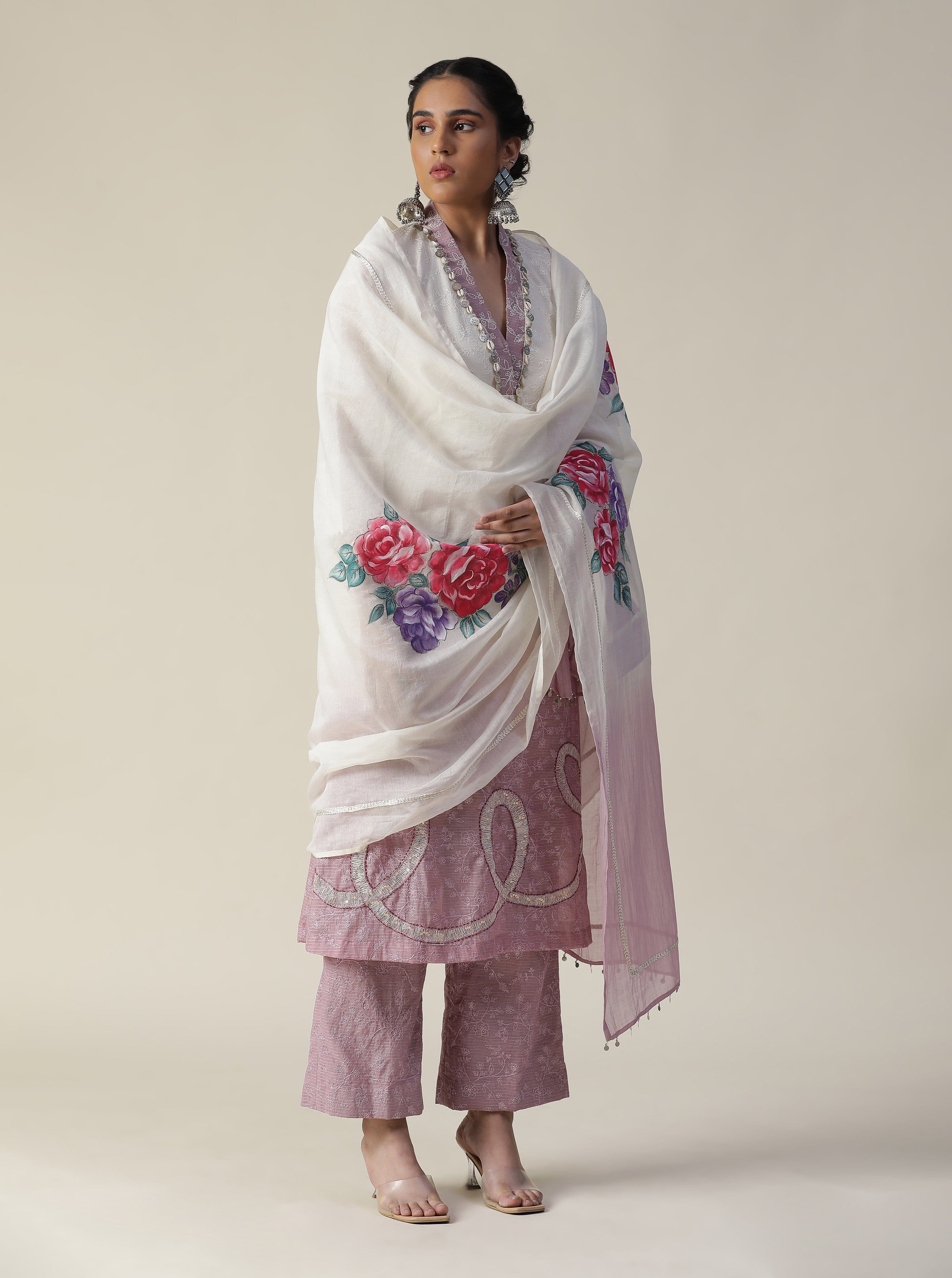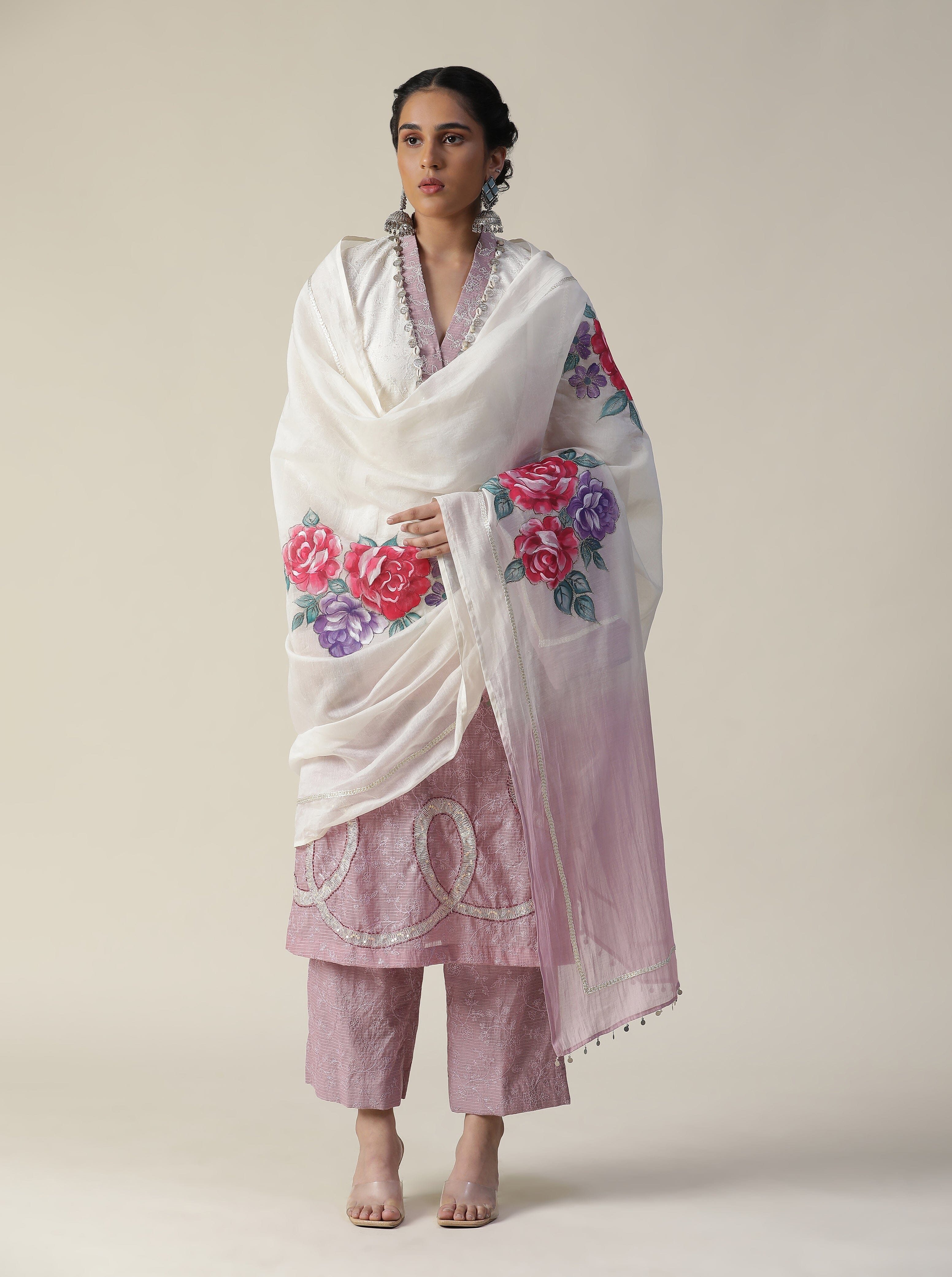 Featuring our white lilac ombre suit set. Comes with an embroidered ombre kurti with shells & silver coins work at neck(V-neck) and straight pant and a hand painted cotton chanderi dupatta.