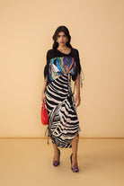 Dual Abstract Bird Print And Abstract Stripe Print, Hand Micro Pleat Kaftan Style Dress With Adjustable Mirror And Tassle Hand Embroidered Drawstring Sleeves And Length