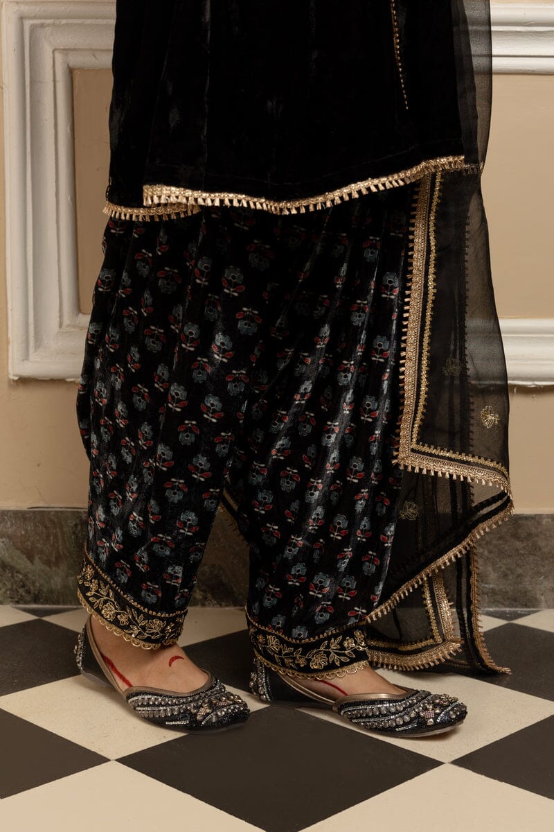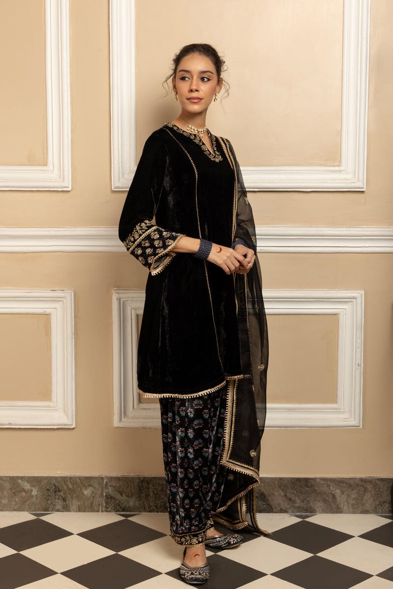 Make a bold statement with the Ziya Black A-Line Short Velvet Kurta Set. This chic A-line kurta is crafted from rich velvet and features exquisite embroidery, showcasing dazzling dabka, zari, sequins, and gota that elevate its allure. Paired with stylish printed salwar and a flowing pure organza dupatta, this set offers a perfect balance of comfort and sophistication