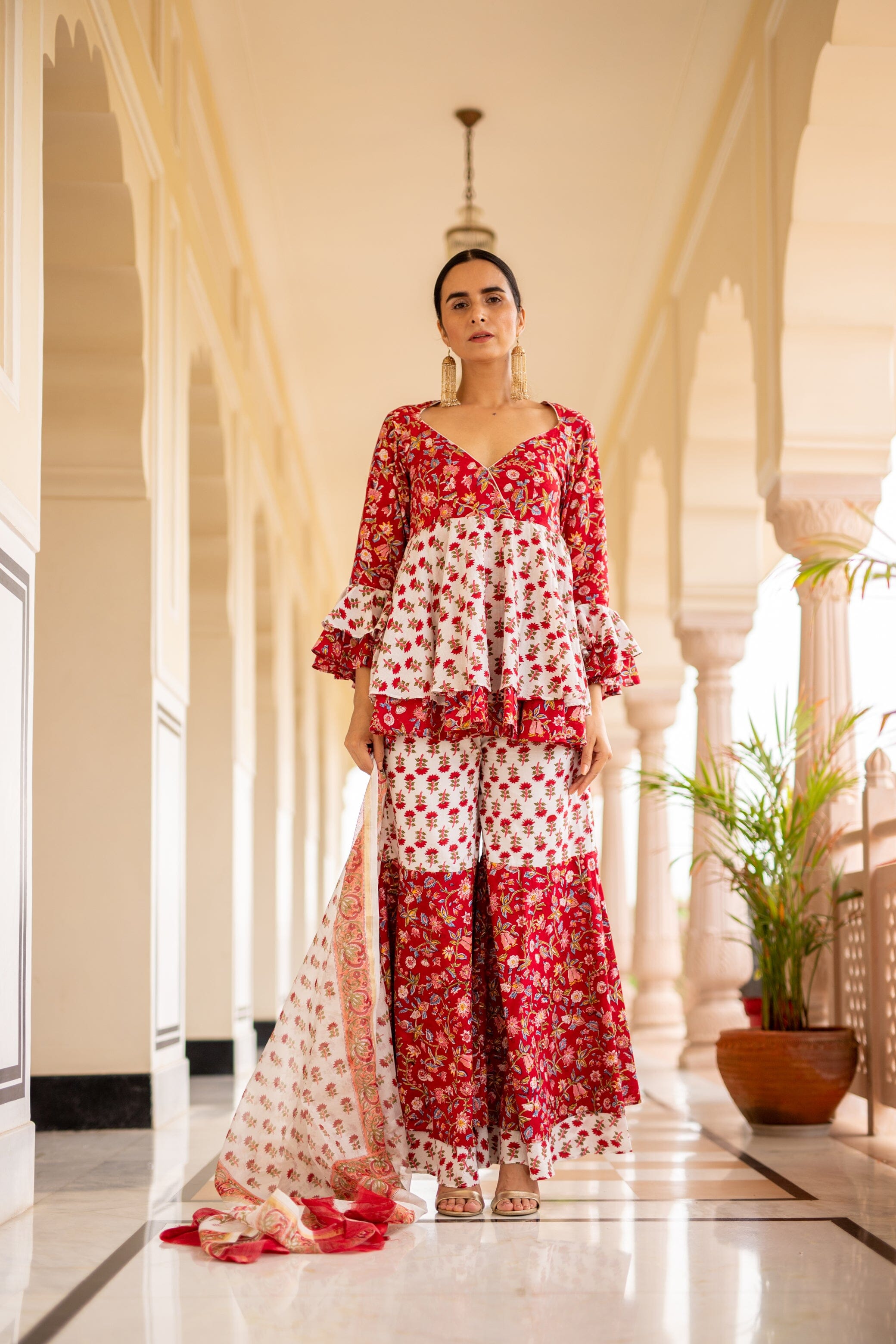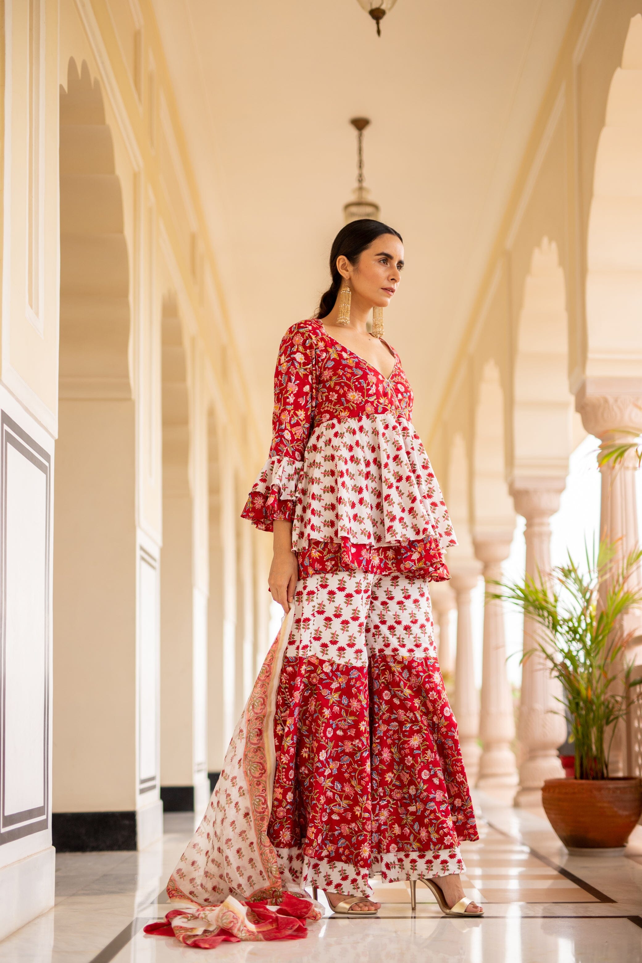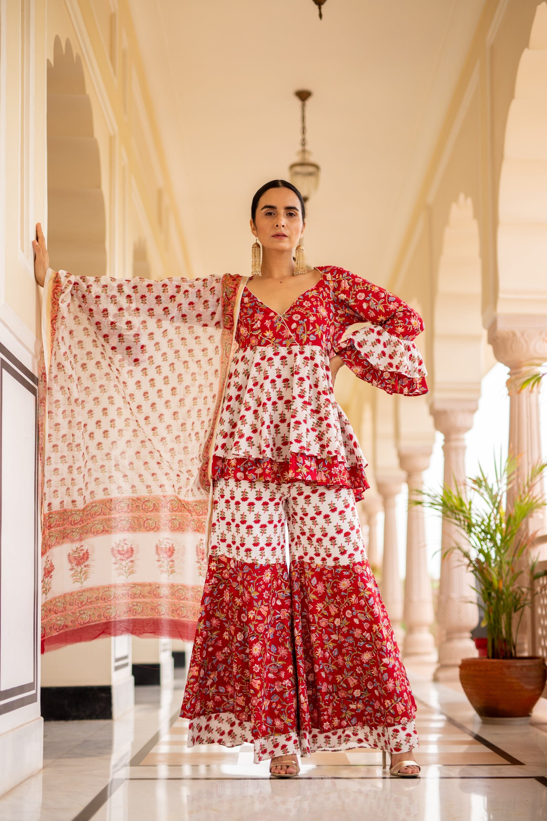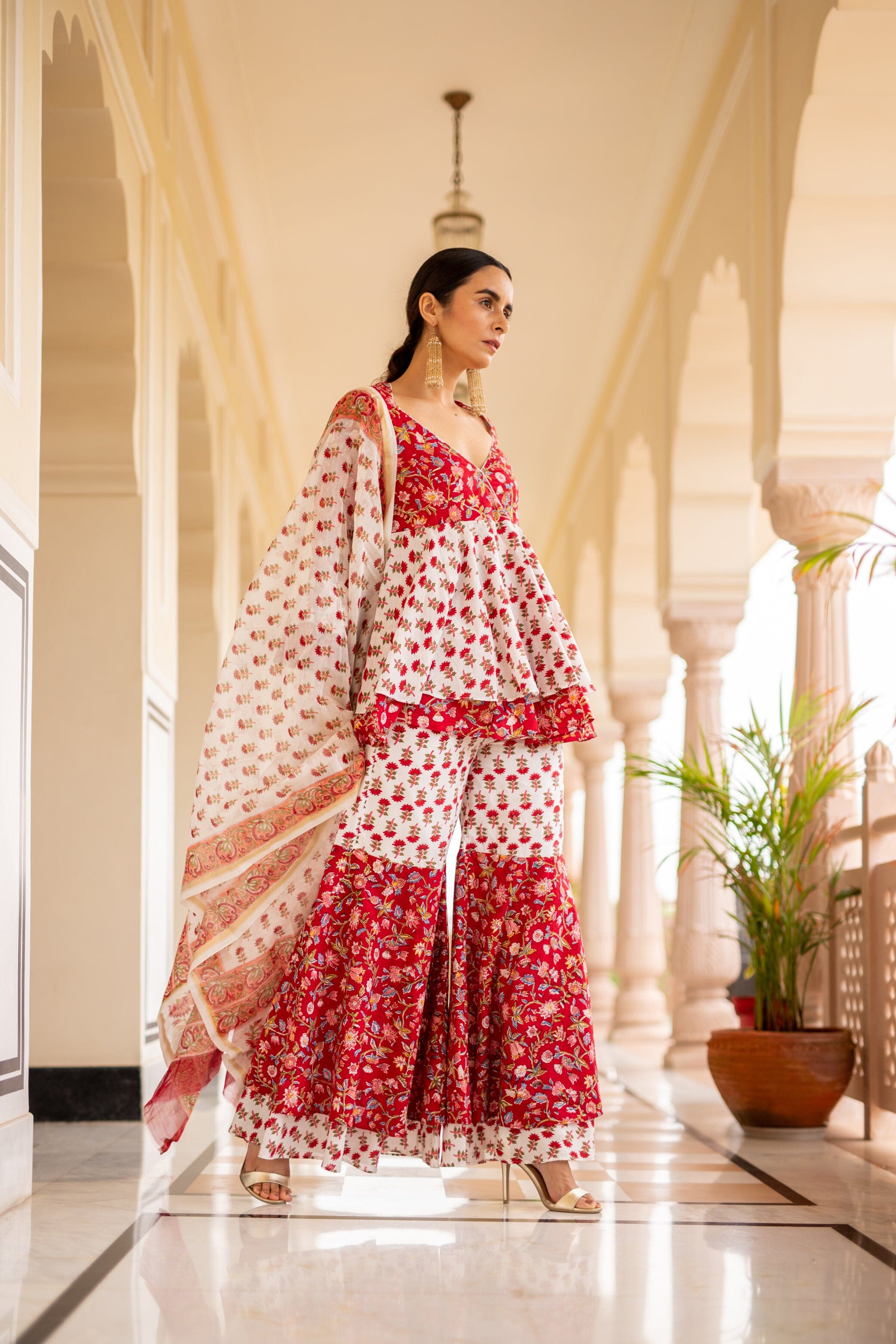 Sweetheart Neckline, Fit, And Flare Sleeves, Alined Flare, With Sharara Double Layer Pants, Chanderi Dupatta. Featuring a sweetheart neck kurta with double alined flare in cotton-blend base block print. It is paired with matching pants and a dupatta.