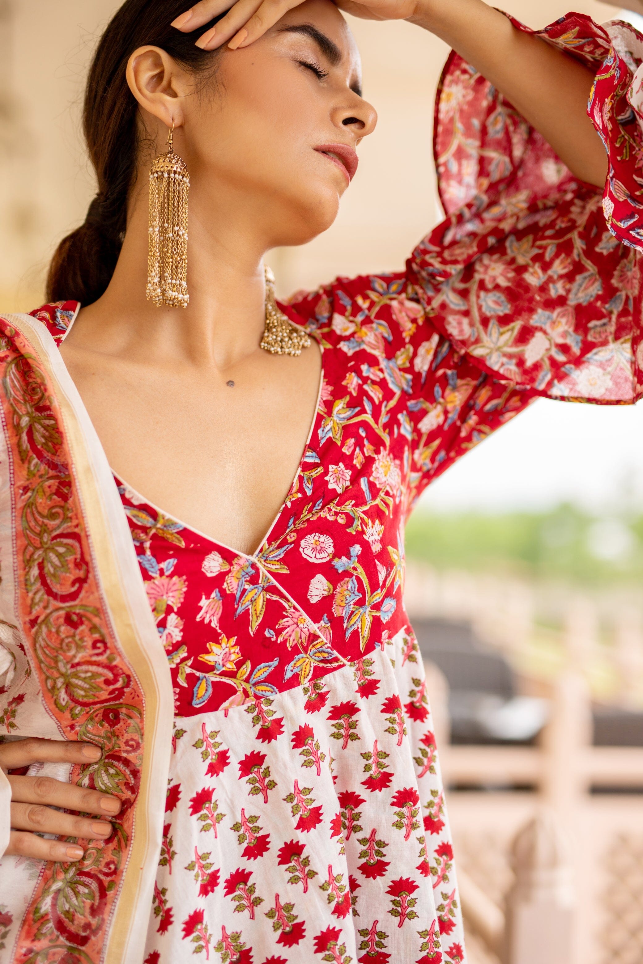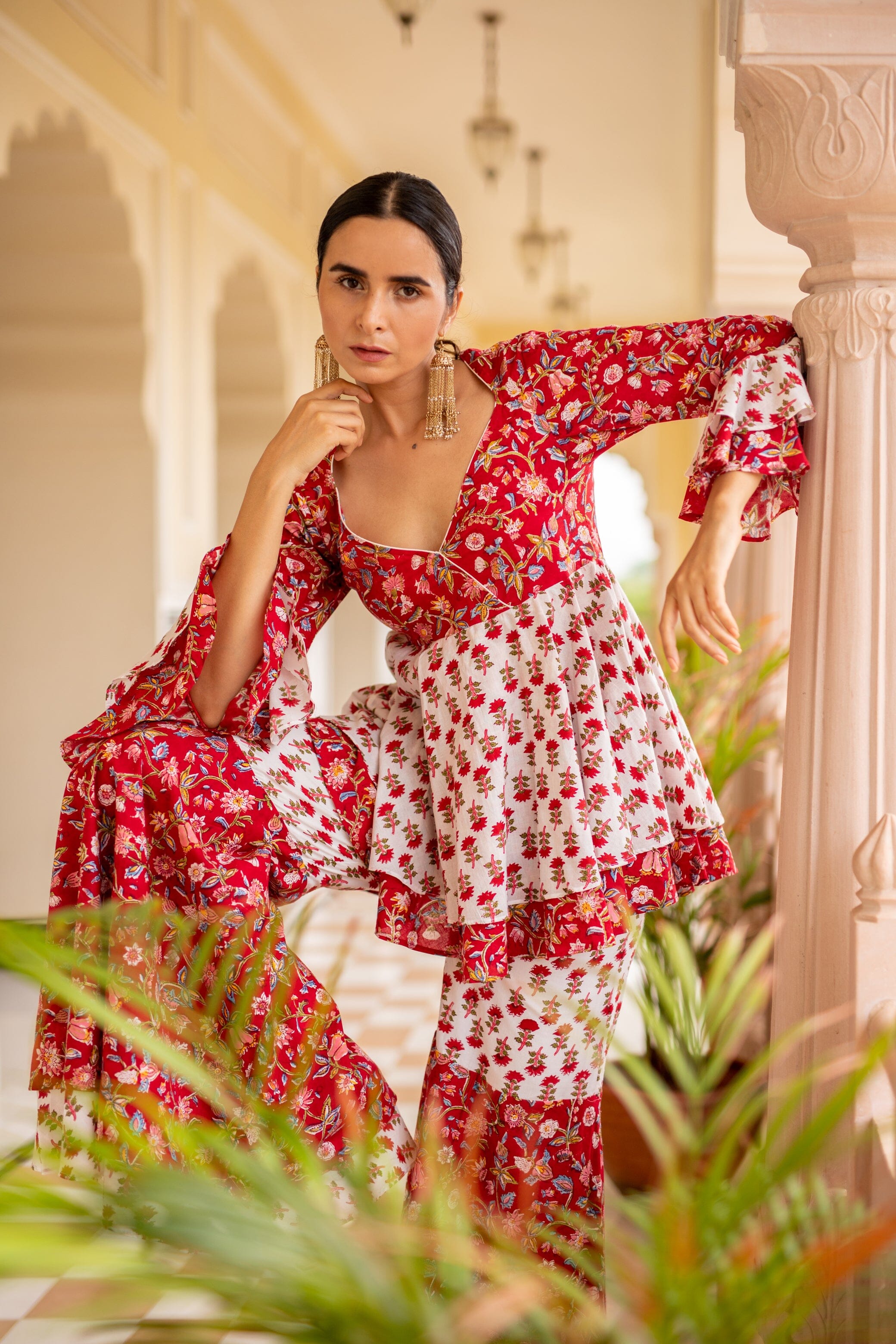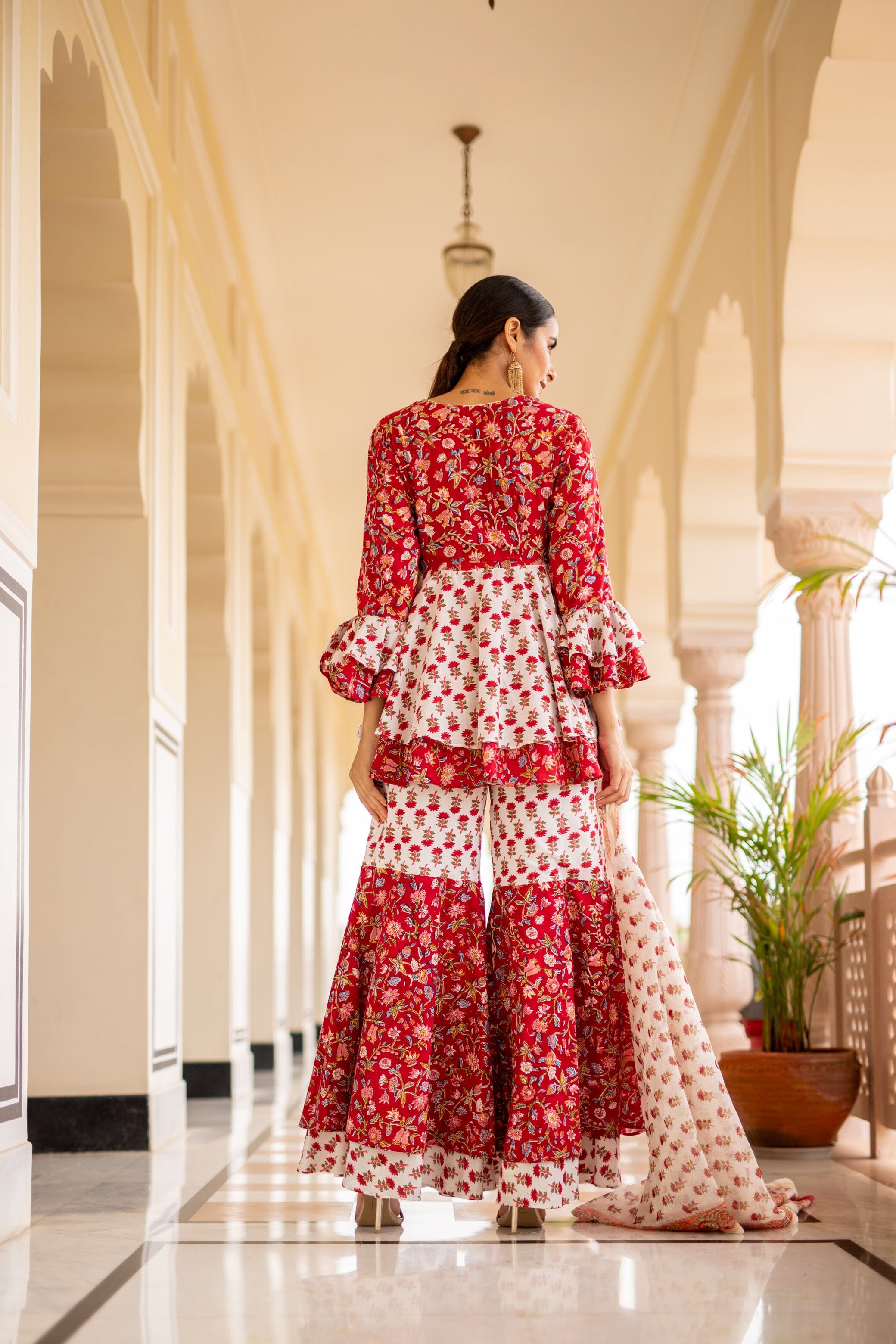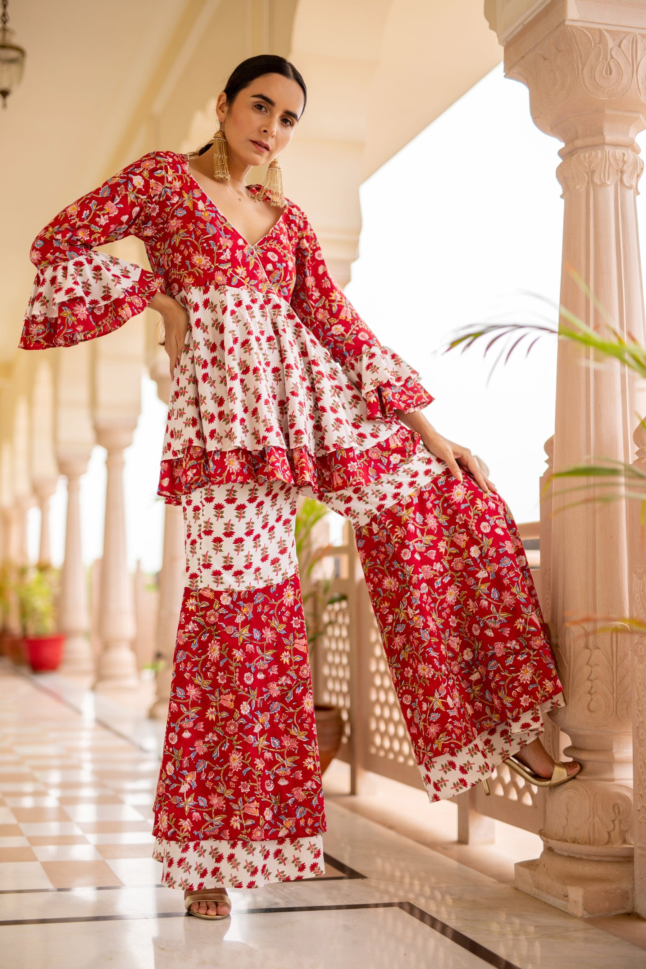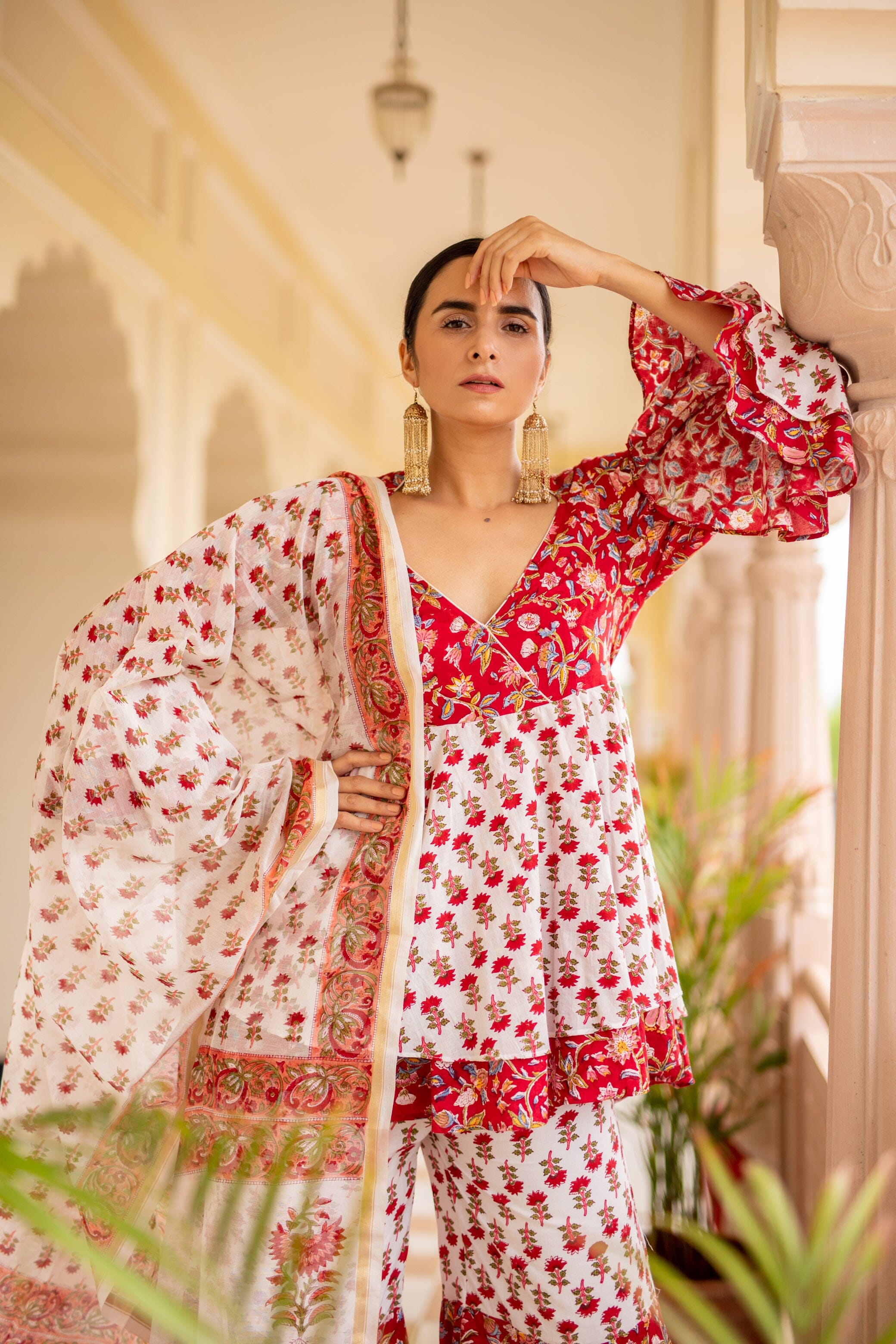 Sweetheart Neckline, Fit, And Flare Sleeves, Alined Flare, With Sharara Double Layer Pants, Chanderi Dupatta. Featuring a sweetheart neck kurta with double alined flare in cotton-blend base block print. It is paired with matching pants and a dupatta.