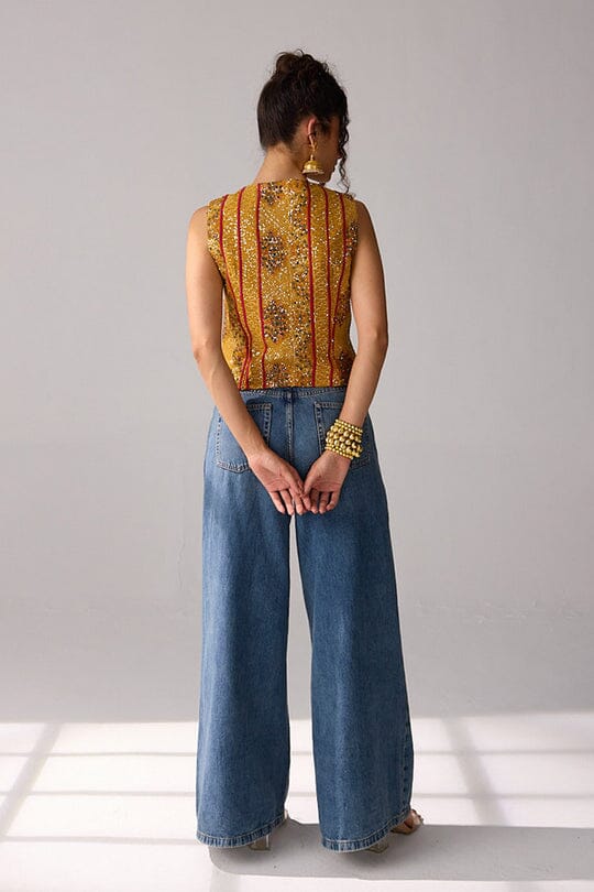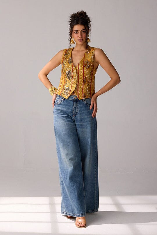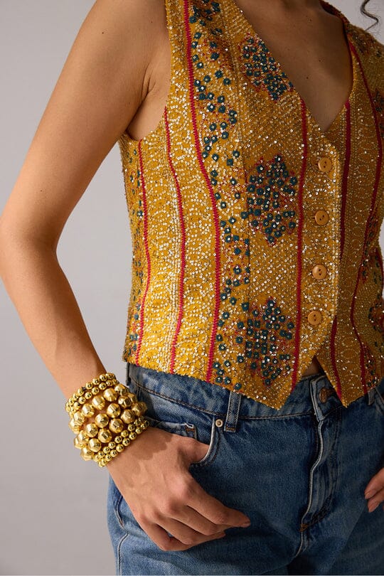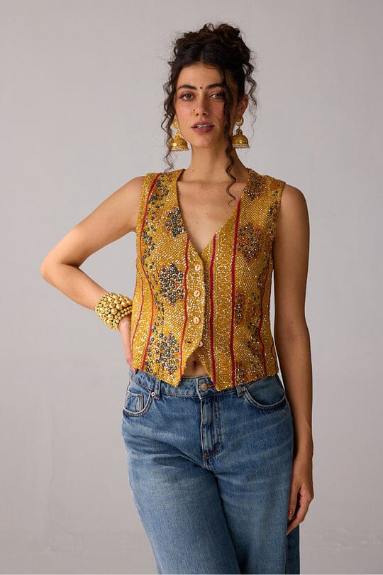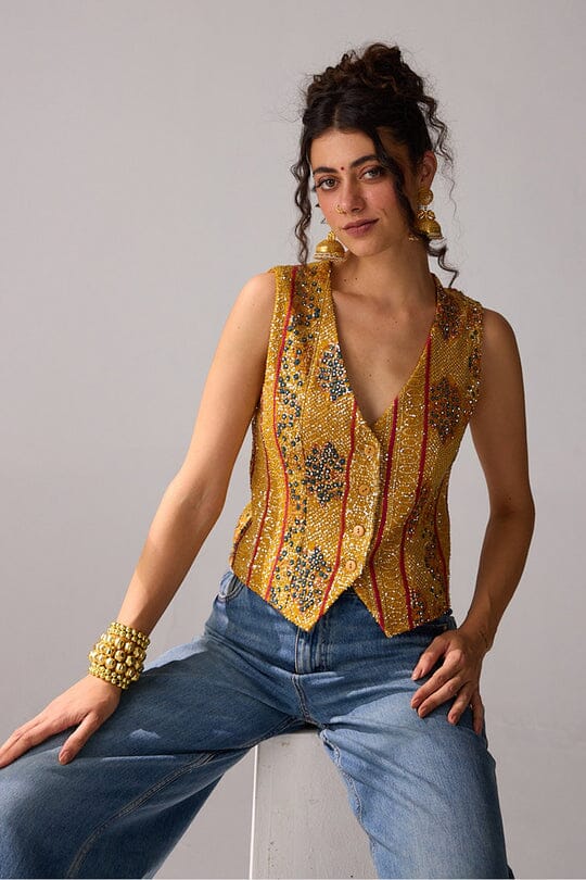 Flaunt a stunning blend of heritage and glamour with our printed Bandhni vest, featuring hand-embroidered sequin work all over.