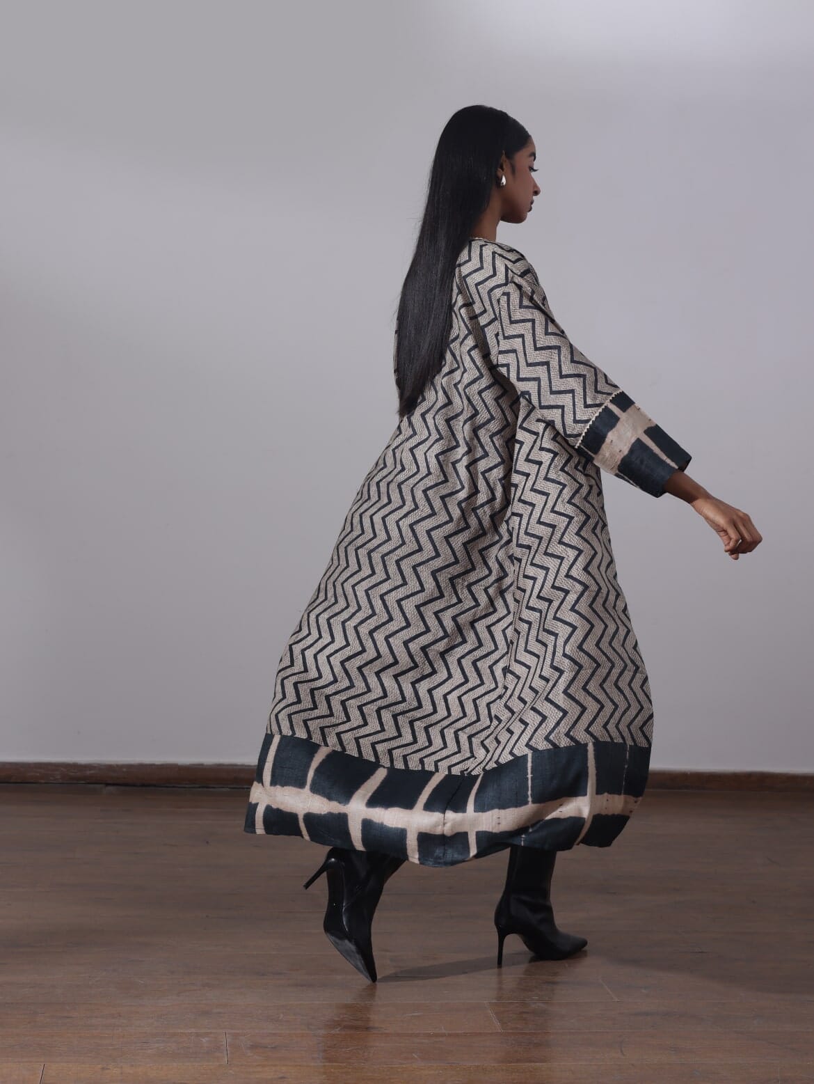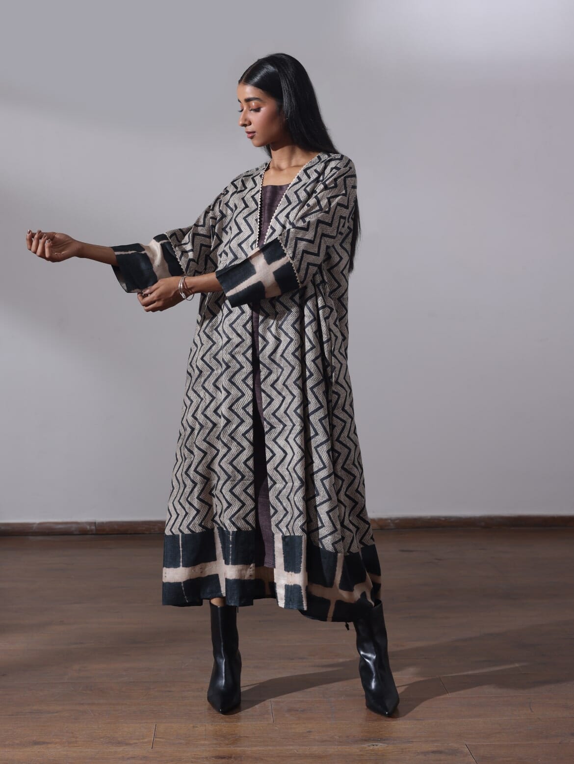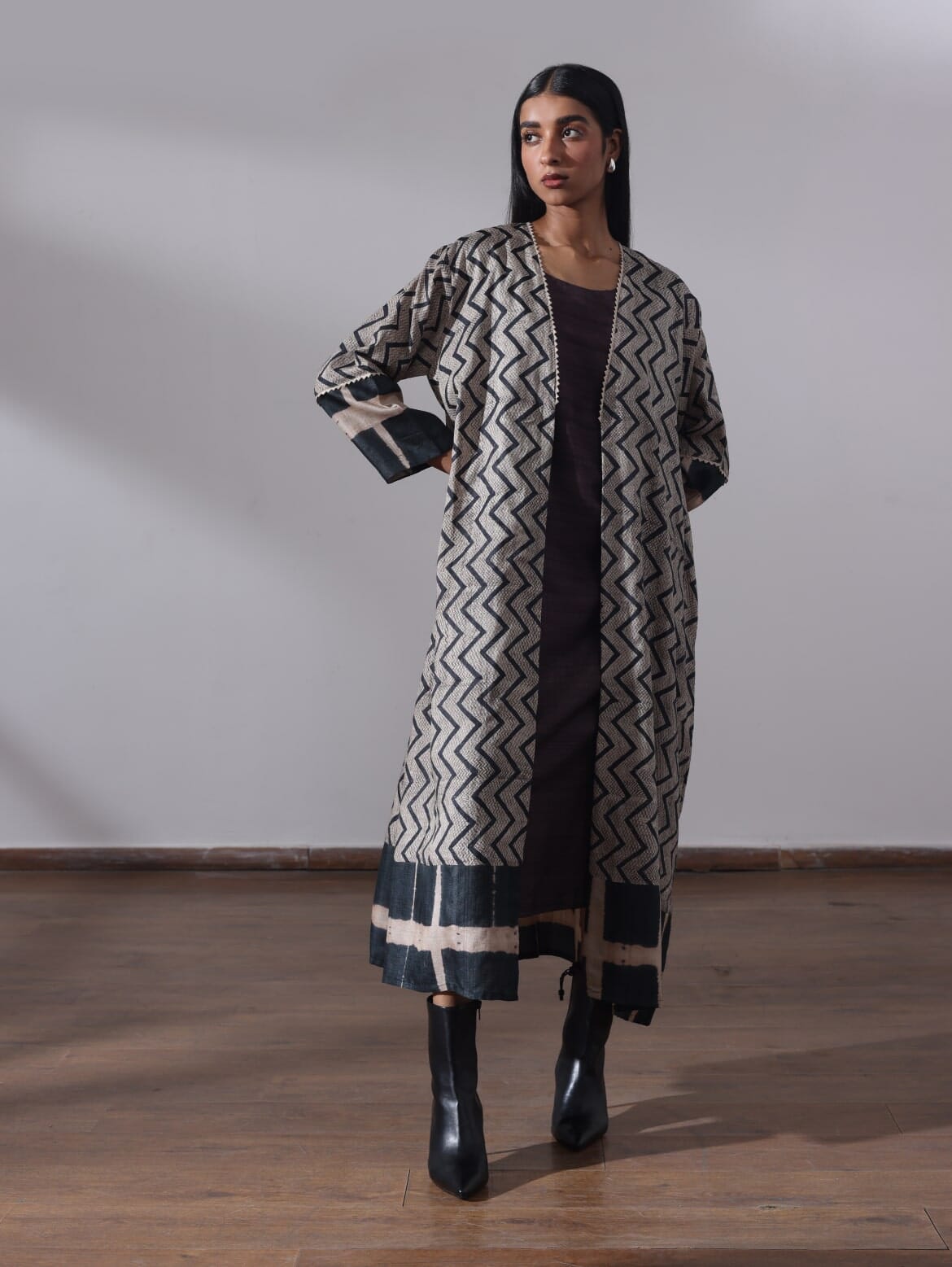 Marrying texture with movement- this tussar open jacket is an echo of summer’s touch. The natural beige base carries a gentle grain, layered with bold black block prints that add depth and character. Clamp-dyed accents in black along the sleeves and hemline lend an artisanal touch. The delicate miniature triangles trim the neckline, tying it all together like a soft breeze, perfect balmy afternoons.
