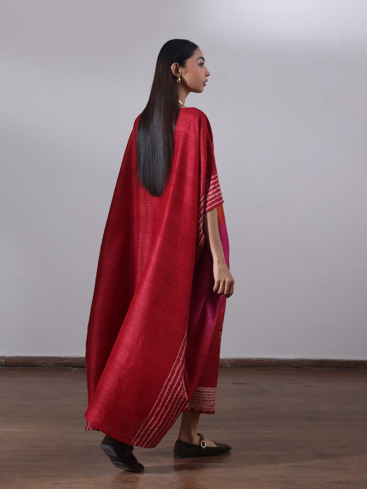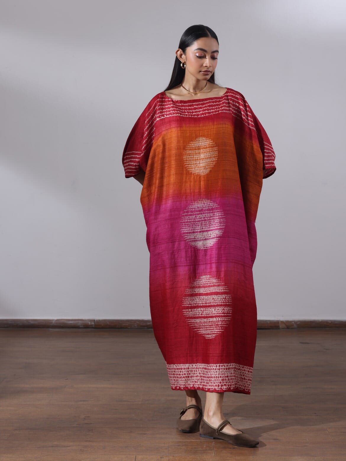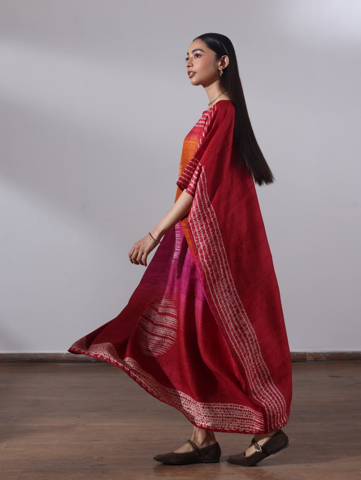A radiant blend of shades of red, orange, and pink, this kaftan is the setting sun but in luxurious silk.