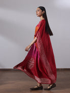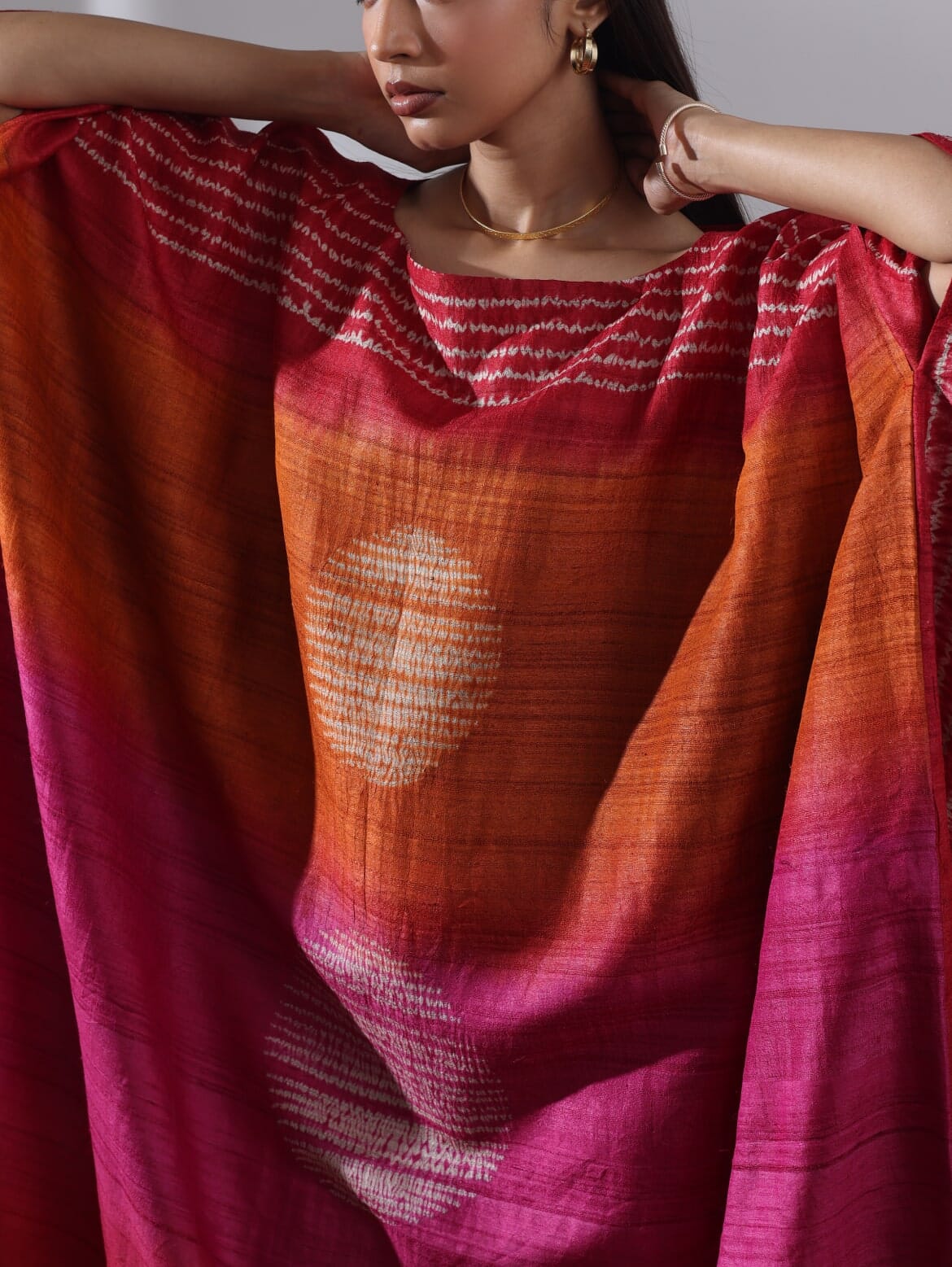 Drenched in the hues of a tropical sunset, this tussar Shibori kaftan is where craftsmanship meets modern silhouettes. Three luminous Shibori circles float across the fabric, like the sun dipping into a waning sea, while delicate detailing along the shoulders and back adds to its quiet poetry.