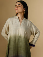 This kurta is crafted from the comfortable Matka silk, that warms the body in winters and cools during summer, and doubles as a breezy shift dress. The kurta features a flowy fishtail silhouette that is enhanced with a smooth shade dyed gradient from beige to olive green and ending in purple. This is contrasted with structure, in the collared neckline and long sleeves creating a visually harmonious versatile piece.