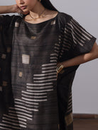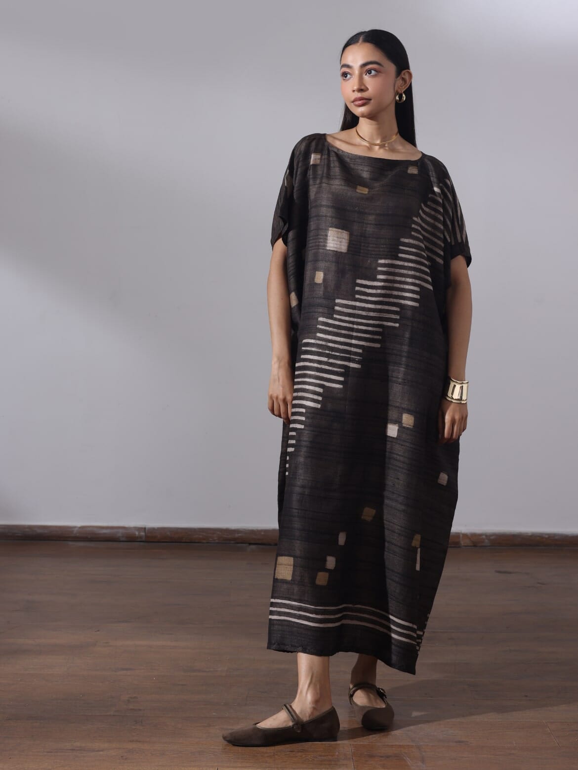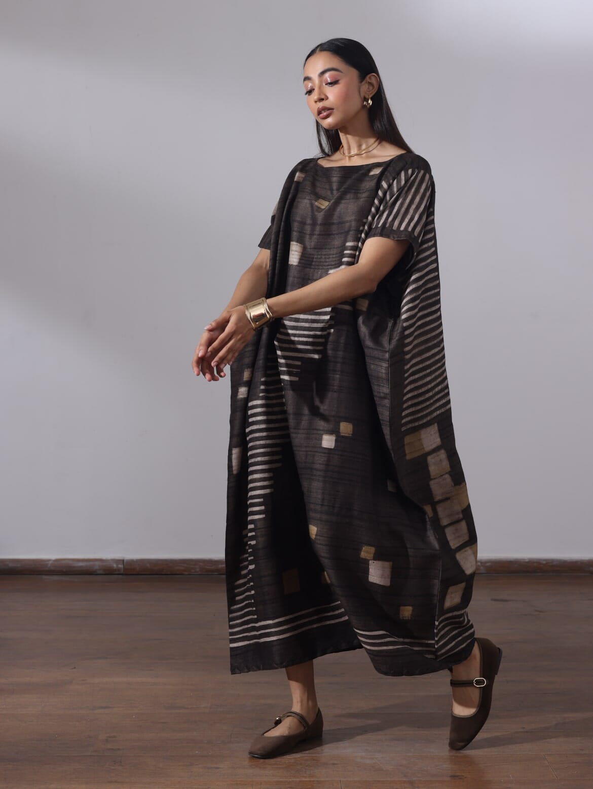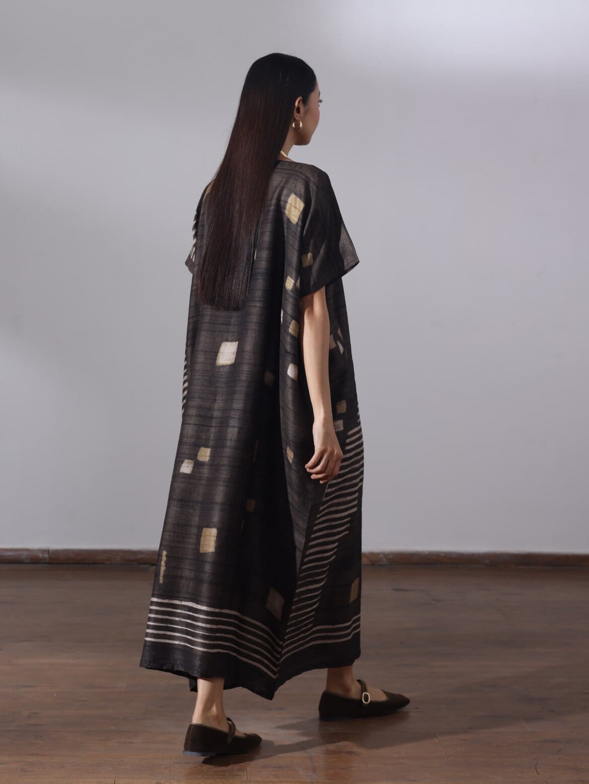 This tussar silk kaftan translates traditional batik techniques into contemporary minimalism. The rich umber background features delicate horizontal slubs that create natural texture, while hand-applied resist-dye patterns form a deliberate composition of ivory lines and ochre squares.