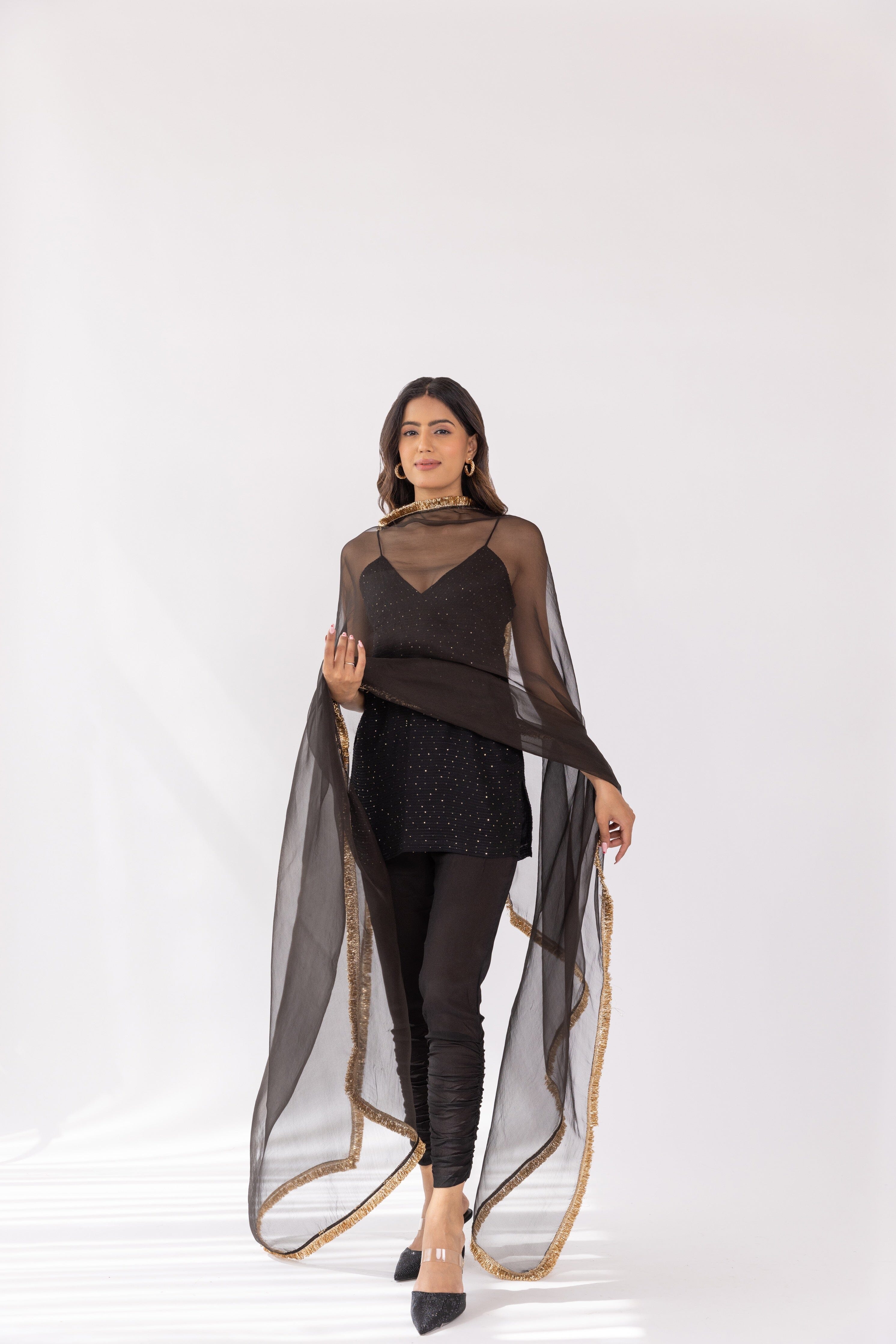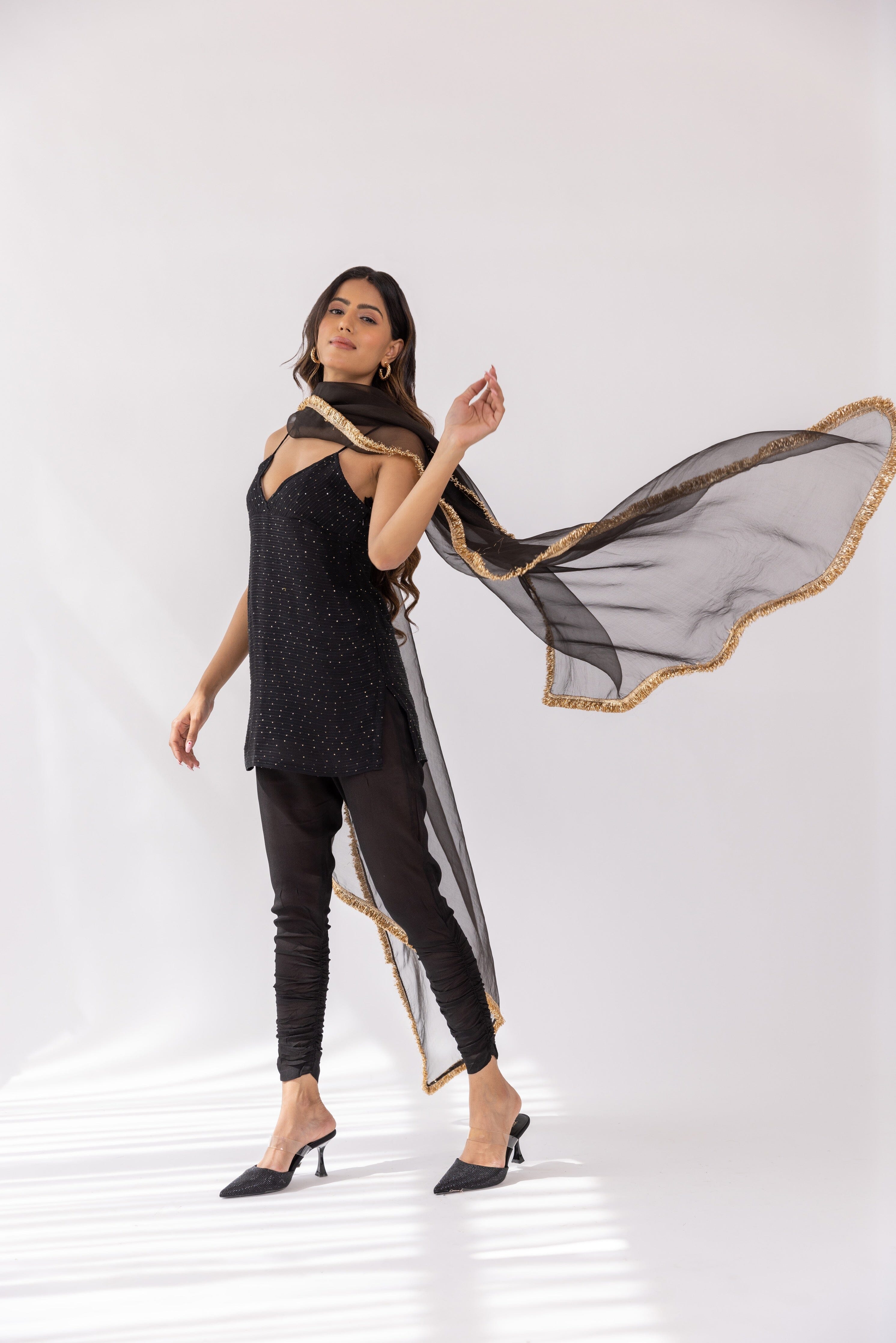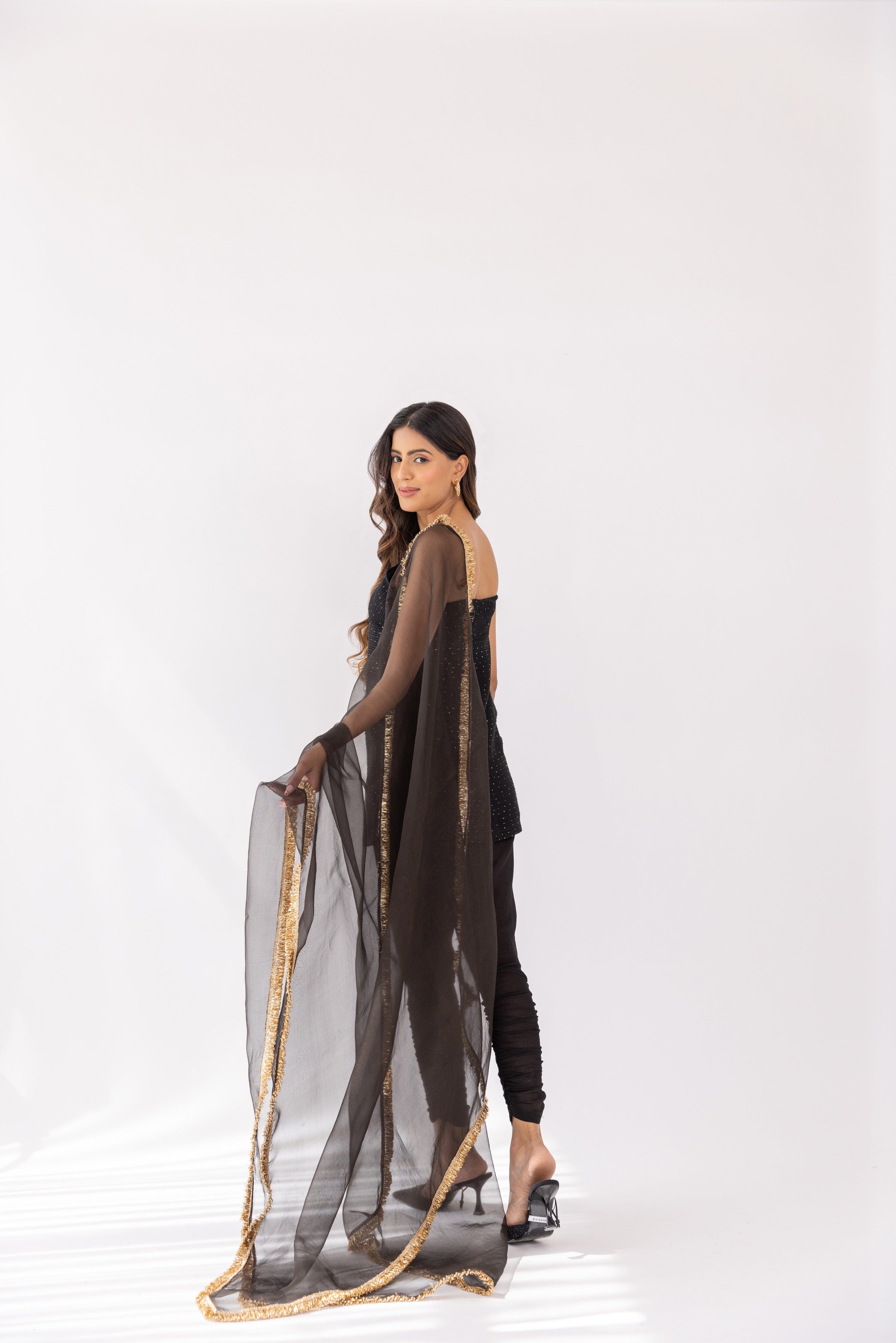 Featuring an elegant black strappy embroidered kurta set in gorg-fabric, complete with solid chuddidar and organza dupatta accented with lavish lurex lace edging - this timeless style of ethnic wear is sure to make a statement and refine traditional fashion. Crafted from high-quality materials, this set will make you feel confident and luxurious. Its intricate detailing and quality materials make it a perfect pick for both formal events and everyday styling.