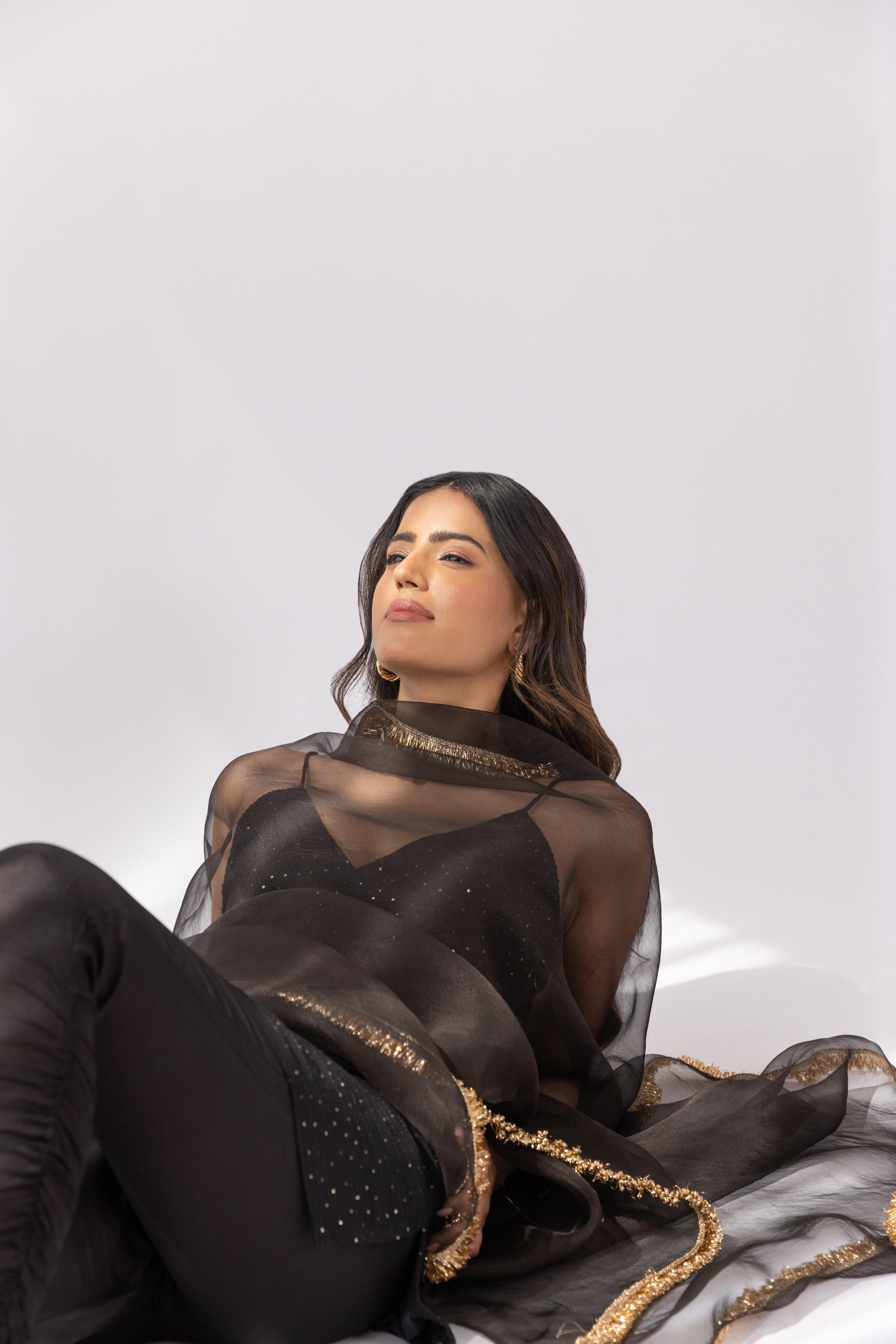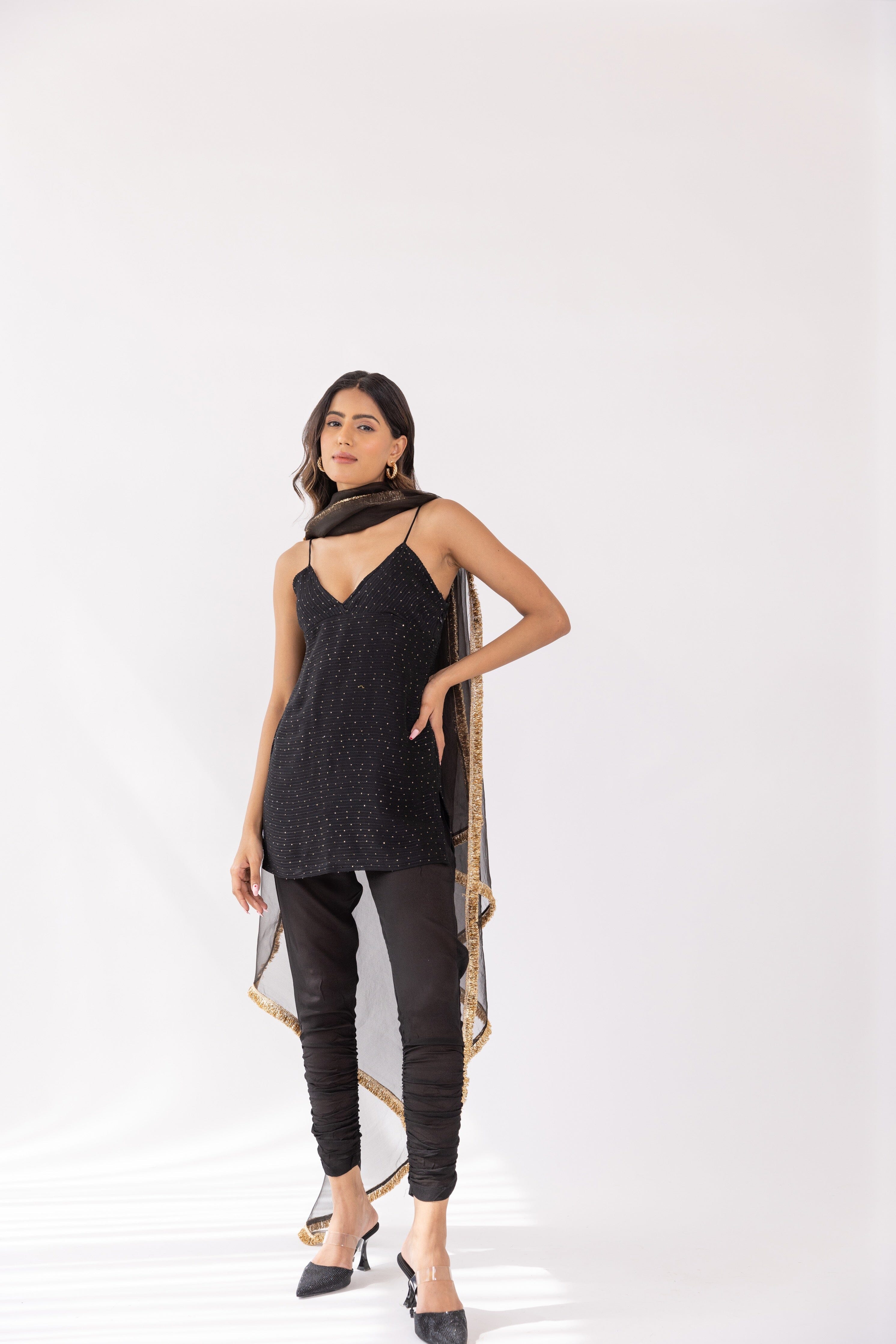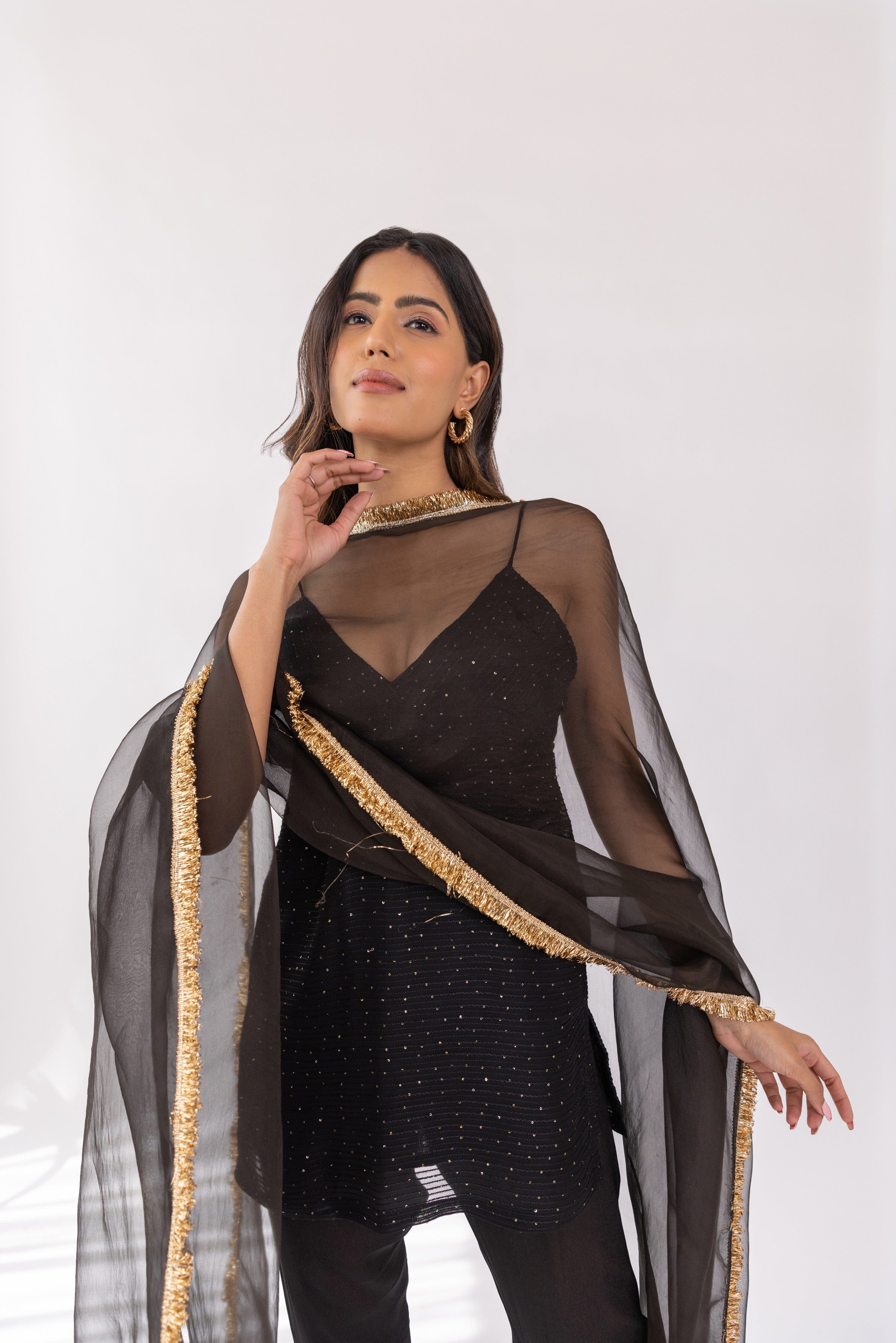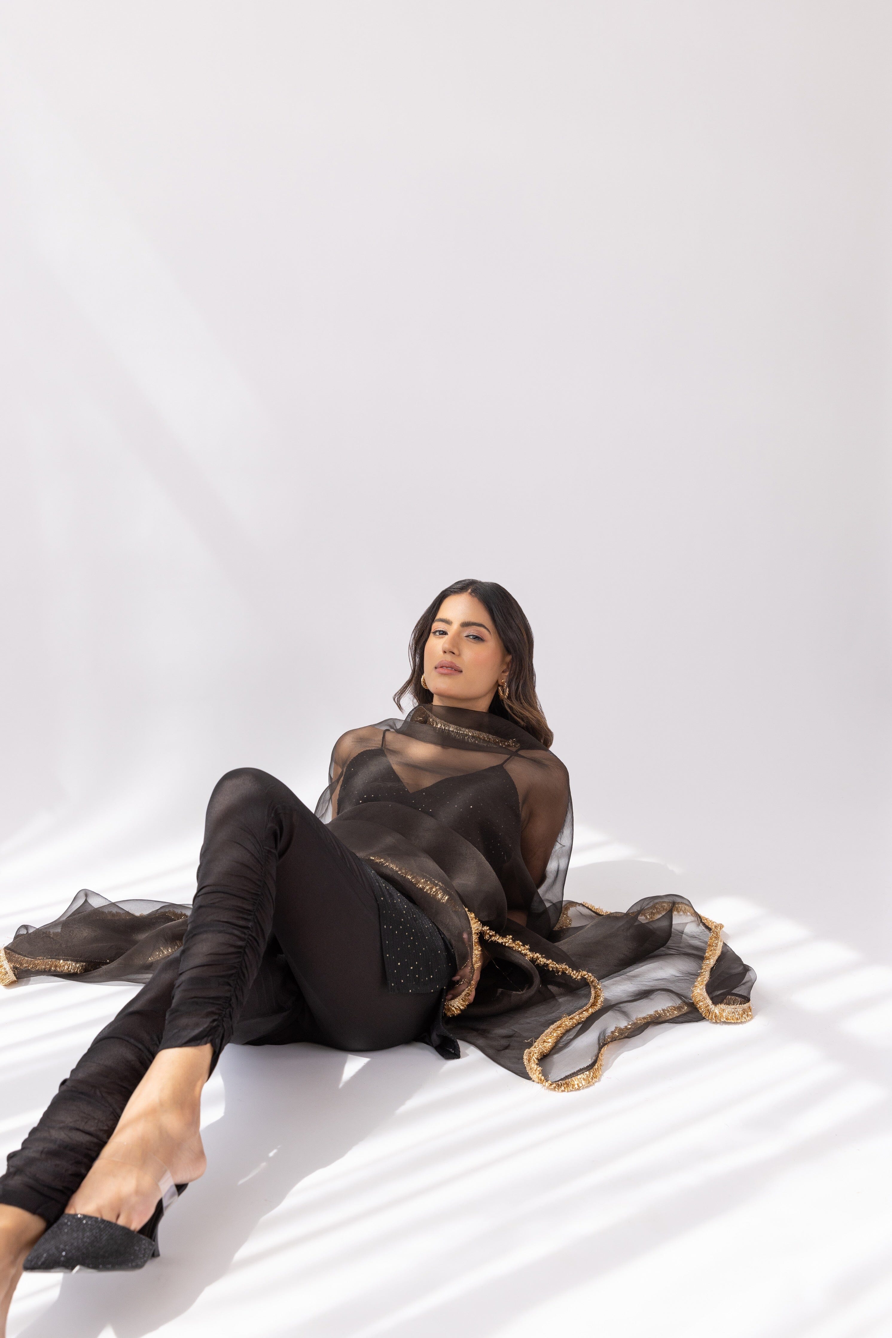 Featuring an elegant black strappy embroidered kurta set in gorg-fabric, complete with solid chuddidar and organza dupatta accented with lavish lurex lace edging - this timeless style of ethnic wear is sure to make a statement and refine traditional fashion. Crafted from high-quality materials, this set will make you feel confident and luxurious. Its intricate detailing and quality materials make it a perfect pick for both formal events and everyday styling.