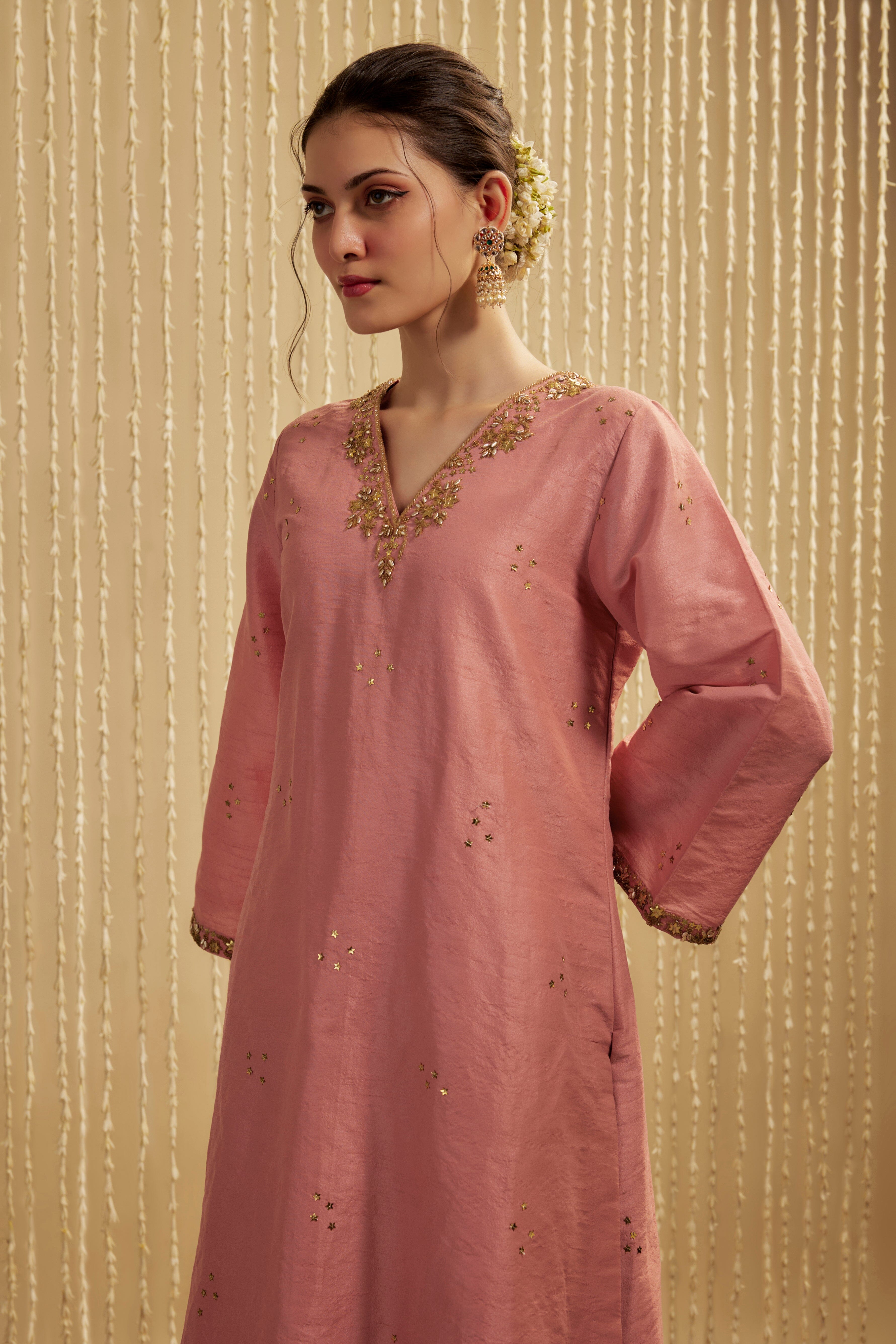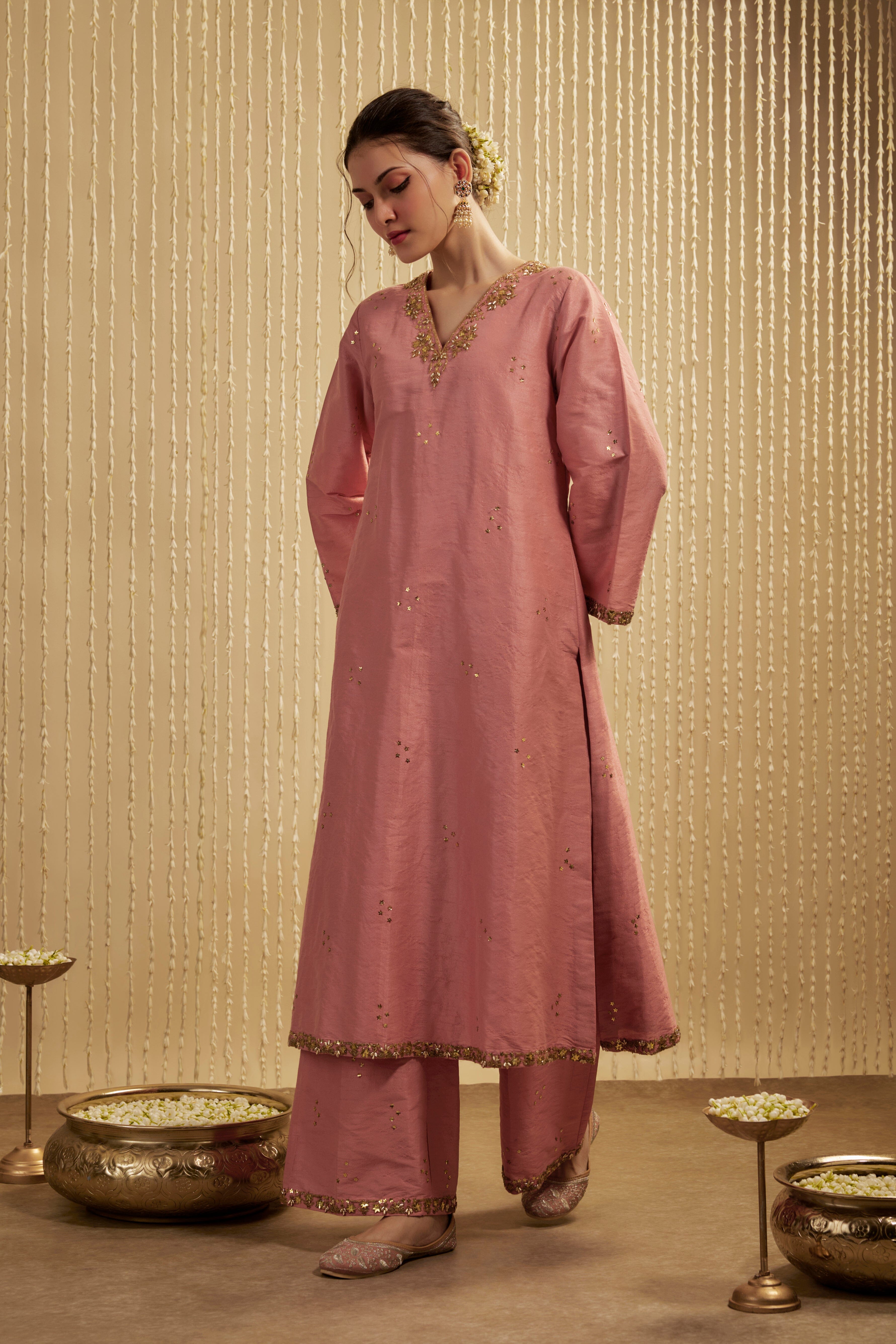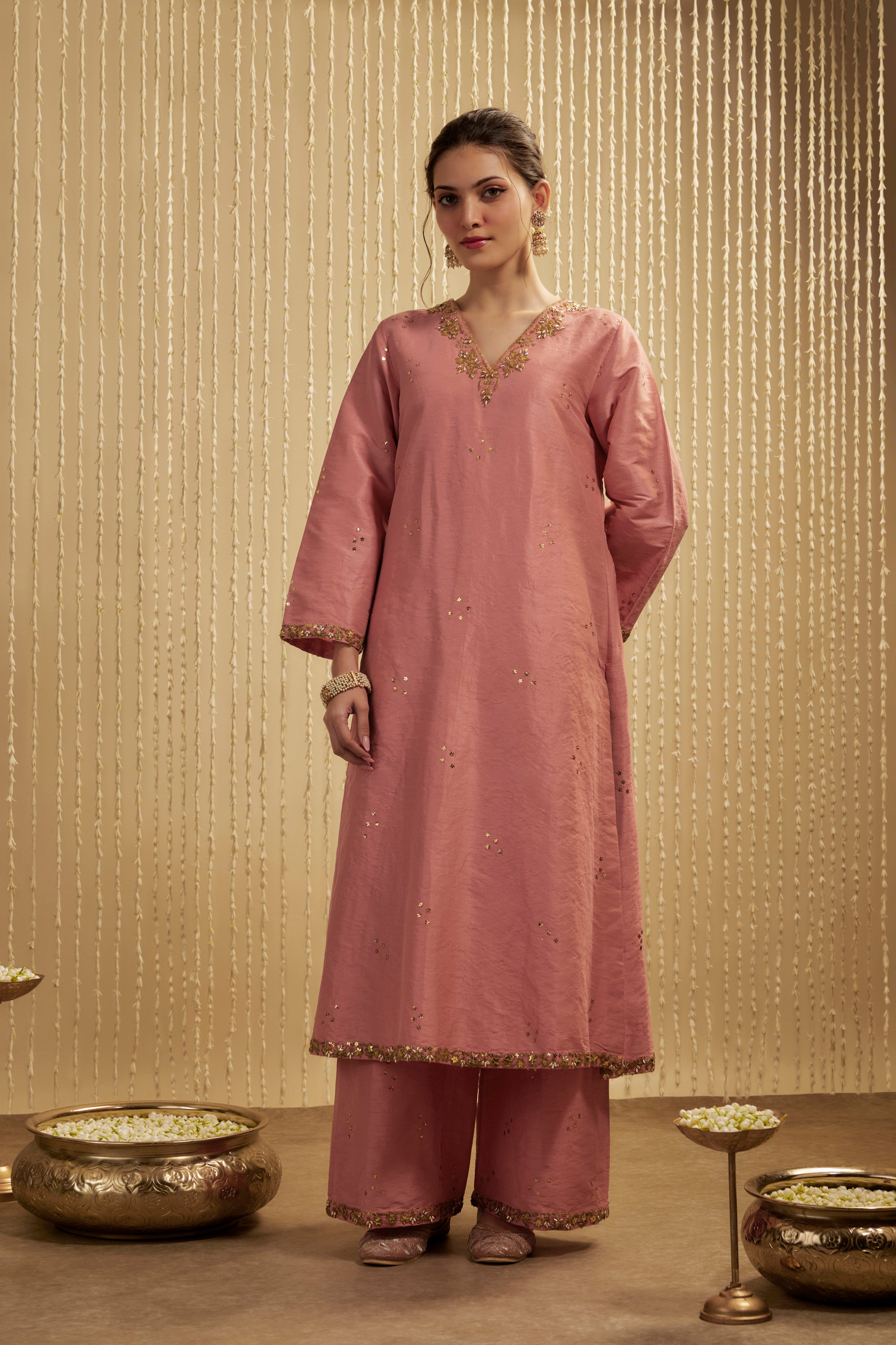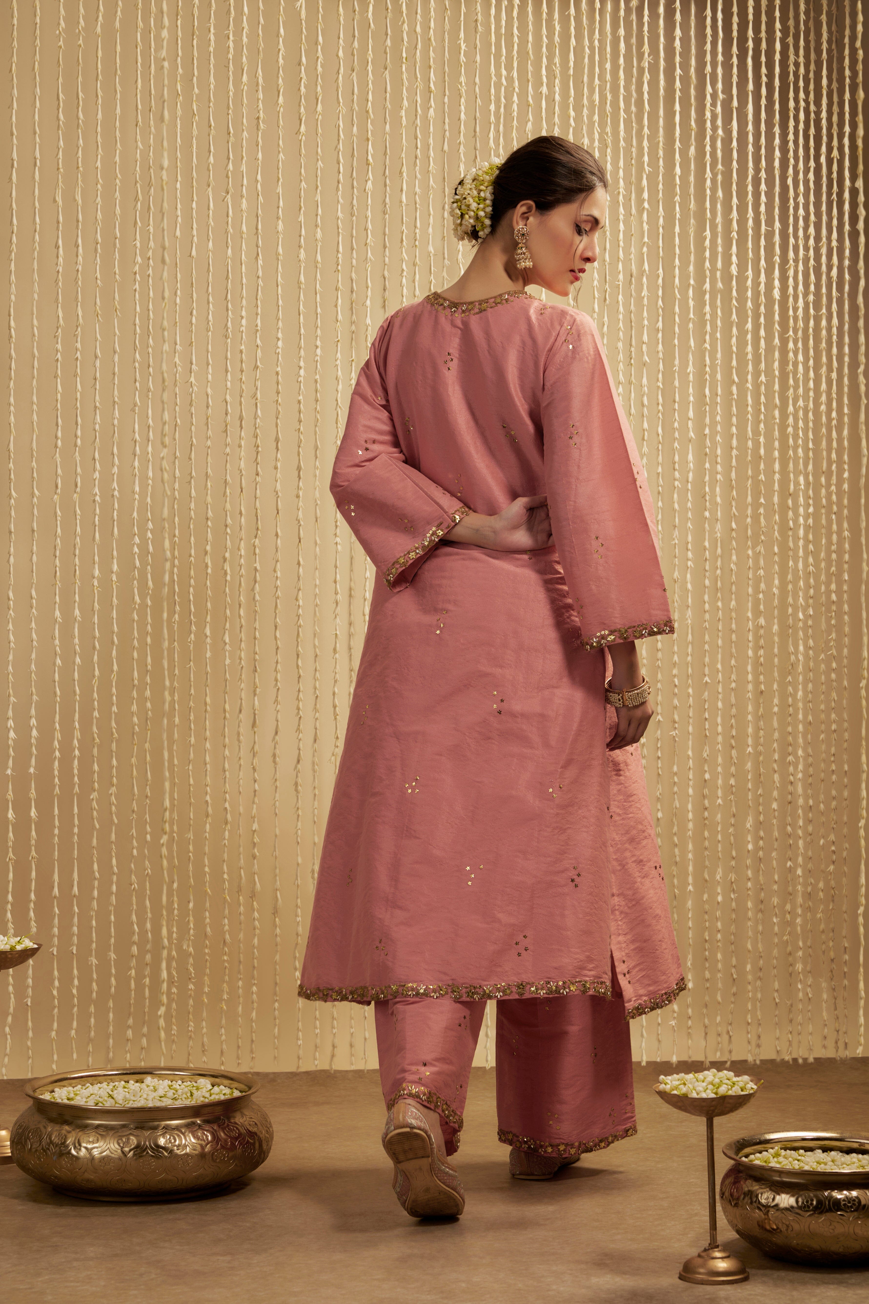 This coral pink kurta-pants set in dupion silk exudes elegance with its delicate embroidery and formal detailing. Dress it up or down for wedding functions, poojas, or day events, offering the perfect blend of comfort and sophistication. The rich color and luxurious fabric make it a standout choice for any occasion, ensuring you look stylish and feel at ease.