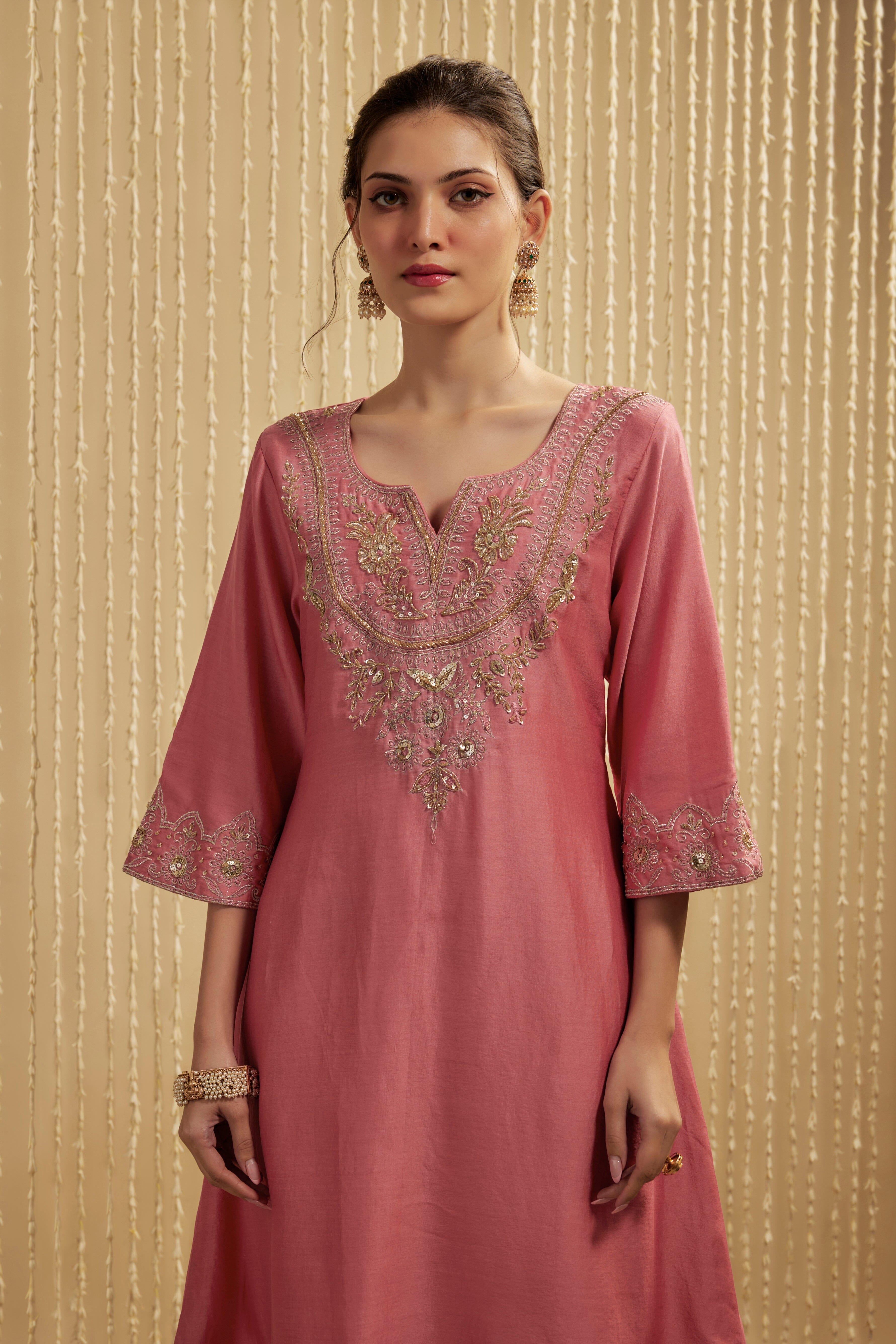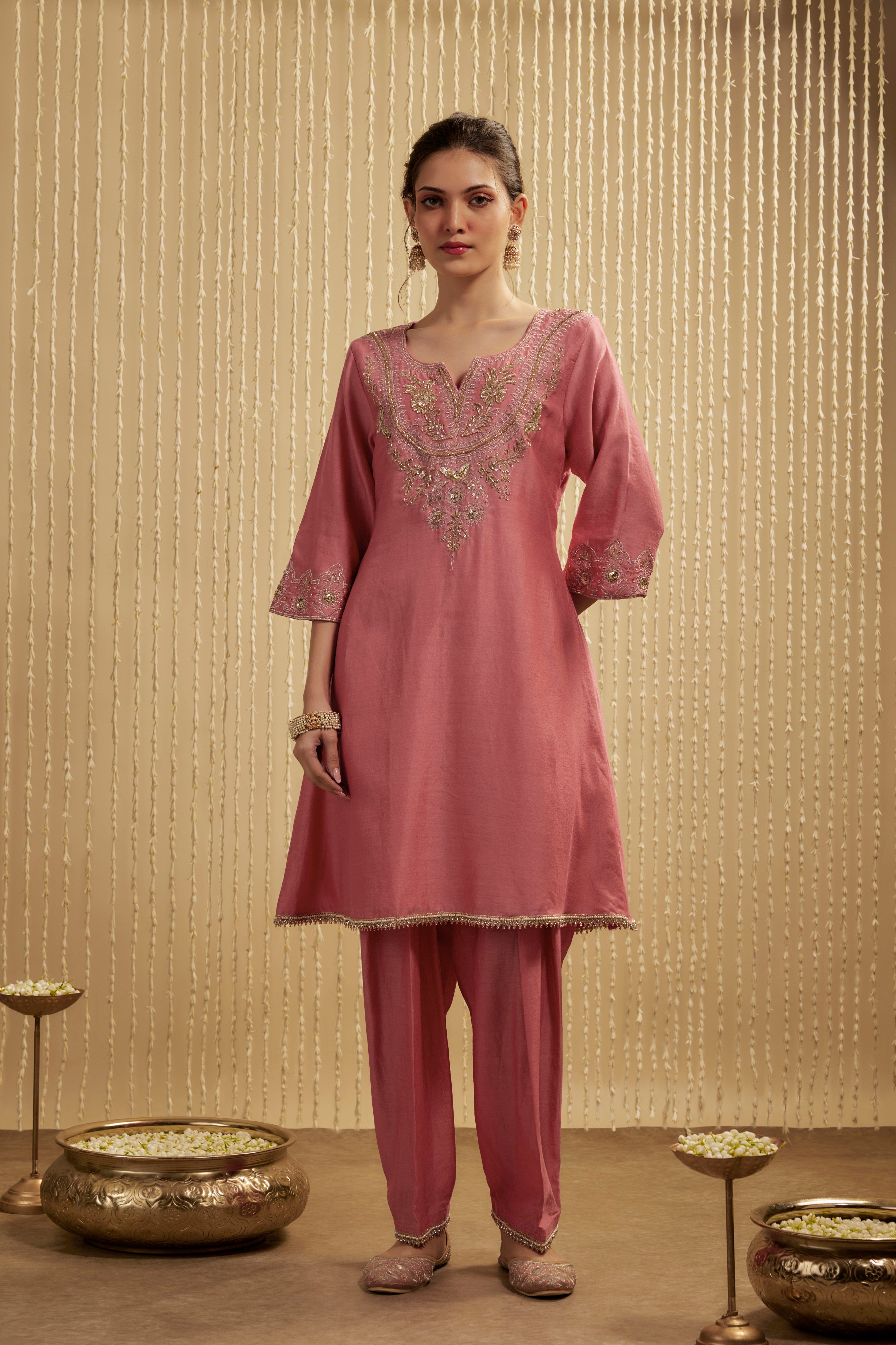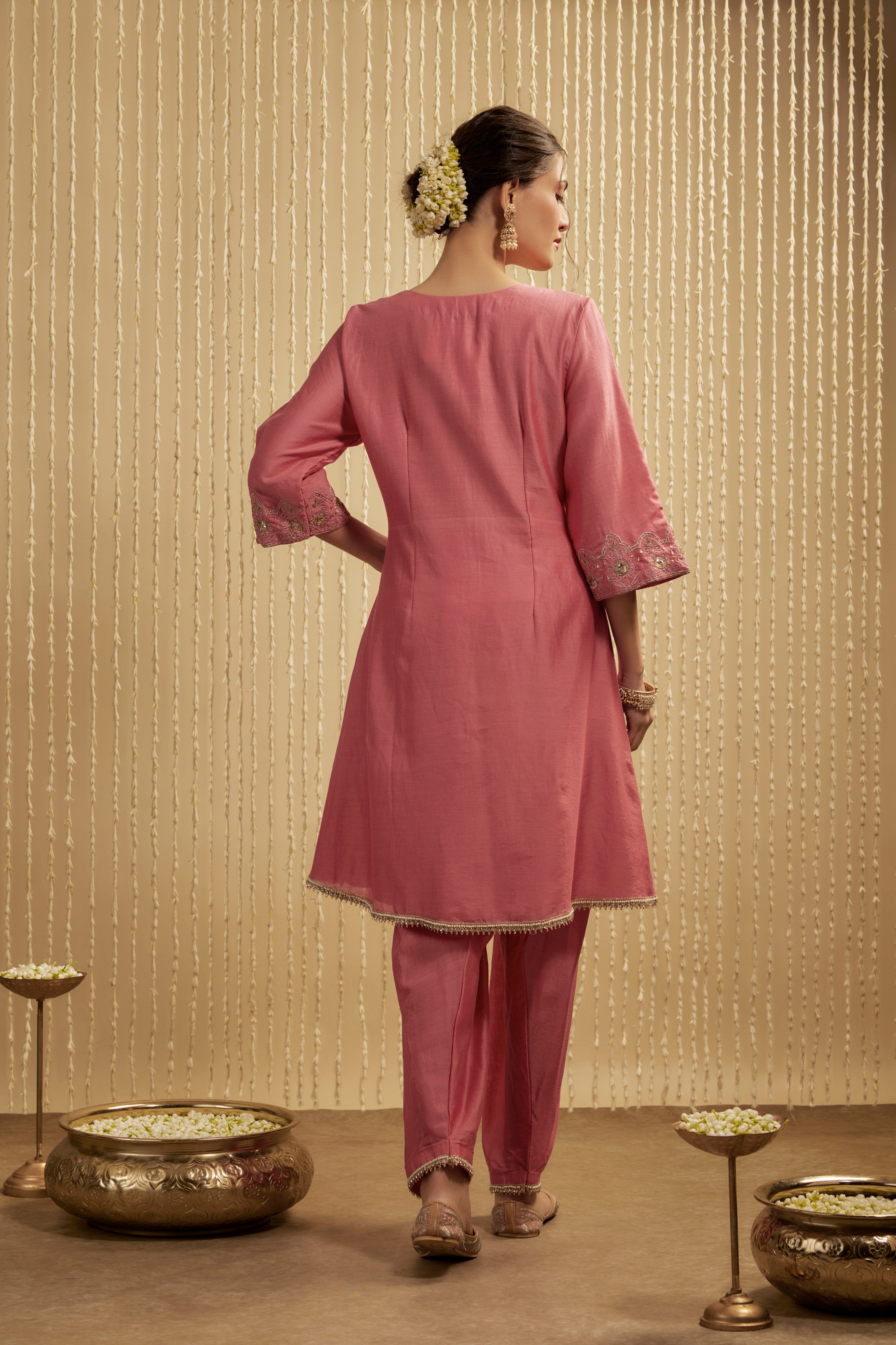 Coral Pink Silk Chanderi Short Kurta Pants Set