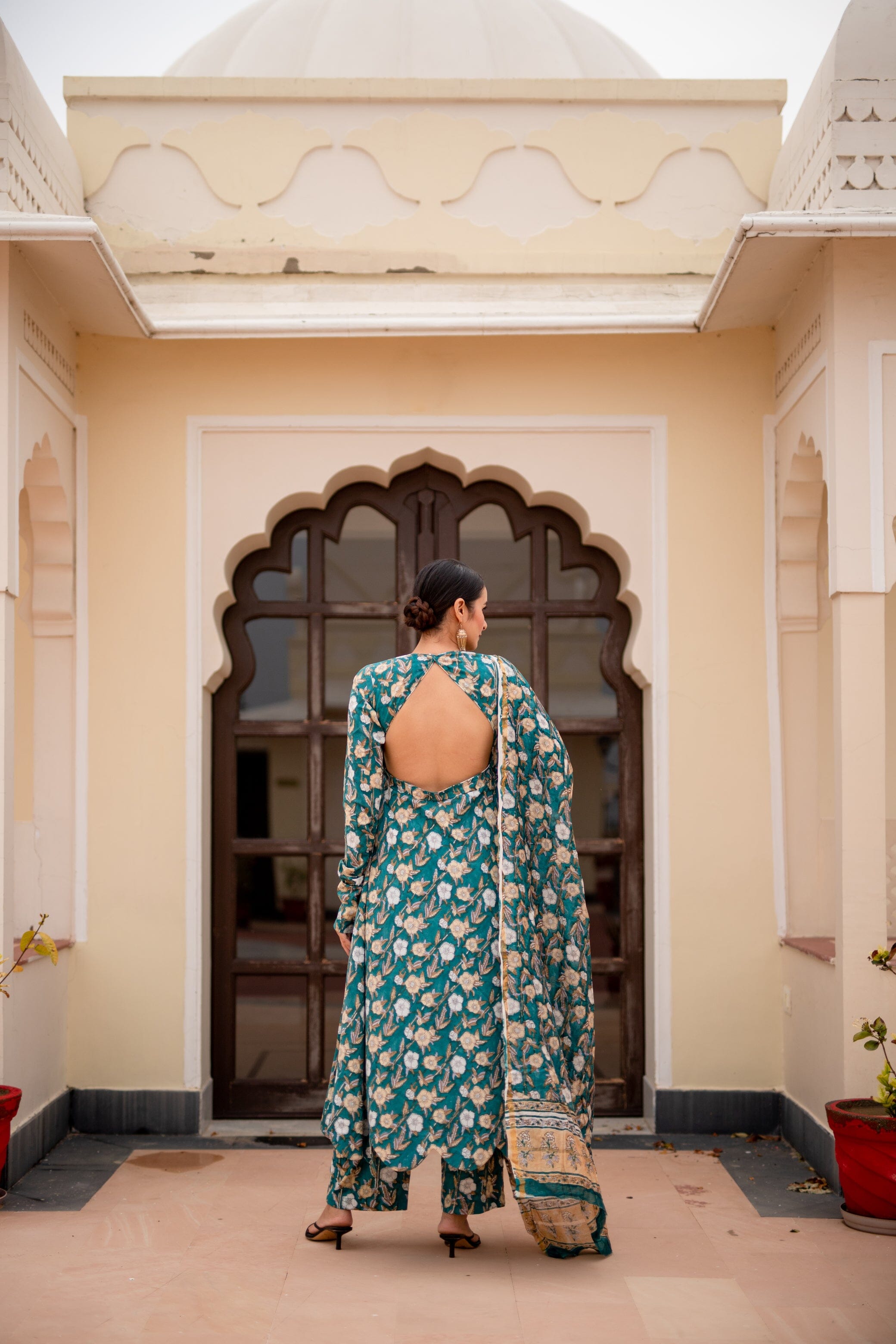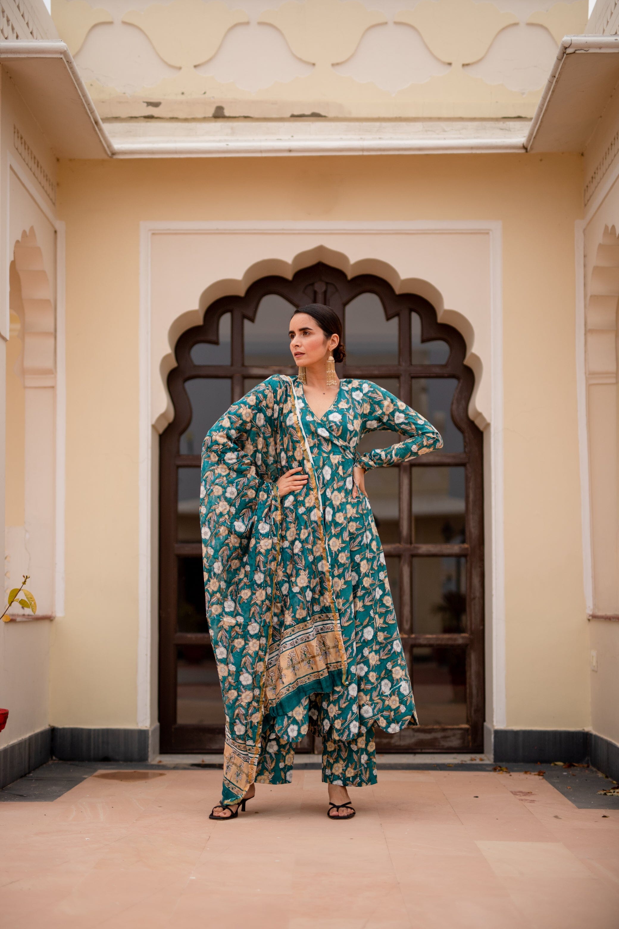 V Neck,Chudidaar Sleeves Vide Deep Back ,Bottom Scallup,Side Concelled Zipper, Chanderi DupattaFeaturing a v neck kurta in cotton blend base block print. It is paired with matching pants and dupatta. Delivery time 15 to 20 days
