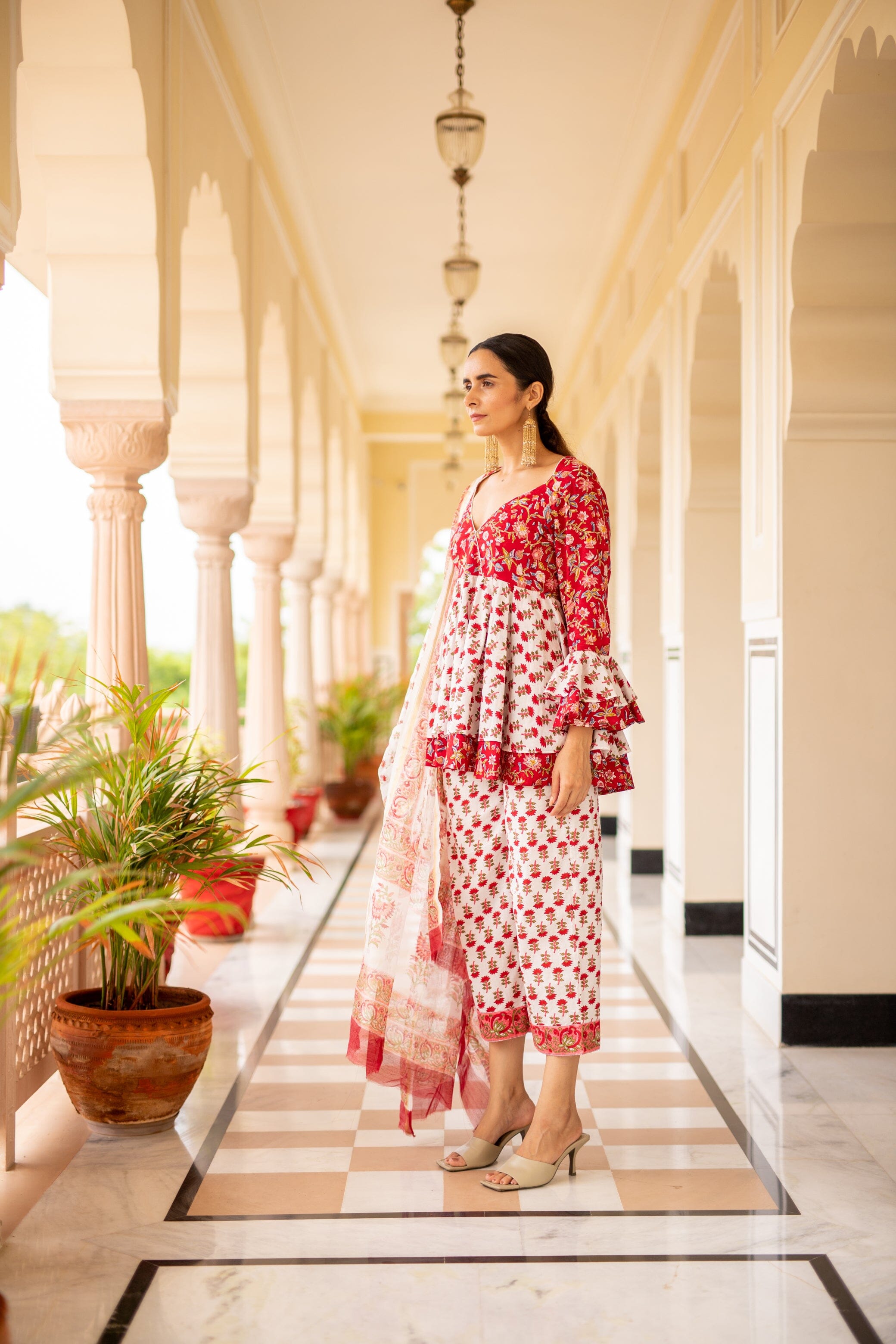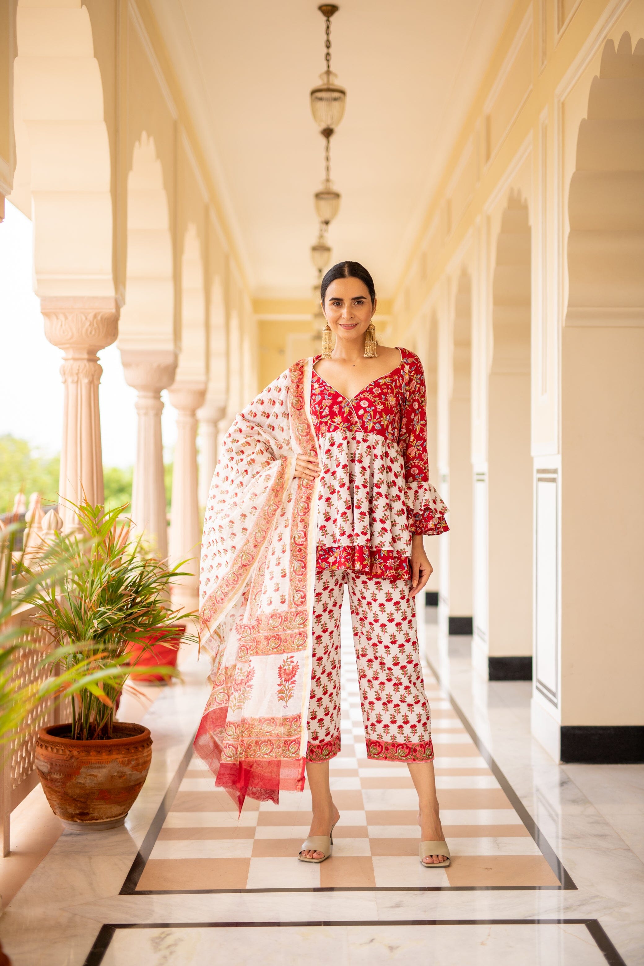Sweetheart Neckline, Fit, And Flare Sleeves, Alined Double Flare, With Straight Fit Pants, Chanderi Dupatta. Featuring a sweetheart neck kurta with double alined flare in cotton-blend base block print. It is paired with matching pants and a dupatta.