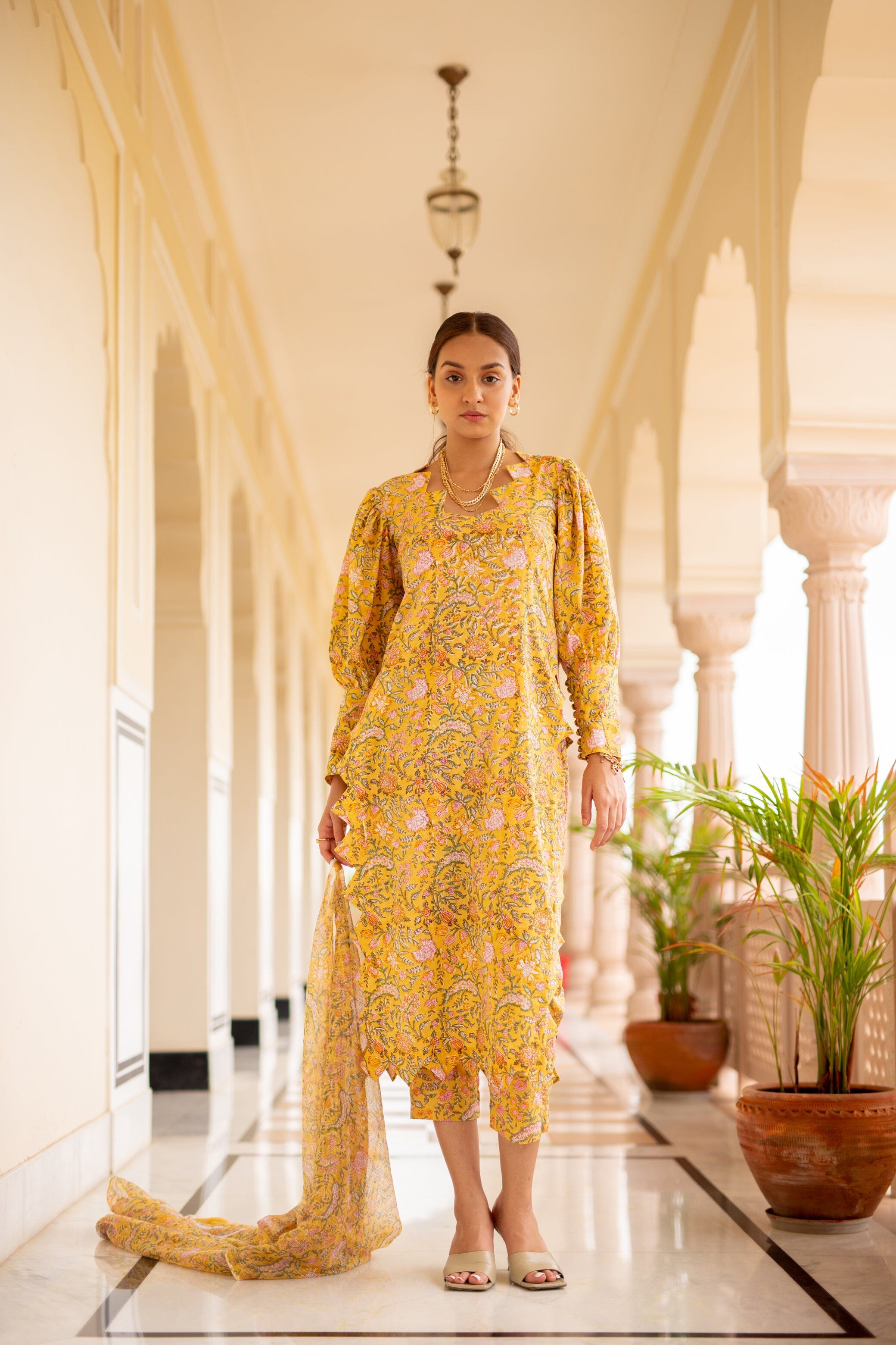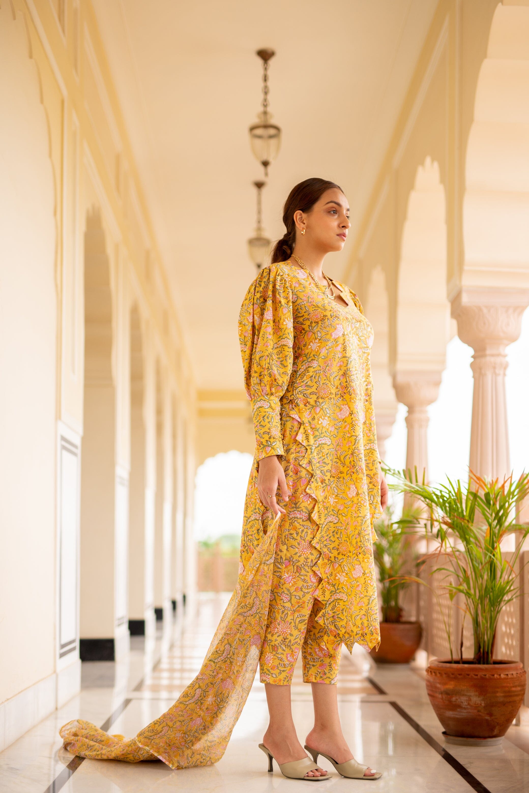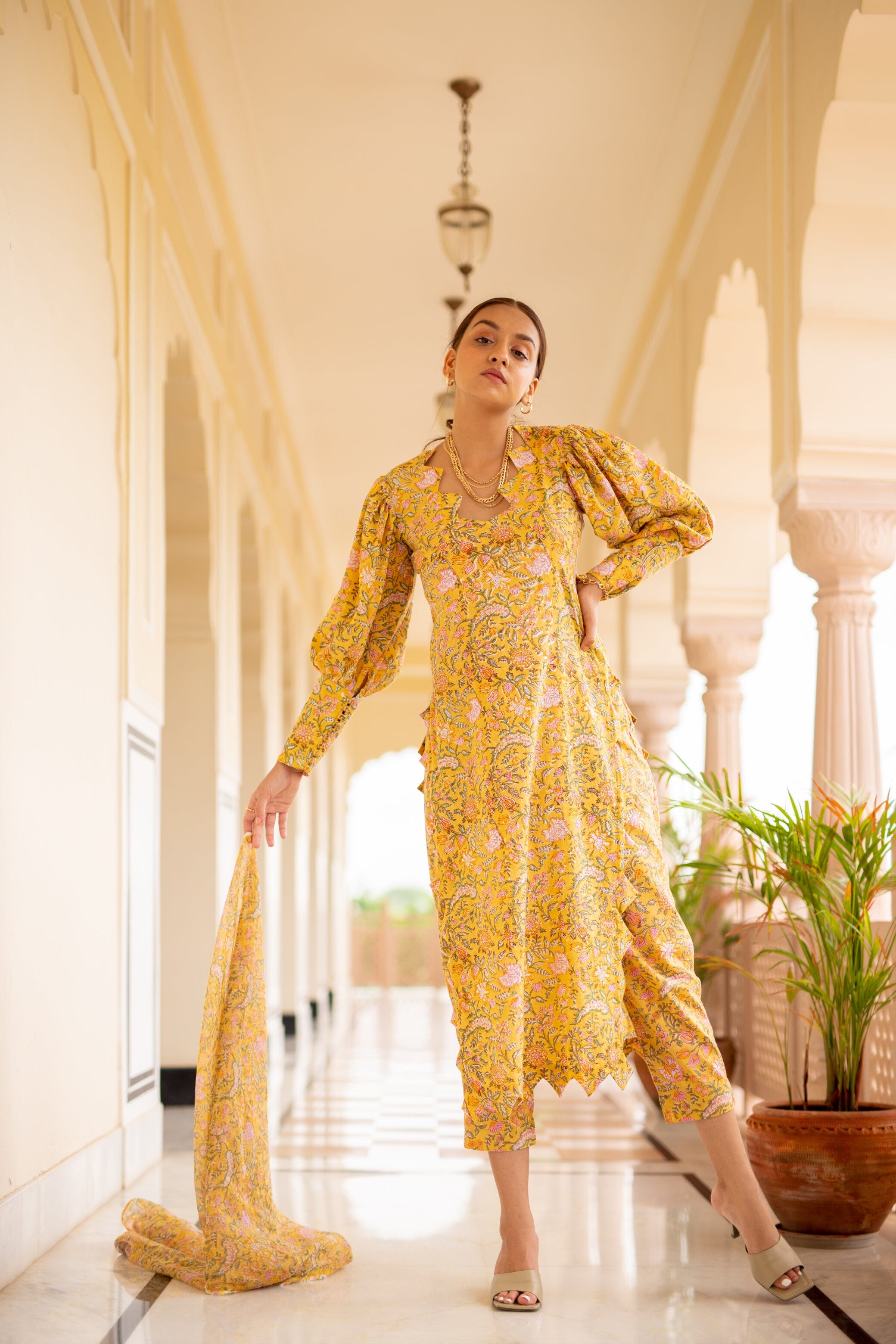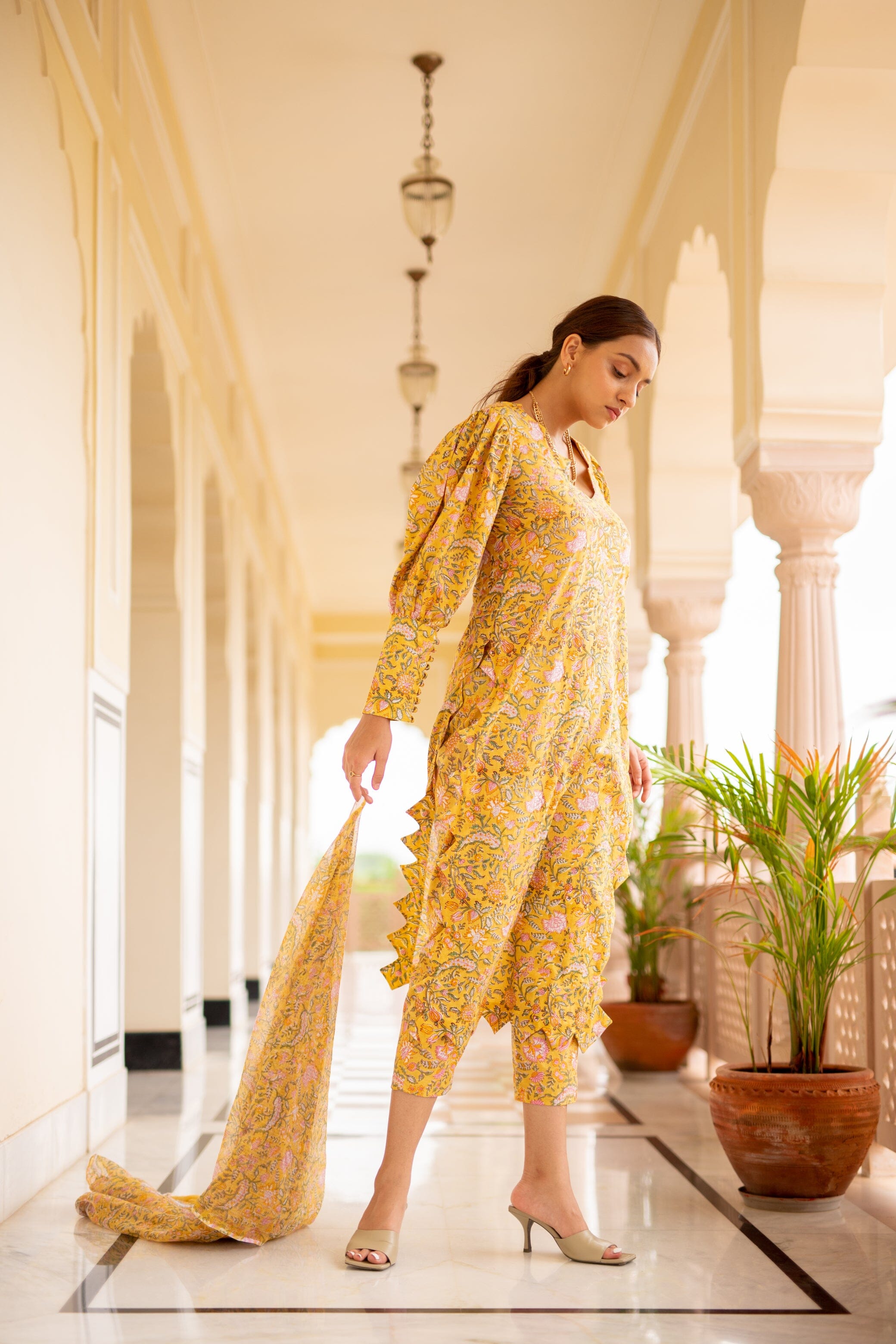 Mid Length Kurti With Triangular Scalloped Edge, Volumed Full Sleeves With Long Cuffs Buttoned Down, Side Slit, Slim Fit Pants. Featuring a yellow Kurti detailed with scalloped edging, paired with matching pants and a dupatta.