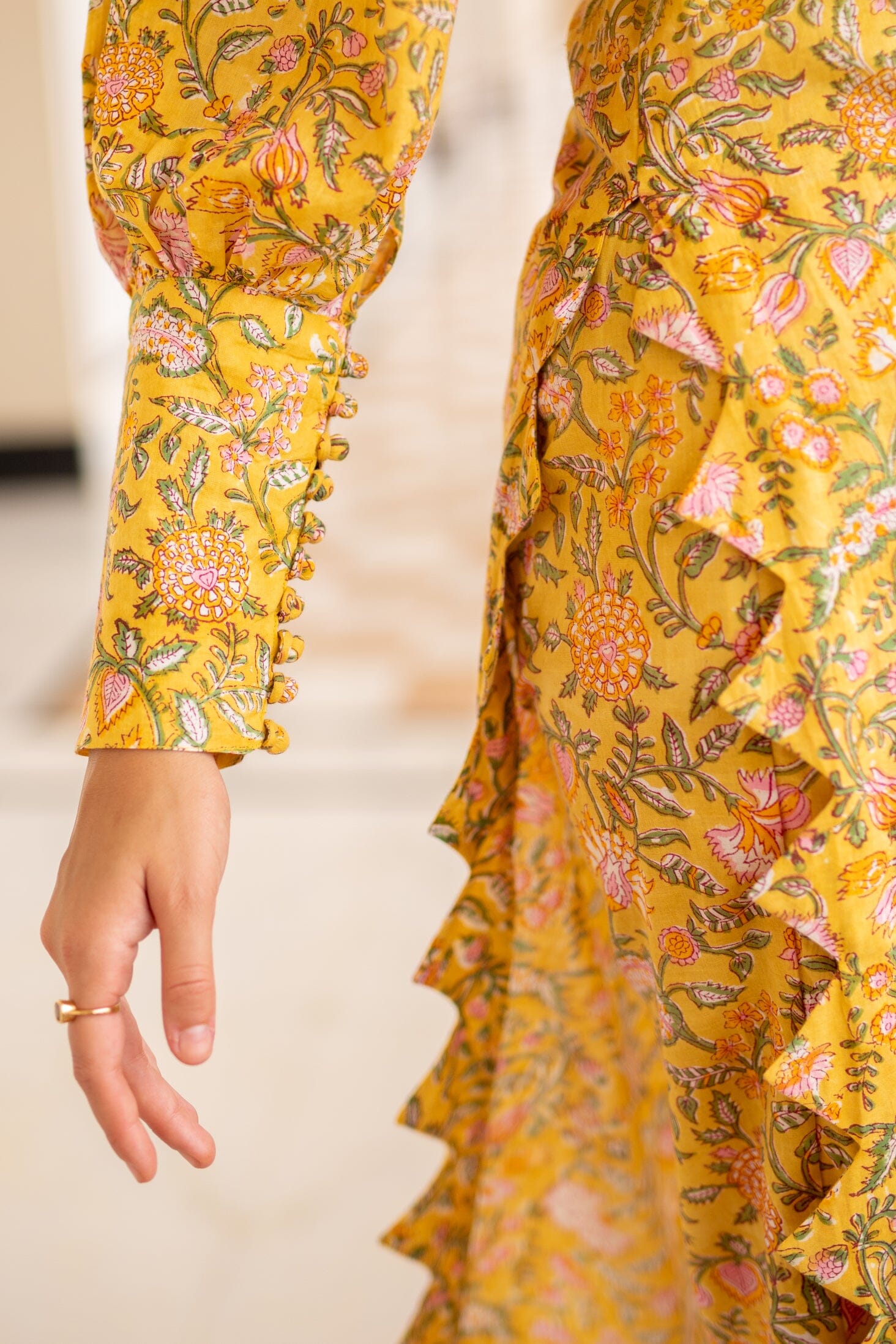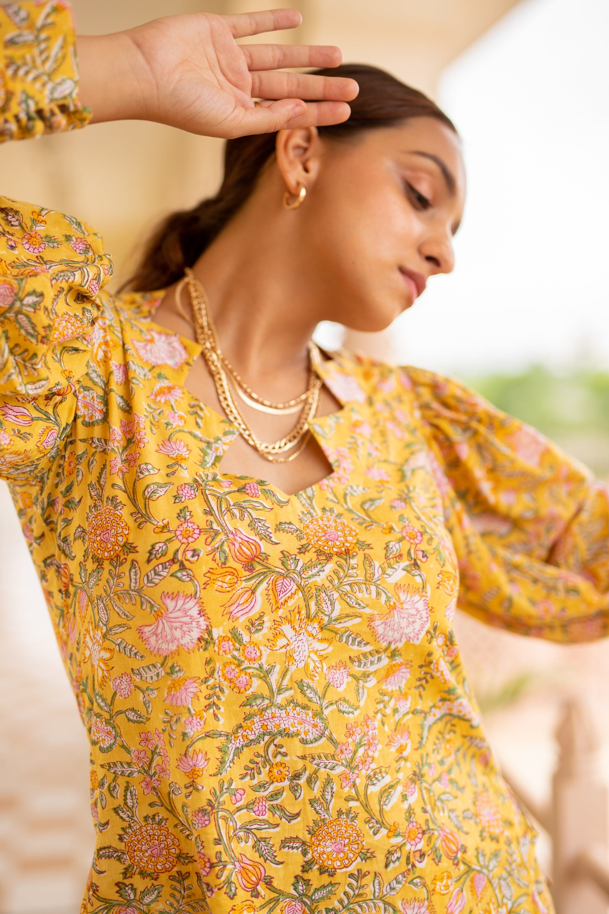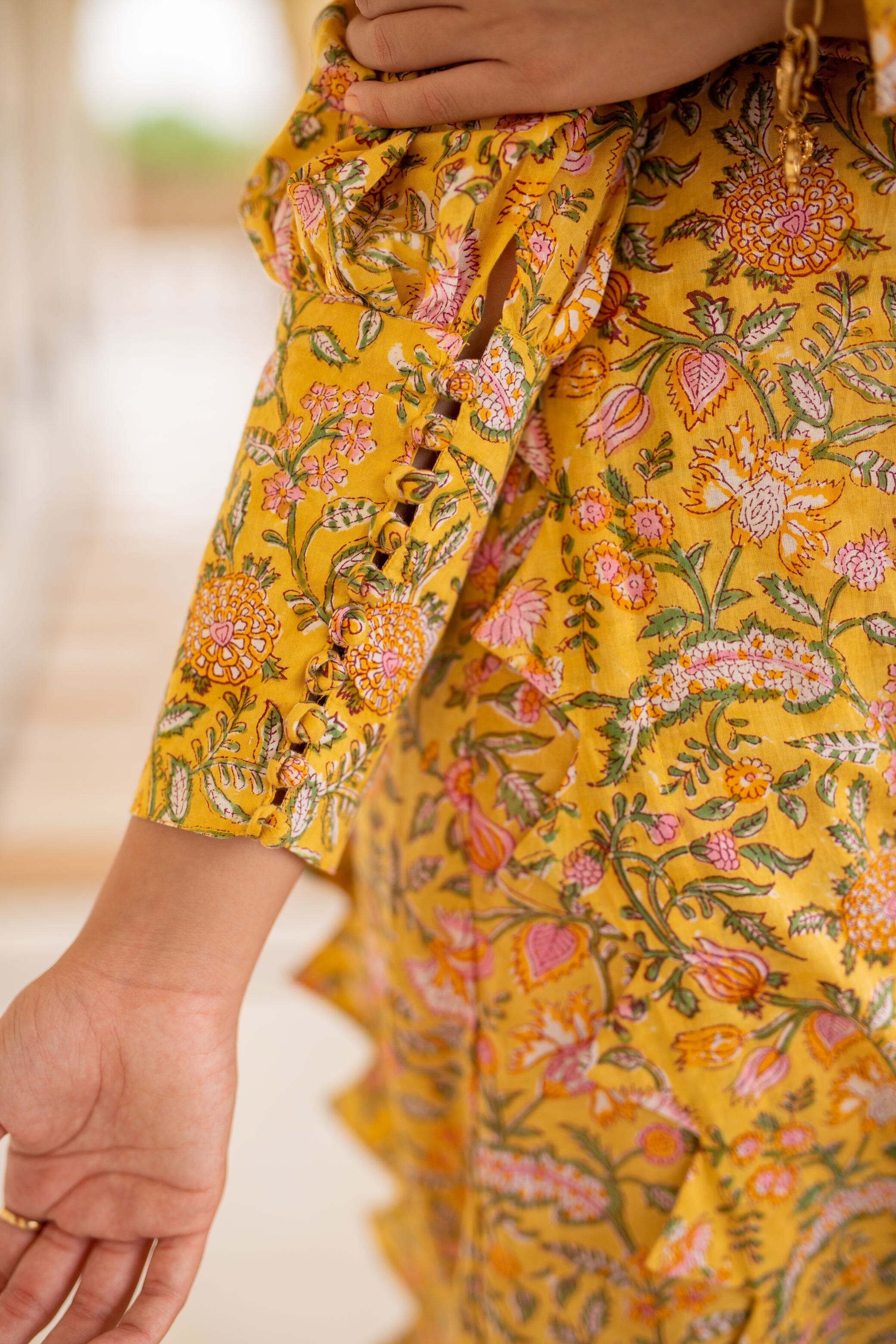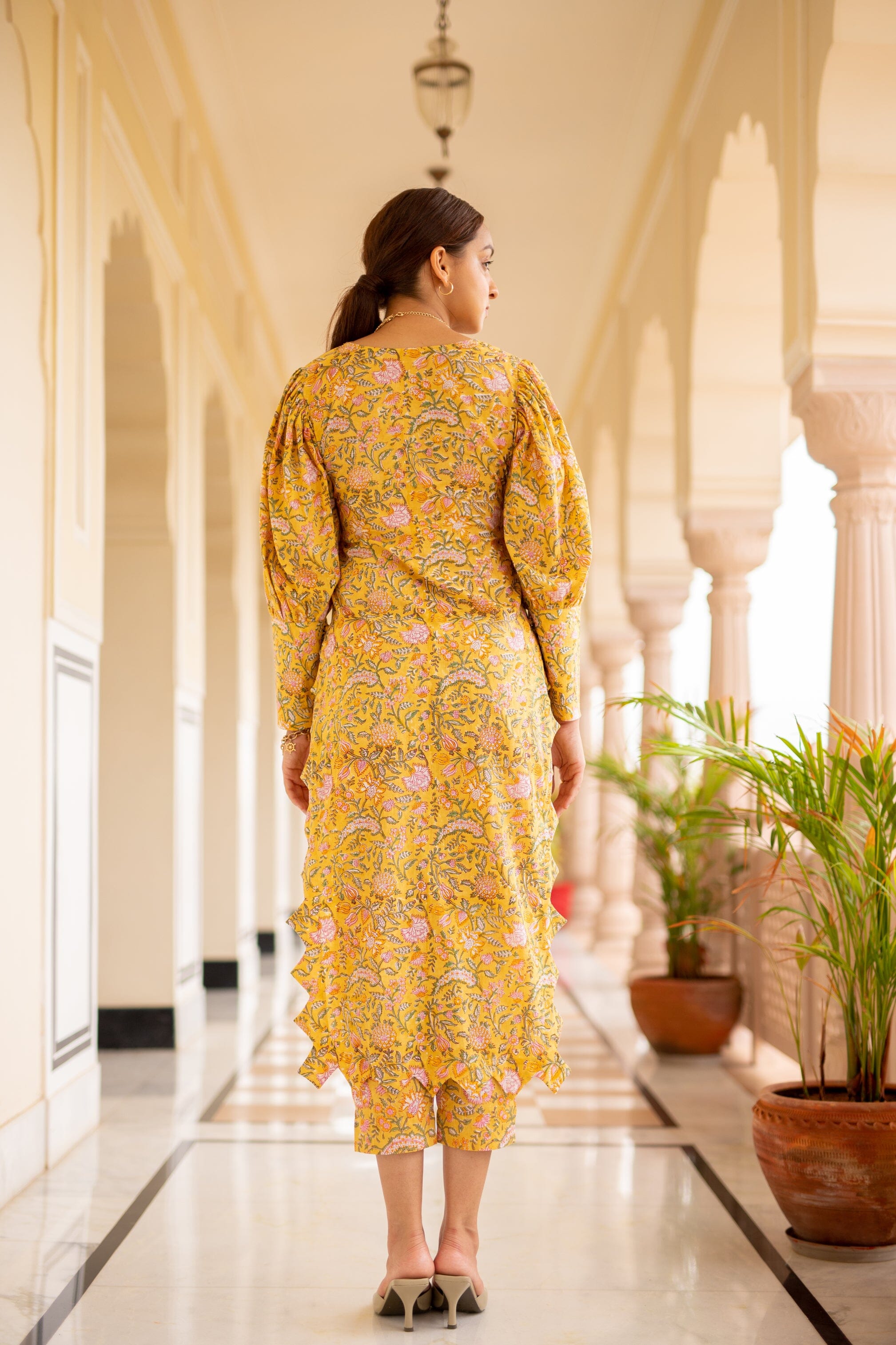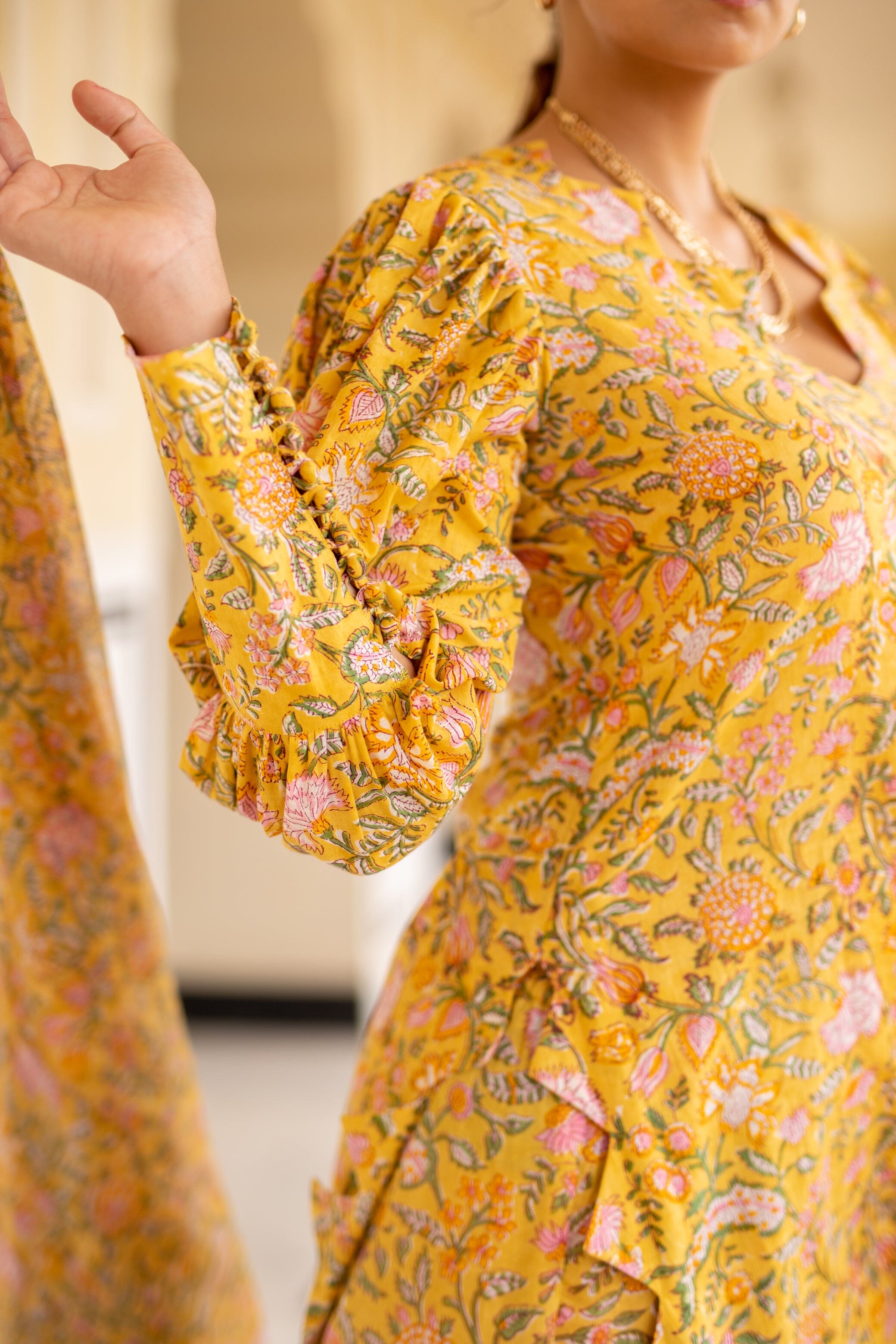 Mid Length Kurti With Triangular Scalloped Edge, Volumed Full Sleeves With Long Cuffs Buttoned Down, Side Slit, Slim Fit Pants. Featuring a yellow Kurti detailed with scalloped edging, paired with matching pants and a dupatta.