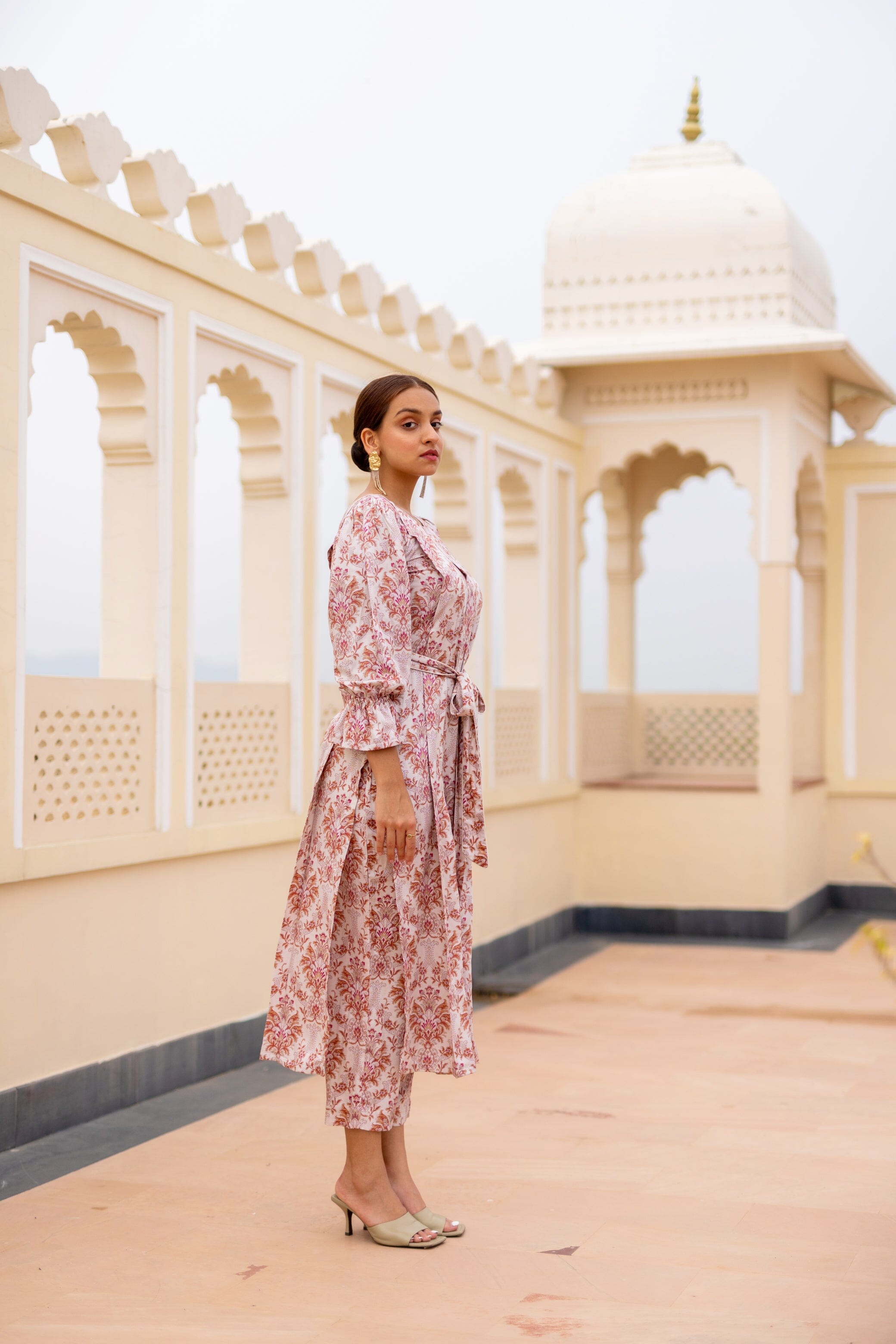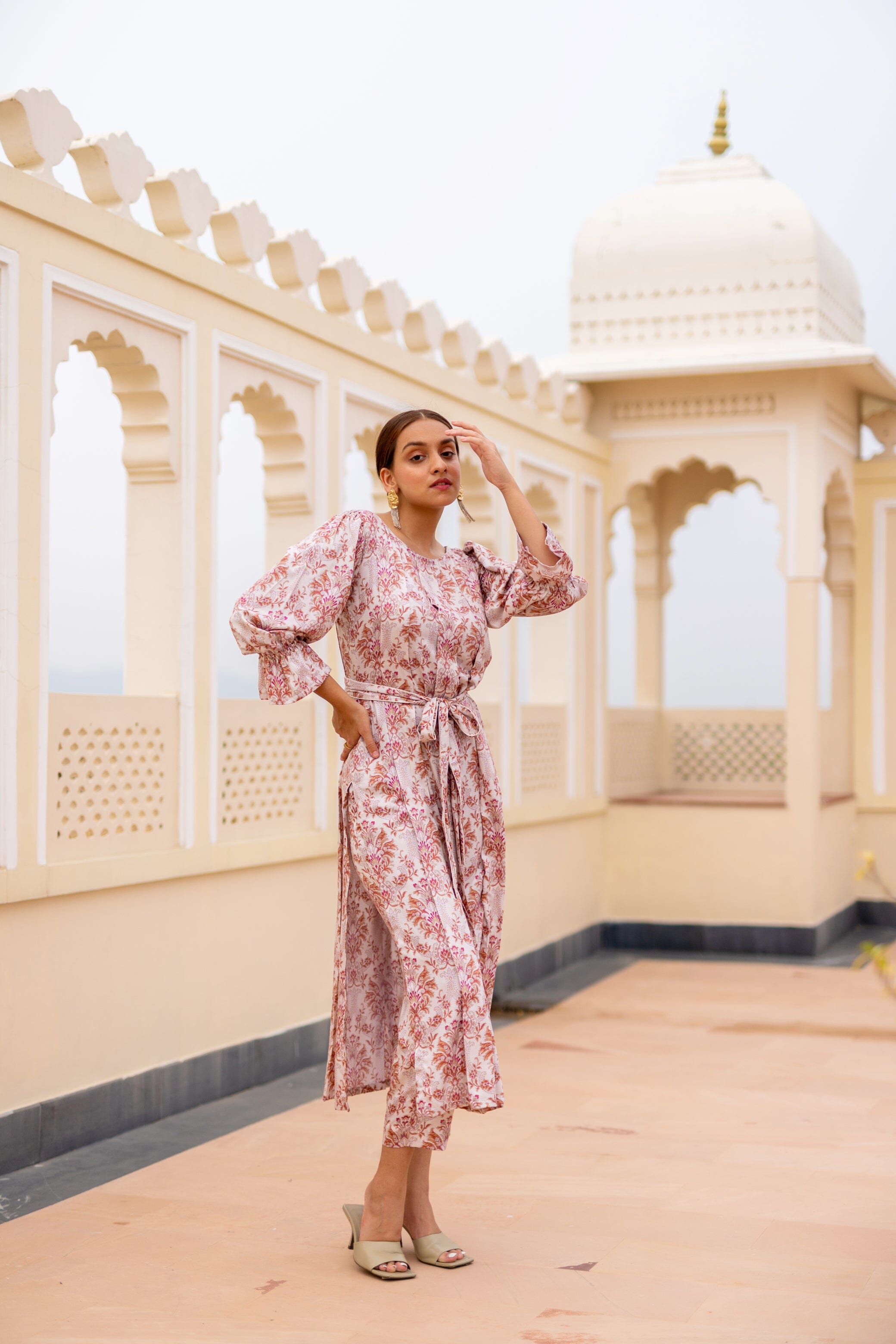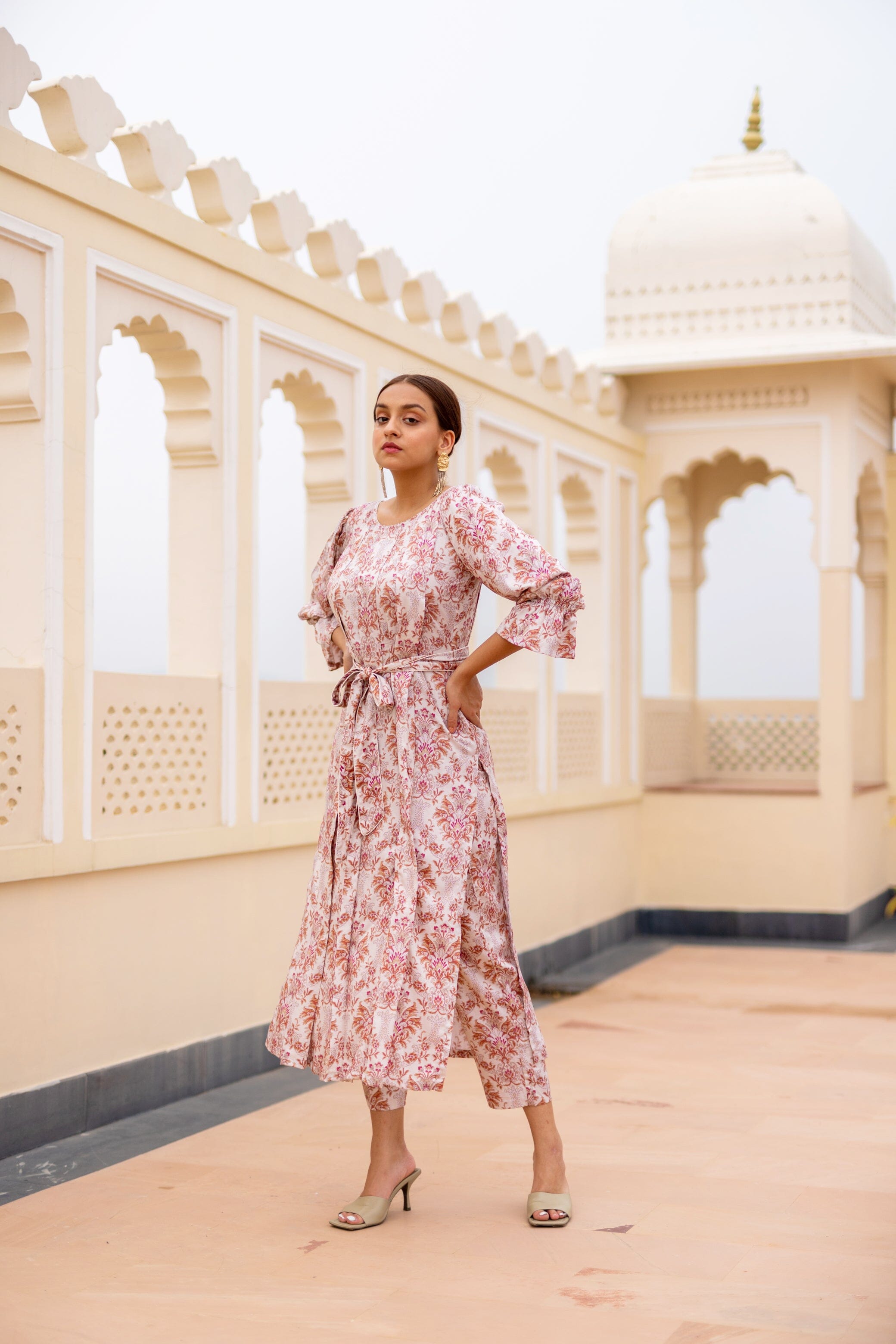 Featuring A Straight Fit Kurta In Modal Base Print. It Is Paired With Matching Pants. Round Neck Box Pleates From Front, With Belt, Slight Gathered With Elastic On Sleeves