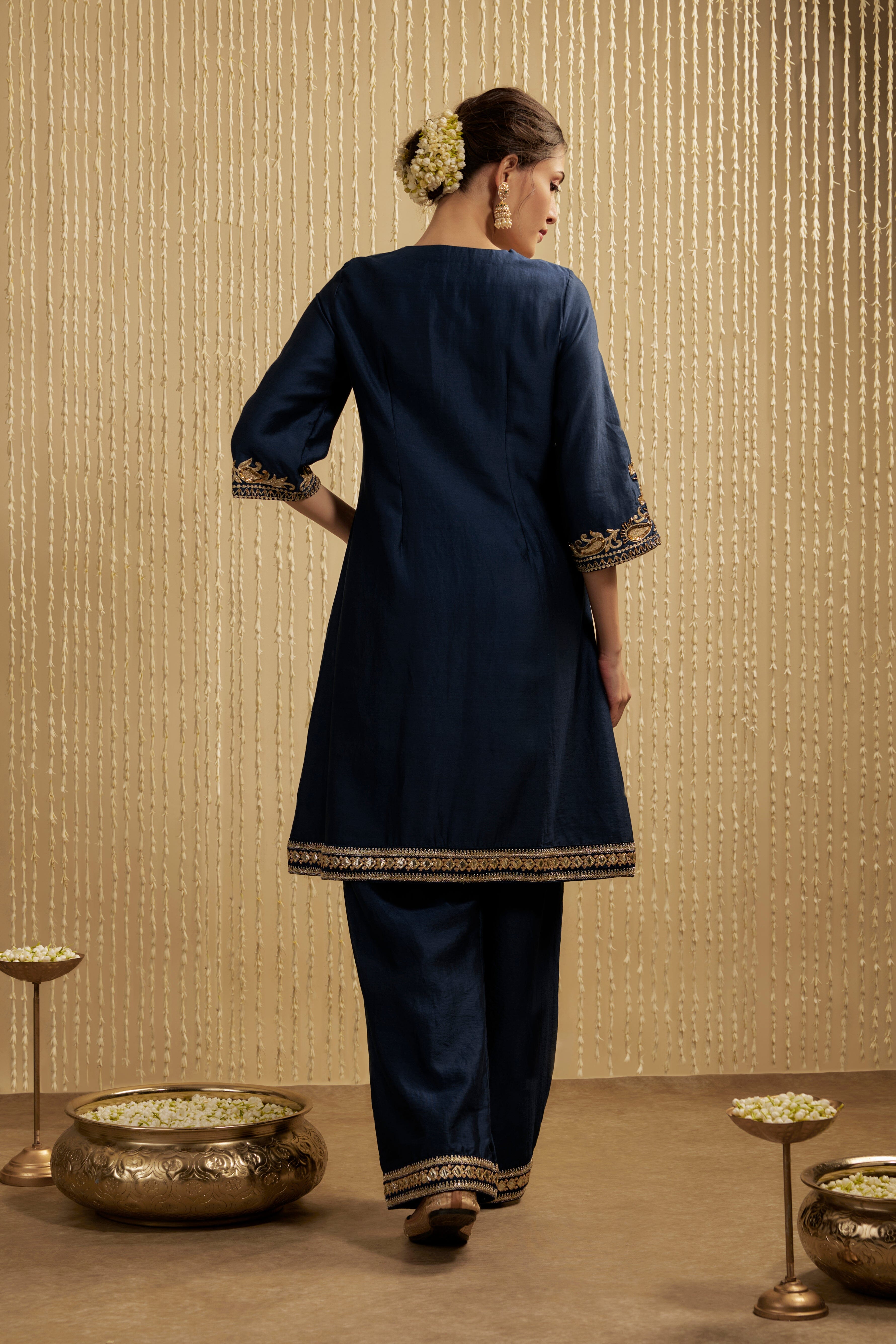 Navy Blue Silk Chanderi Short Kurta Pants Set