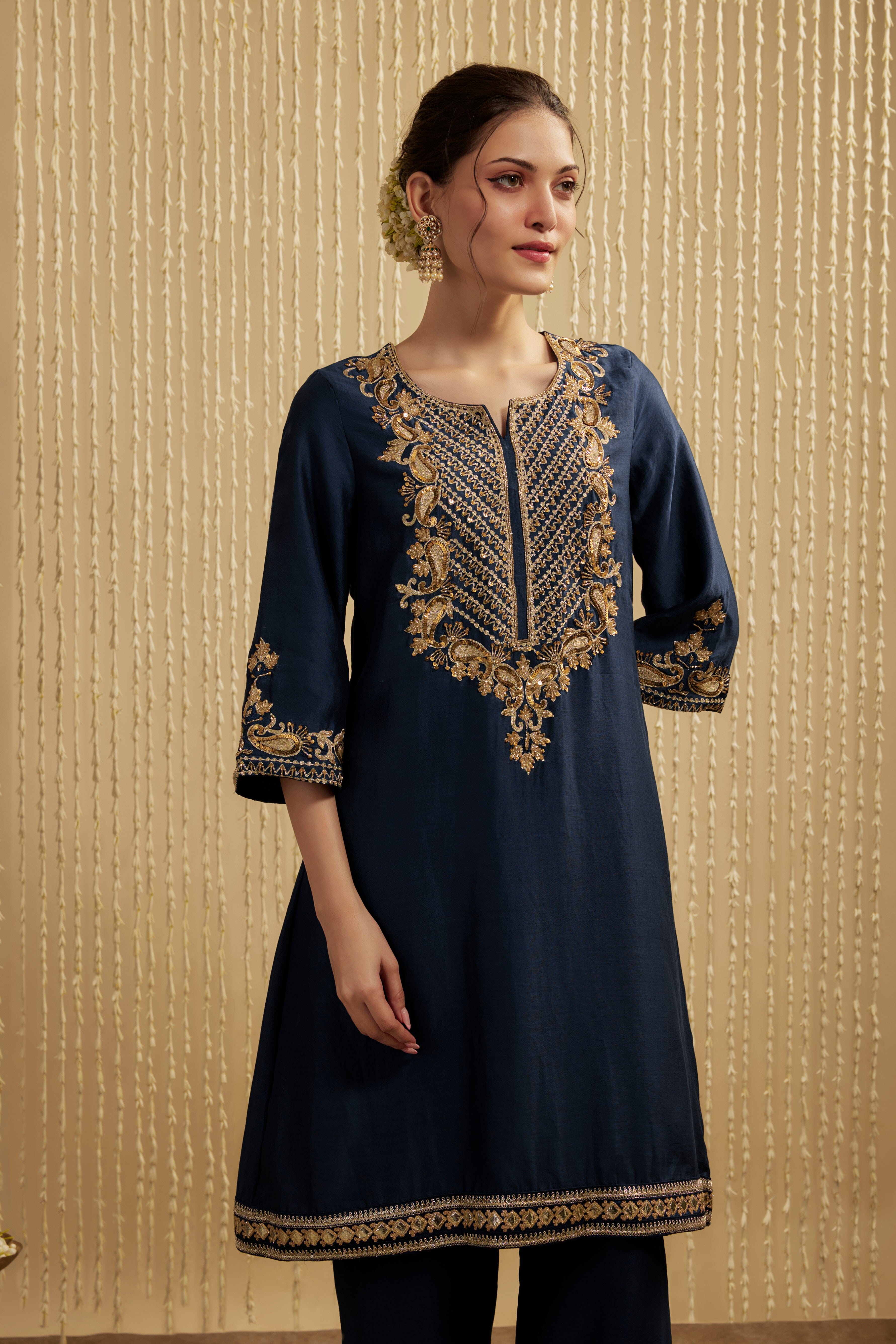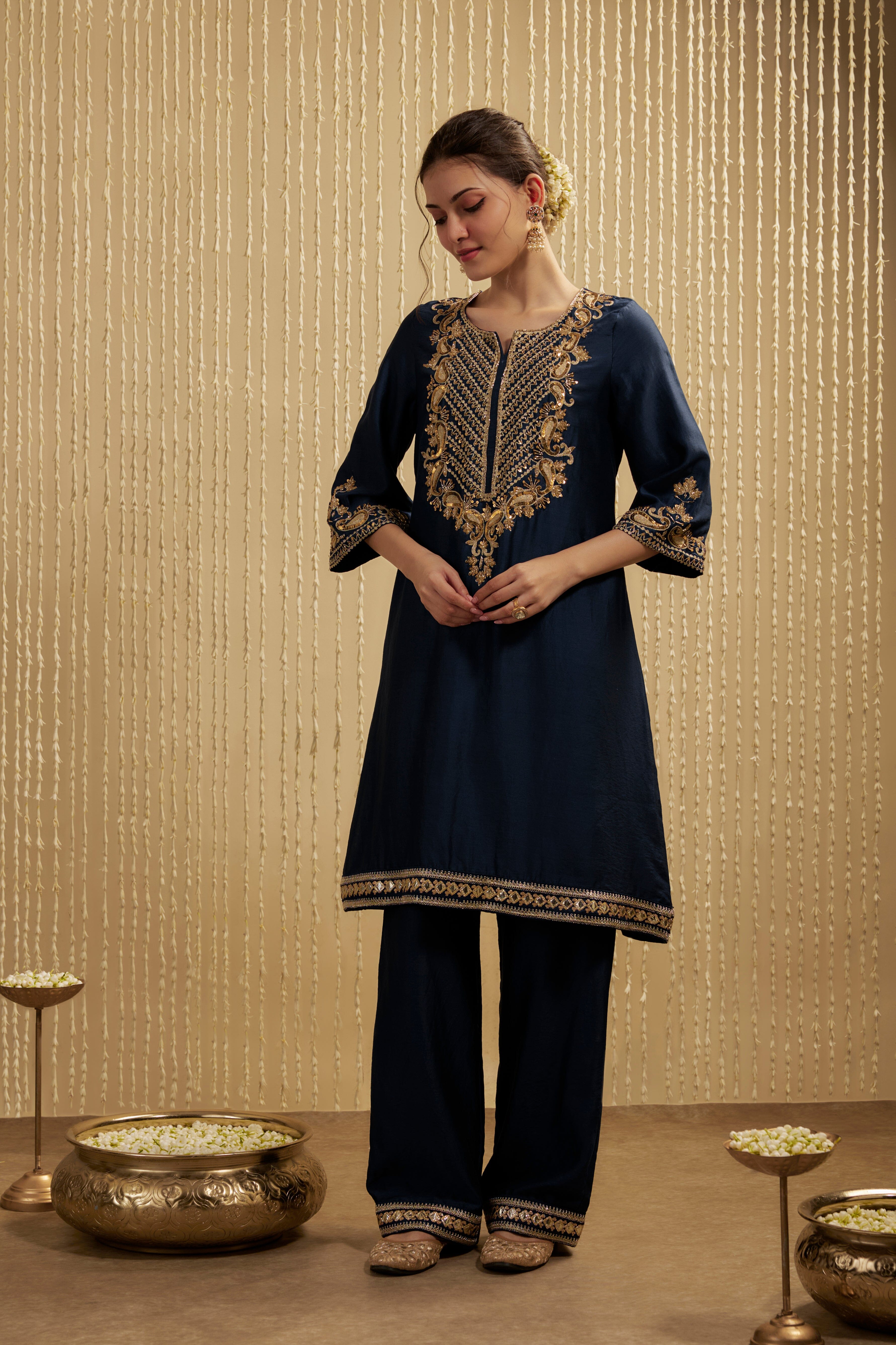 Effortlessly elegant, this navy blue silk Chanderi short kurta and pants set is perfect for intimate evening occasions. Lightweight and breathable, it promises comfort without compromising on style. Delicate embroidery adds a touch of charm, making it ideal for dressing up with heels and a statement bag. A refined pick for festive dinners and night gatherings.