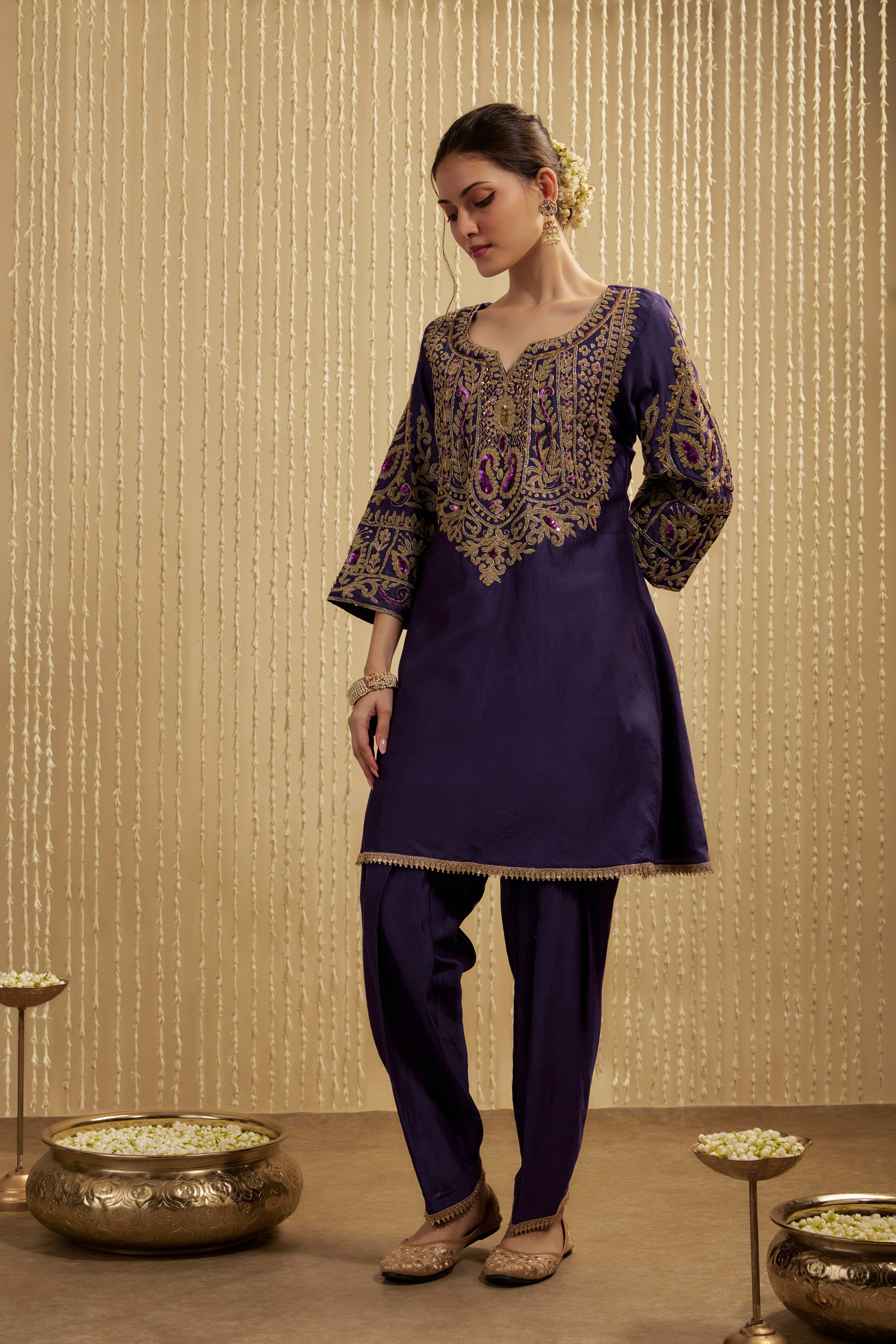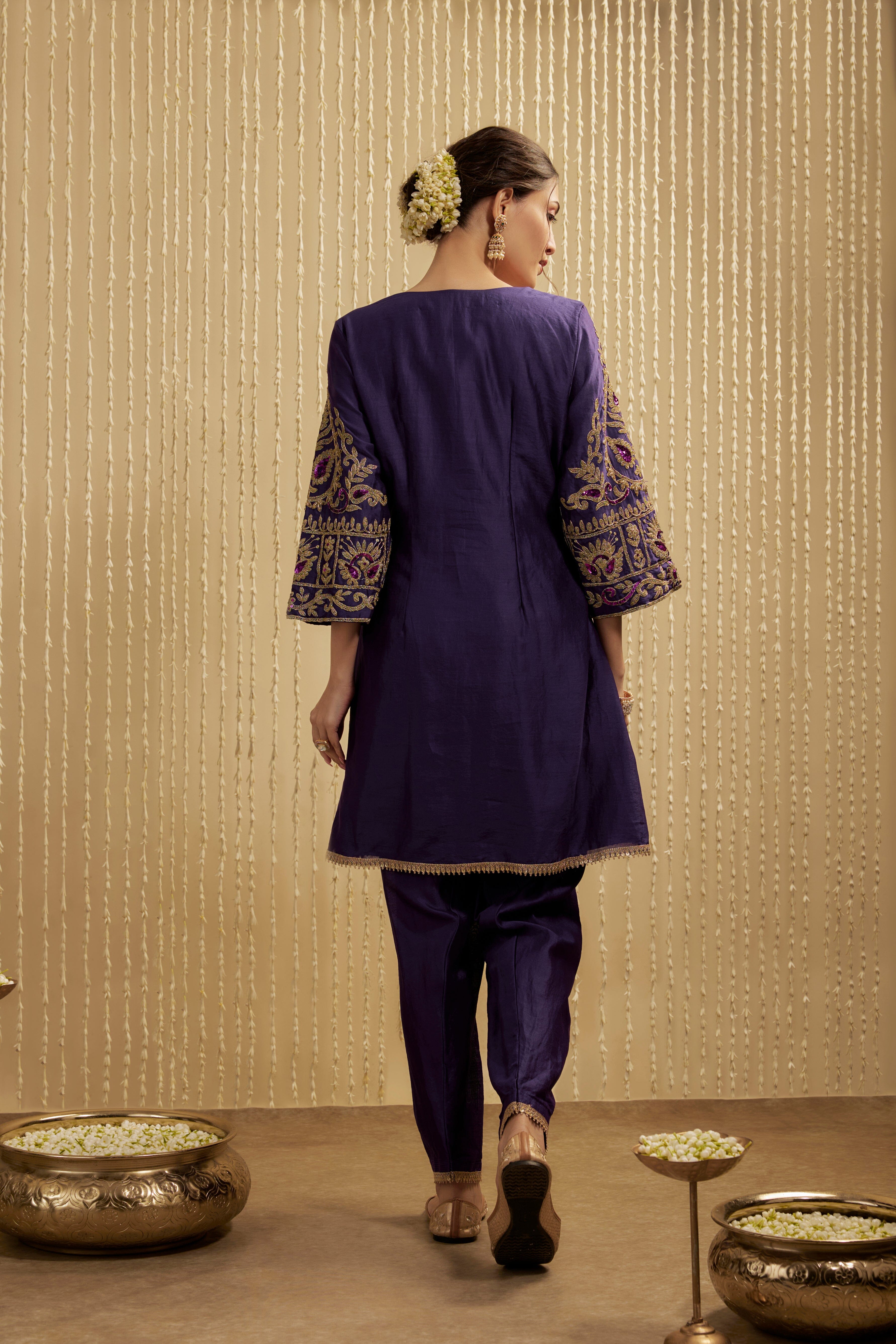 Elevate your intimate gatherings with this elegant Purple Silk Chanderi Short Kurta and Pants Set, delicately embroidered for a refined charm. Light, easy, and breezy, it offers effortless style and comfort. Dress it up with heels and an embroidered potli, or keep it casual with juttis and a chic bag. A versatile must-have for your festive wardrobe.
