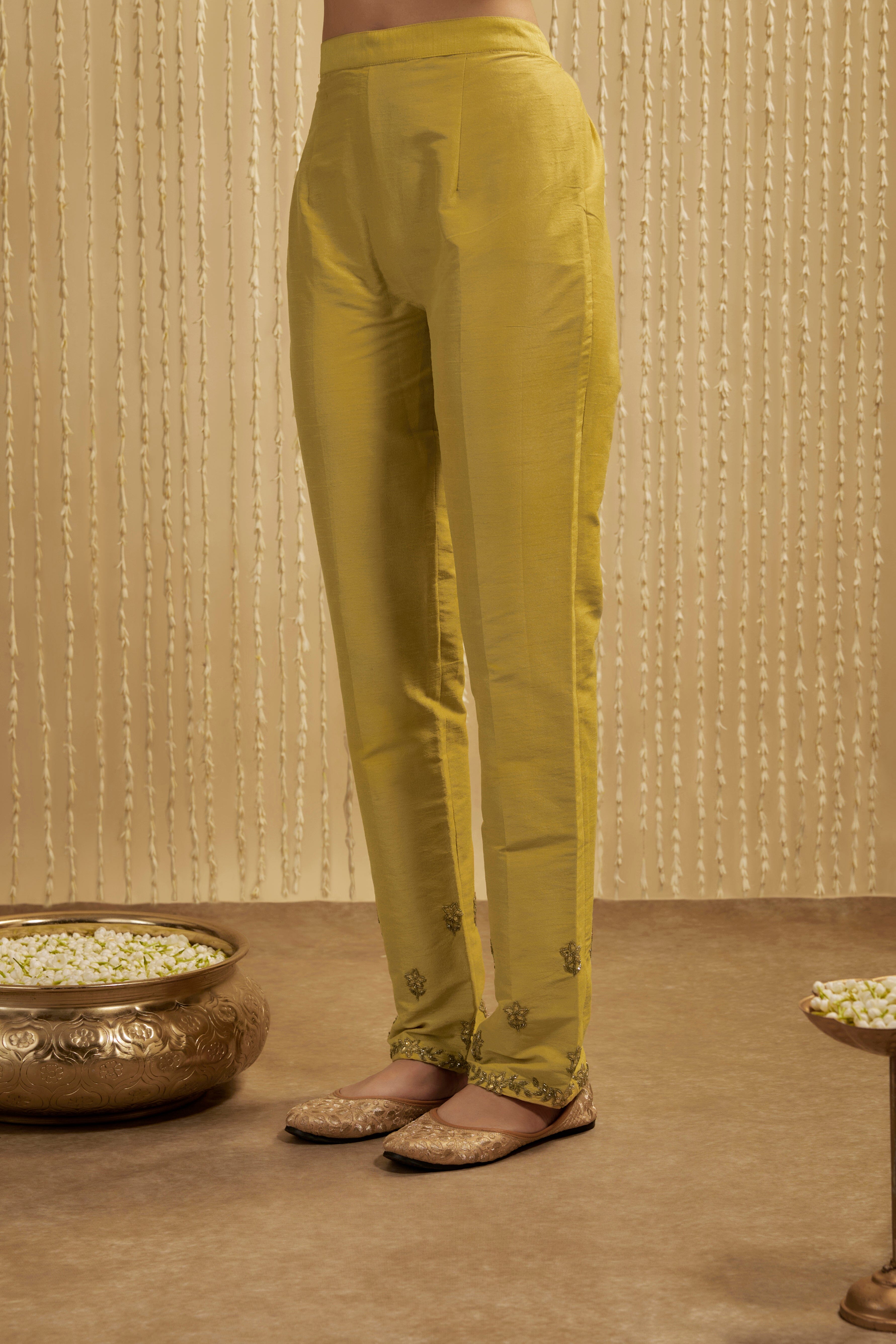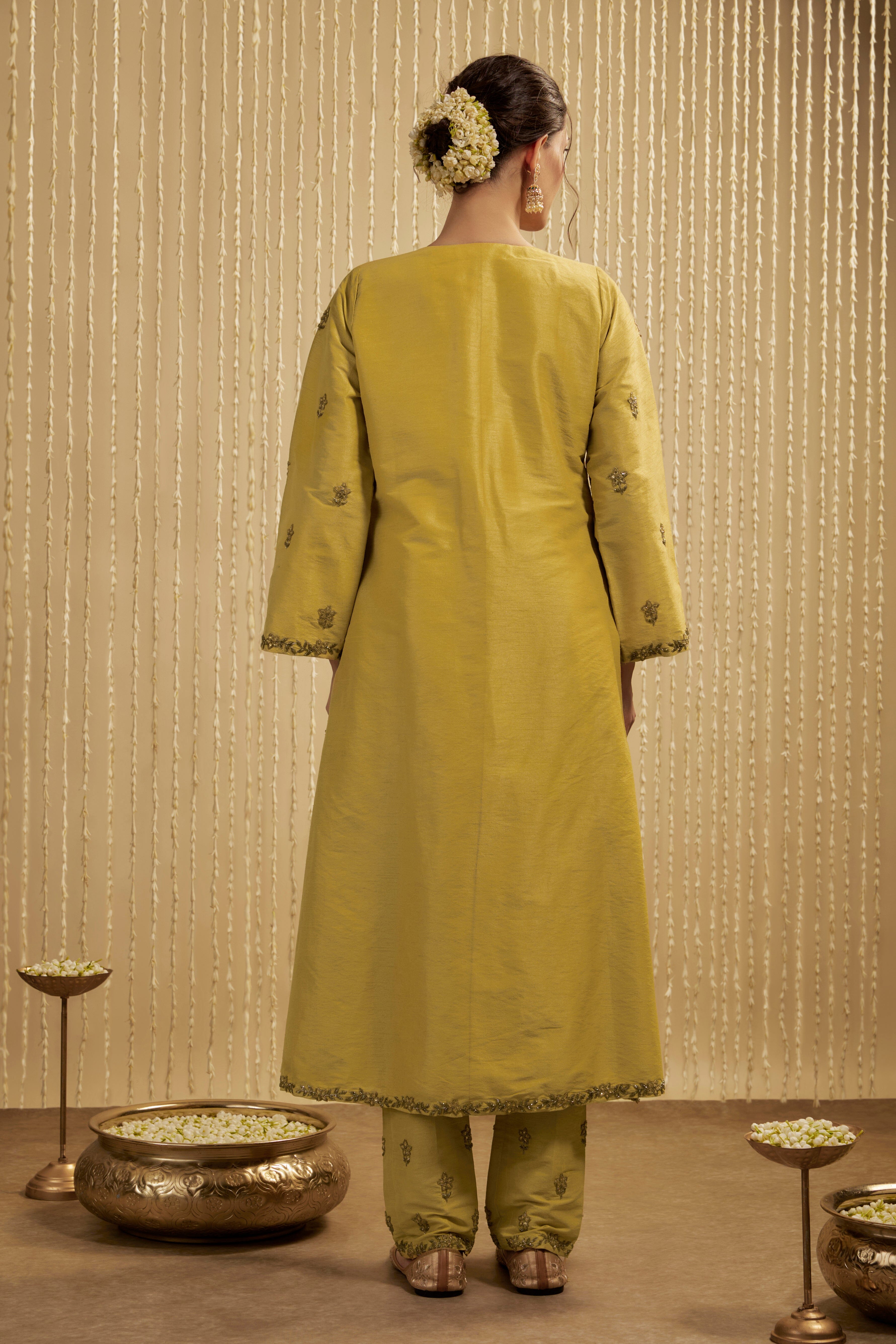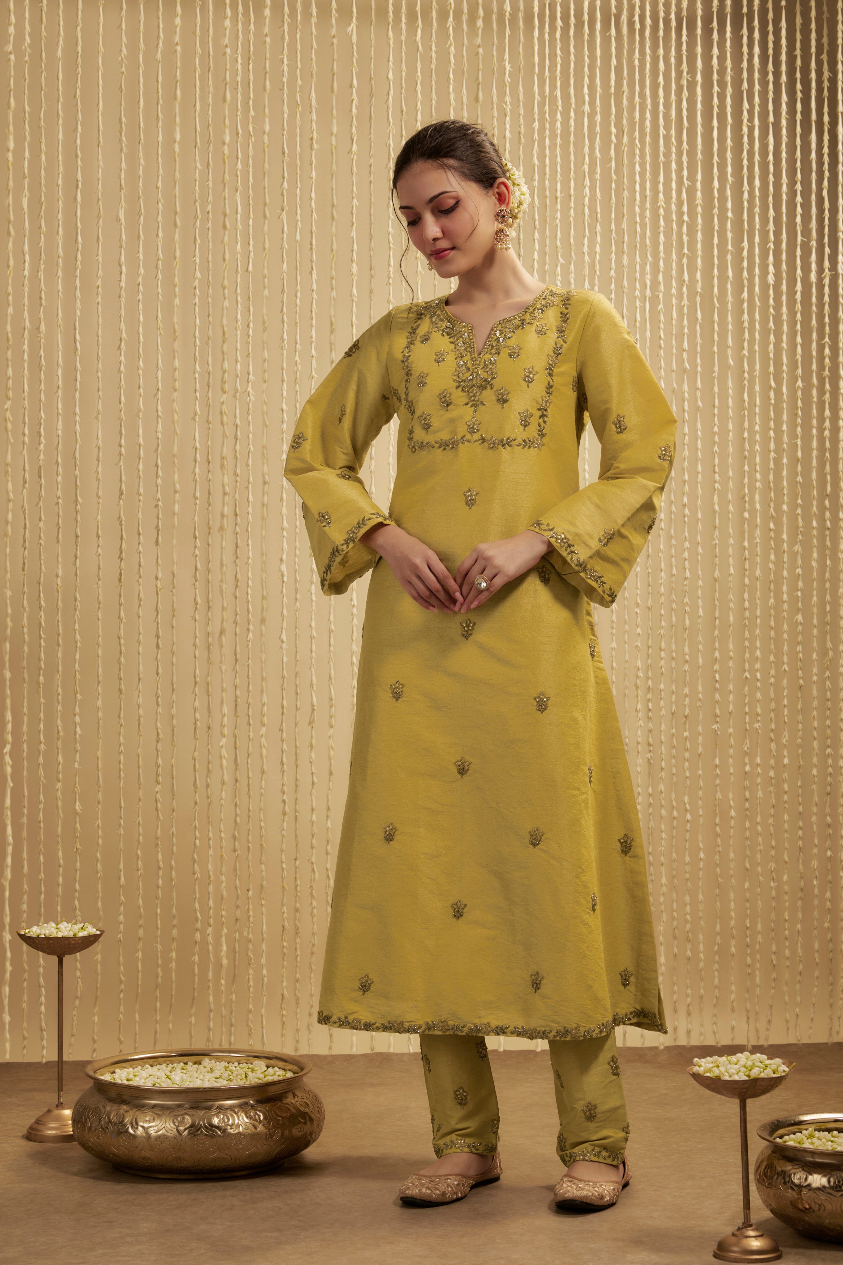 This mustard yellow kurta-pants set in luxurious dupion silk offers a perfect blend of dressy comfort and timeless elegance. Delicately embroidered with intricate detailing, it is ideal for wedding functions, formal events, or poojas. The beautiful hue makes it a versatile choice for both day functions and evening celebrations, effortlessly styling up or down.