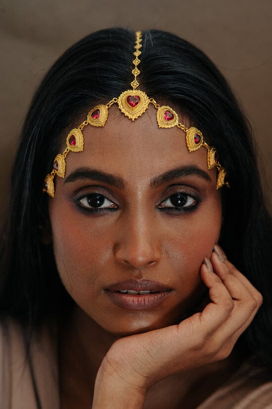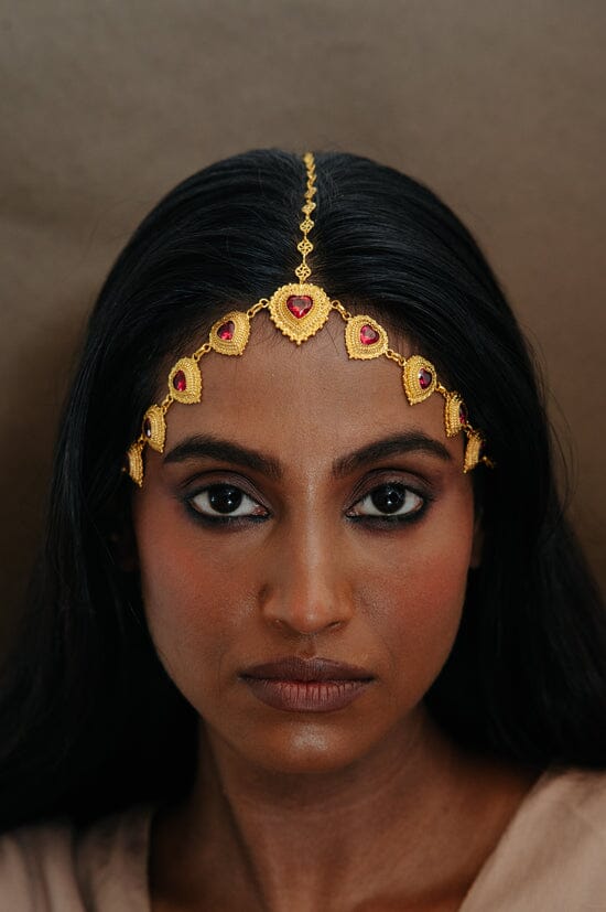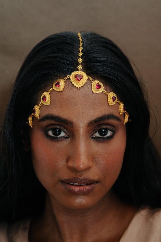 A handmade detailed headpiece featuring hearts with Ruby stones