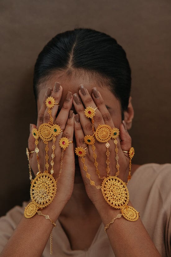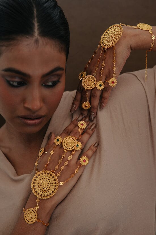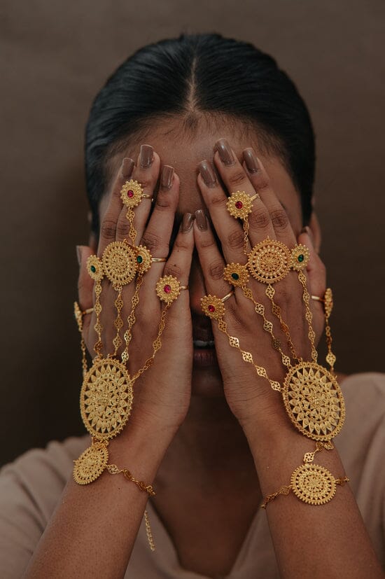A handmade hand jewel featuring 5 unique rings connected to a bracelet with detailed chains. Rings and bracelet are adjustable to fit all sizes