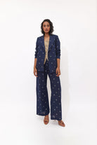 The blazer is double breasted with a notch collar with front buttoned closure.