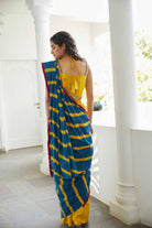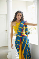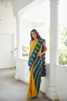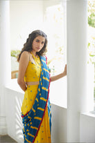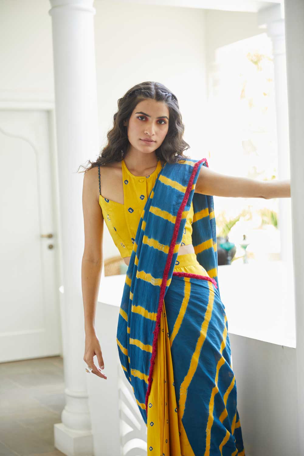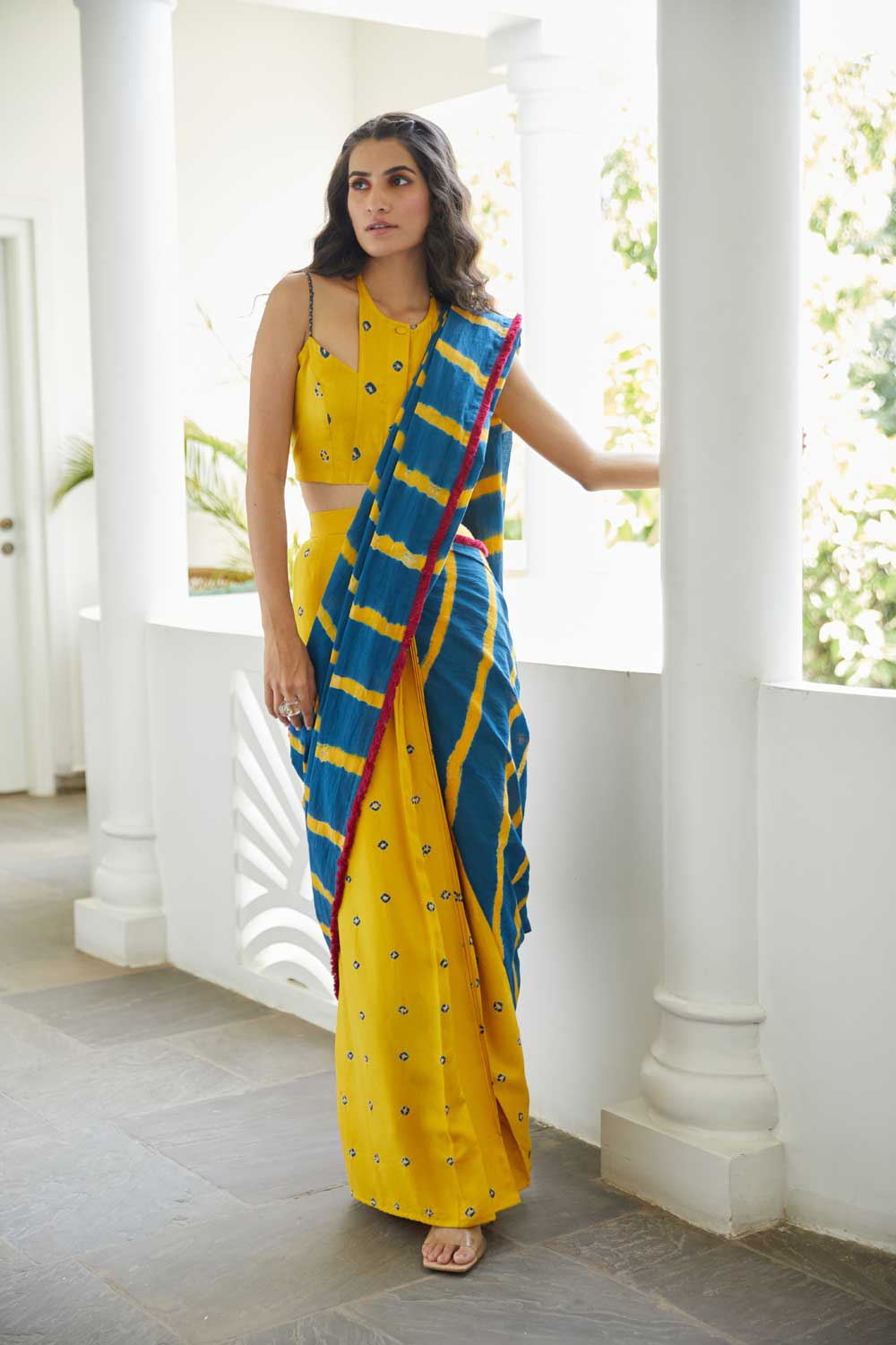 Ponte en marcha con nuestro conjunto de sari pre drapeado Bandhej que inducirá una sensación de frescura a todo tu look.