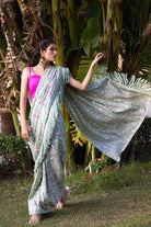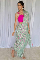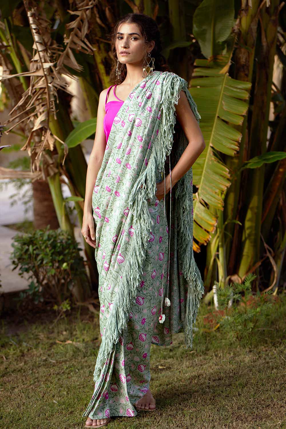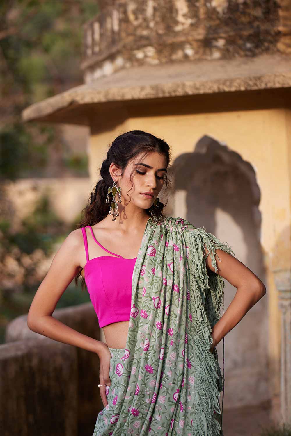 ¡Aquí la tradición se encuentra con la modernidad! Esta falda sari drapeada con estampado de bloques y un top en contraste es una declaración de moda que llamará la atención.