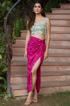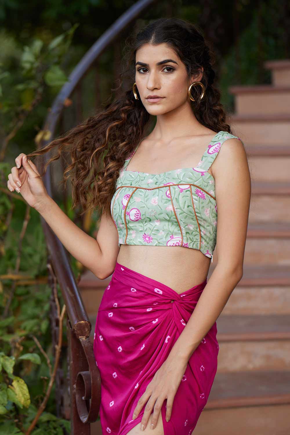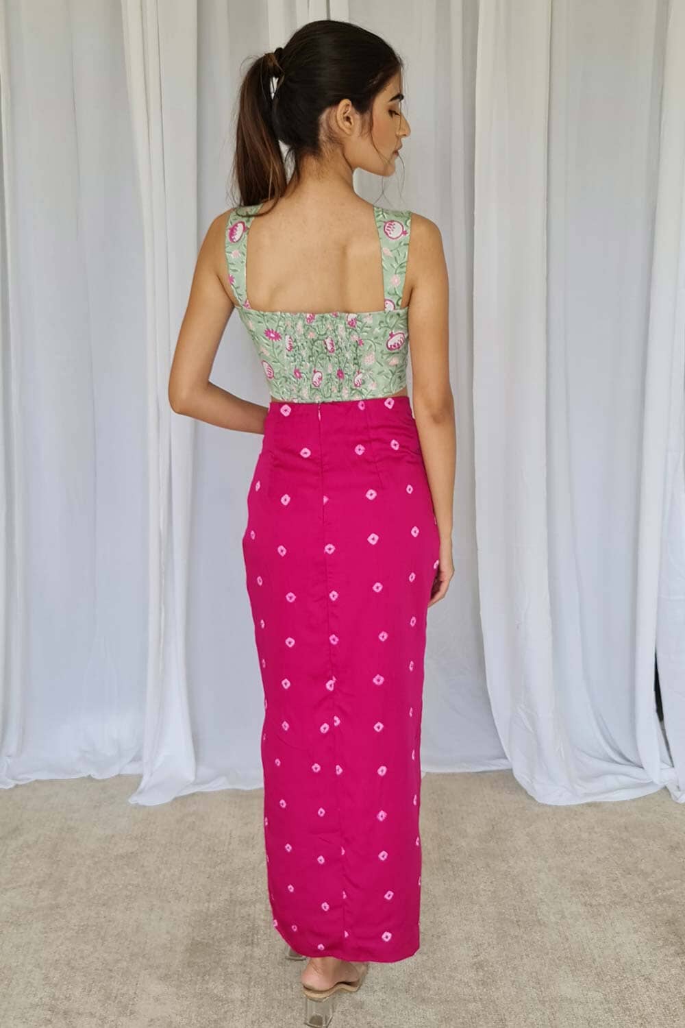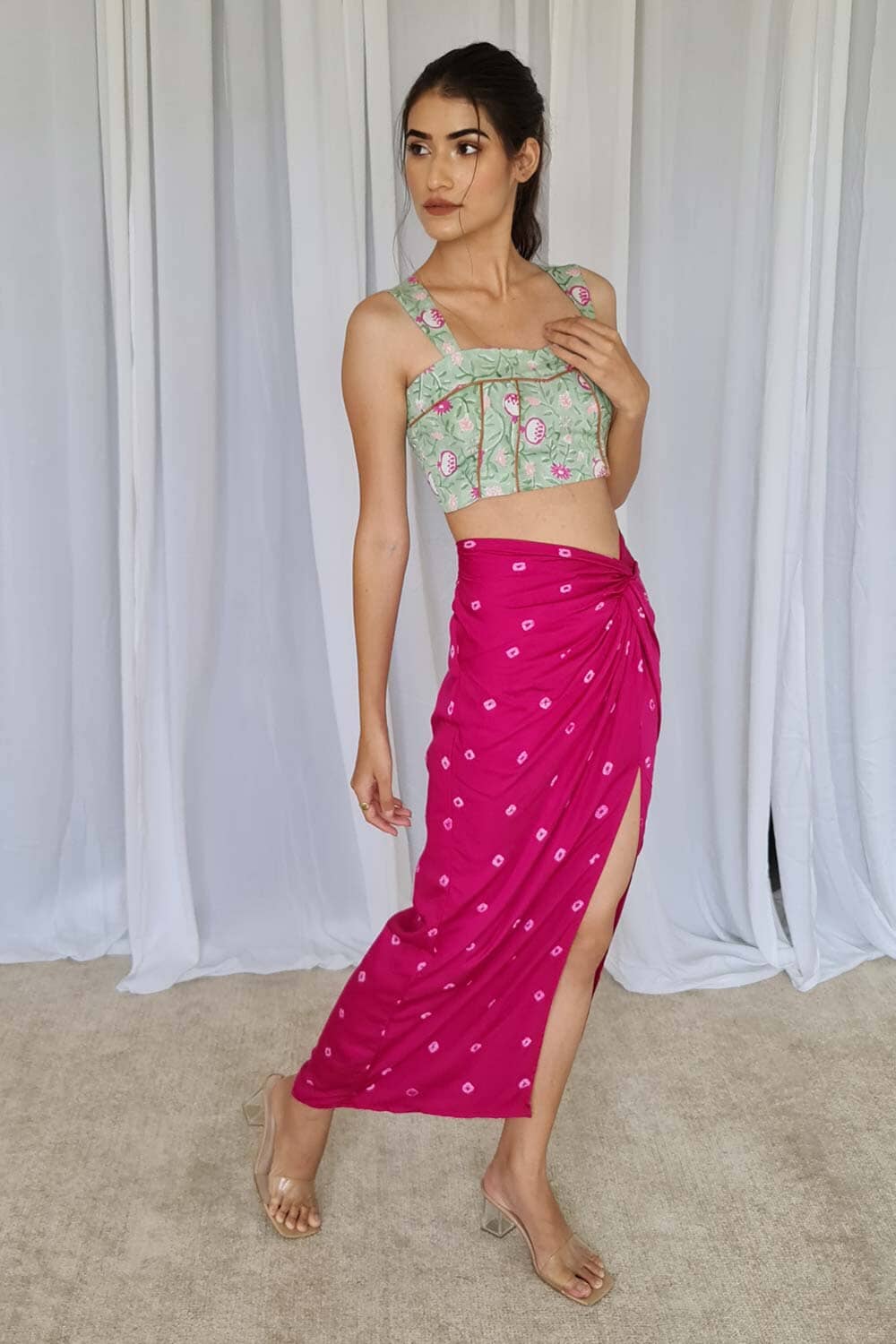 Vístete para impresionar con esta increíblemente elegante falda con nudo bandhej y un corpiño con estampado de bloques.