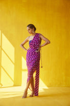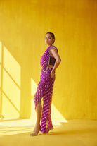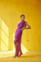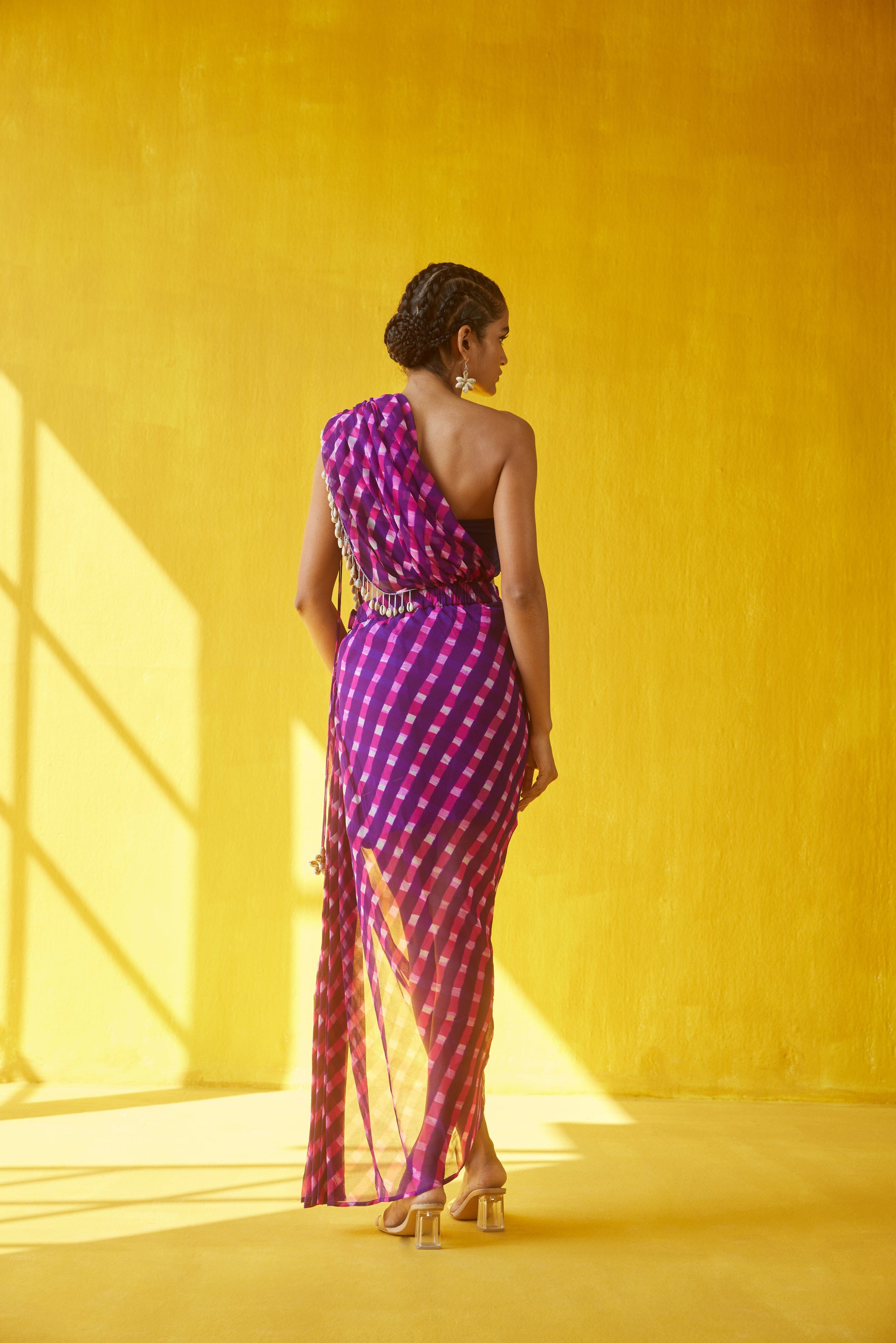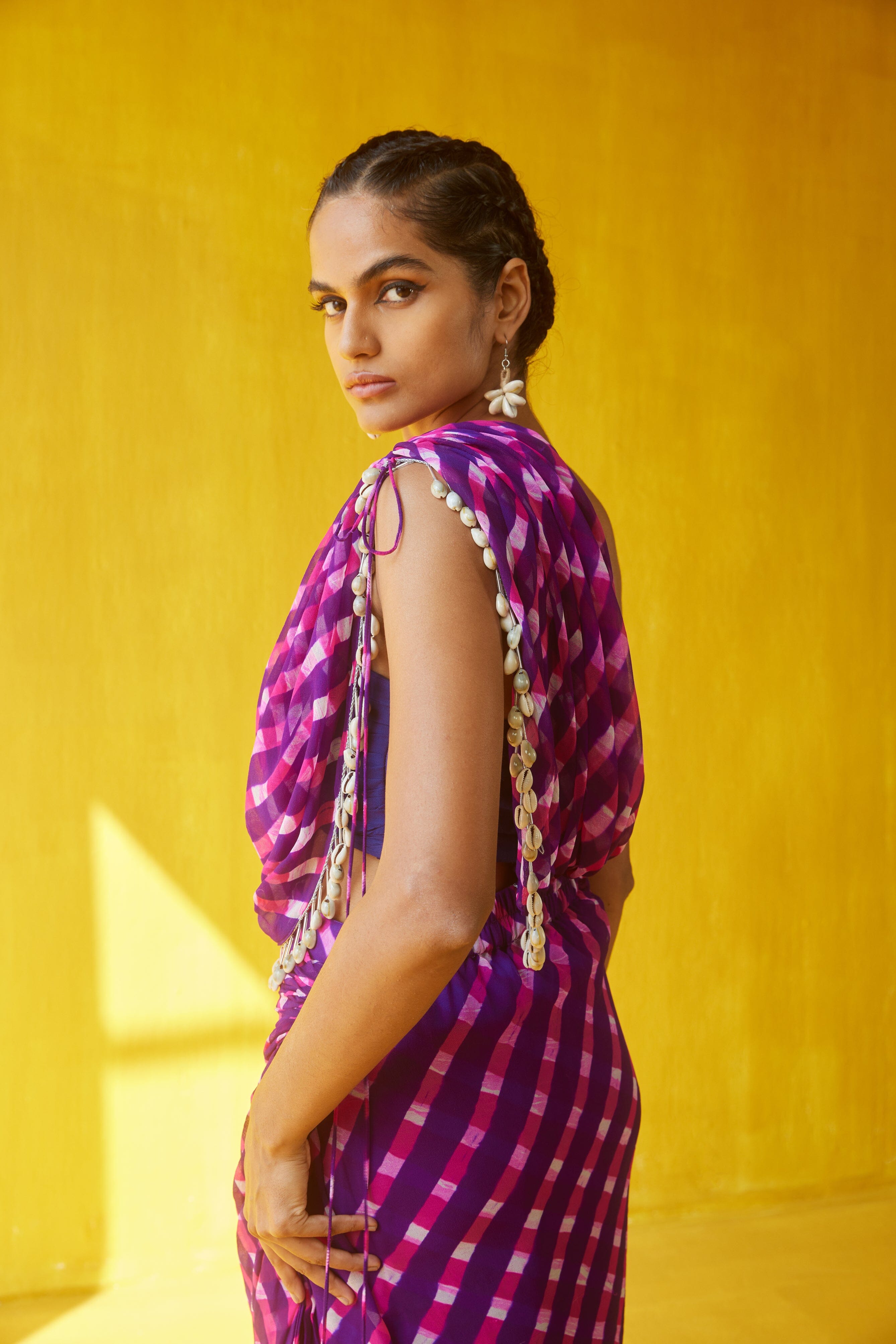 La falda presenta una cortina interesante y un accesorio ajustable tipo pallu, resaltado con un delicado encaje de concha de cauri.