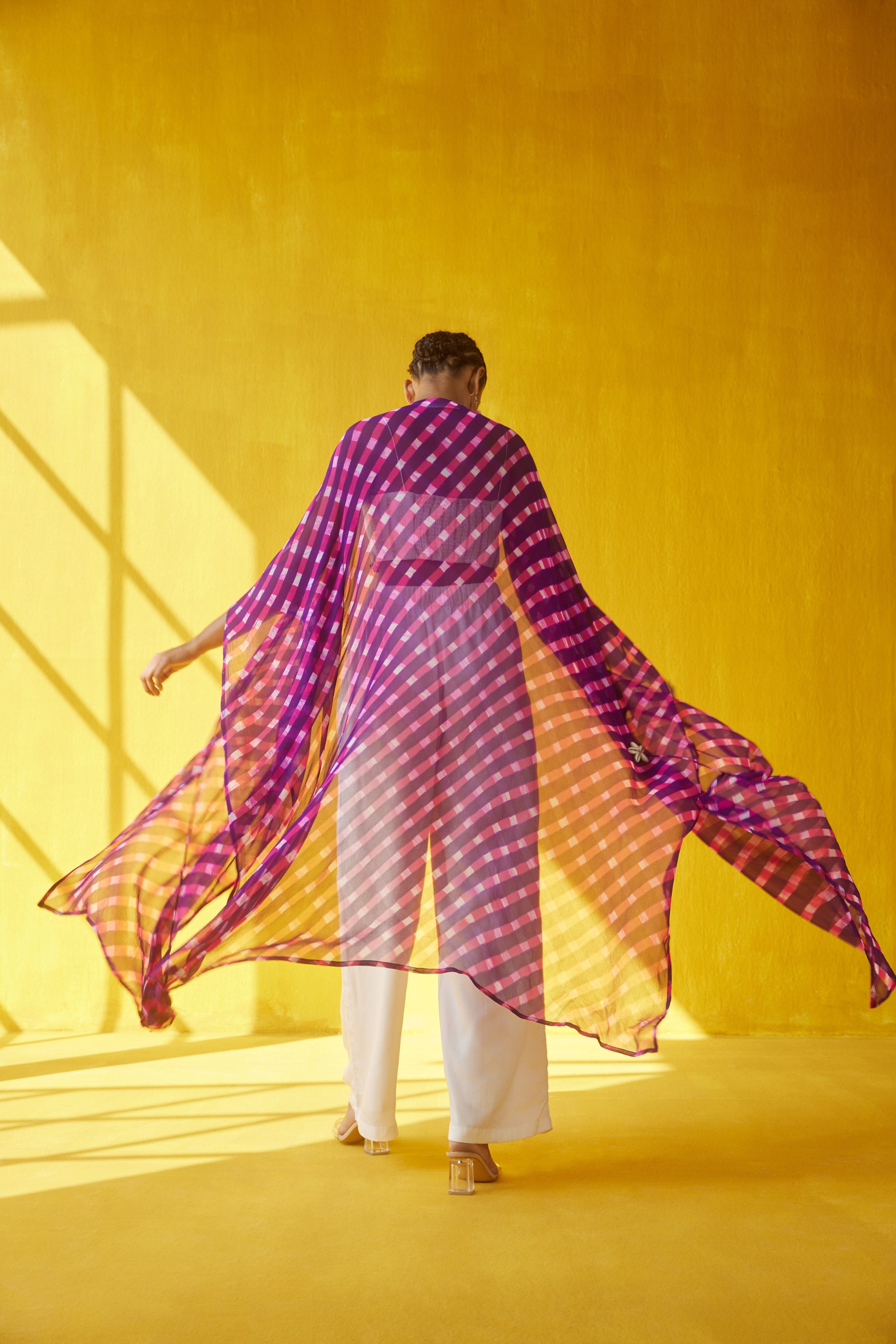 El caftán Mothda atado y teñido a mano se realza con conchas de cauri y borlas hechas a mano.