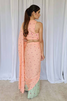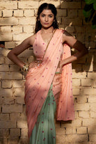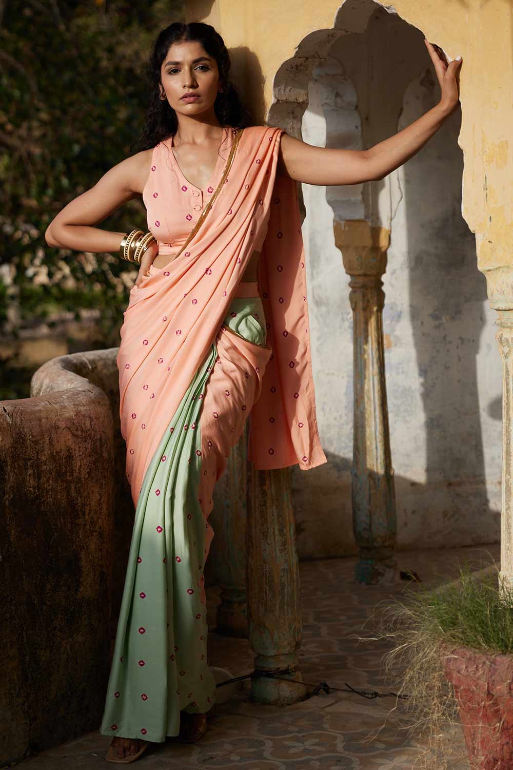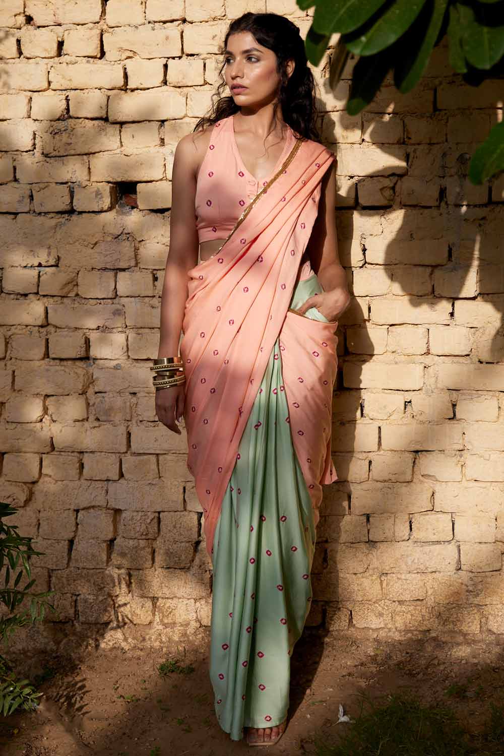 Femenino y encantador, este sari drapeado bandhej de dos colores con top/blusa bandhej es una declaración de moda que hará girar la cabeza.