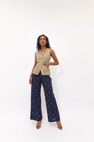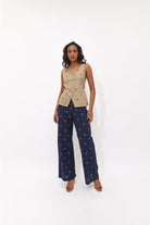 The pants feature an elasticated back waist, side zipper and inseam pockets.