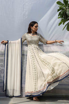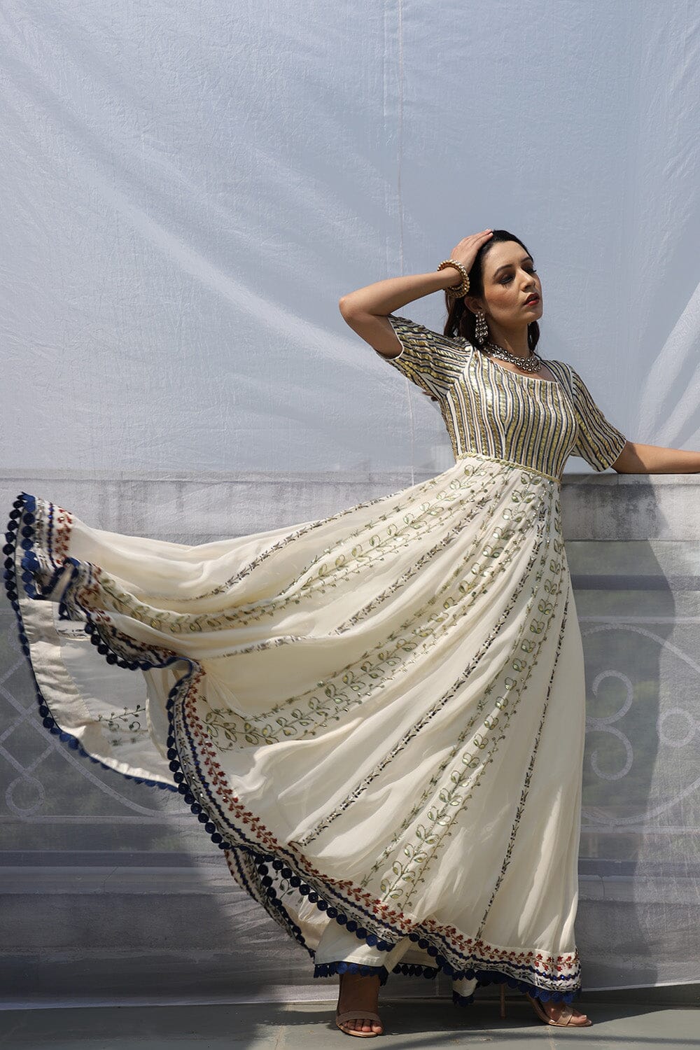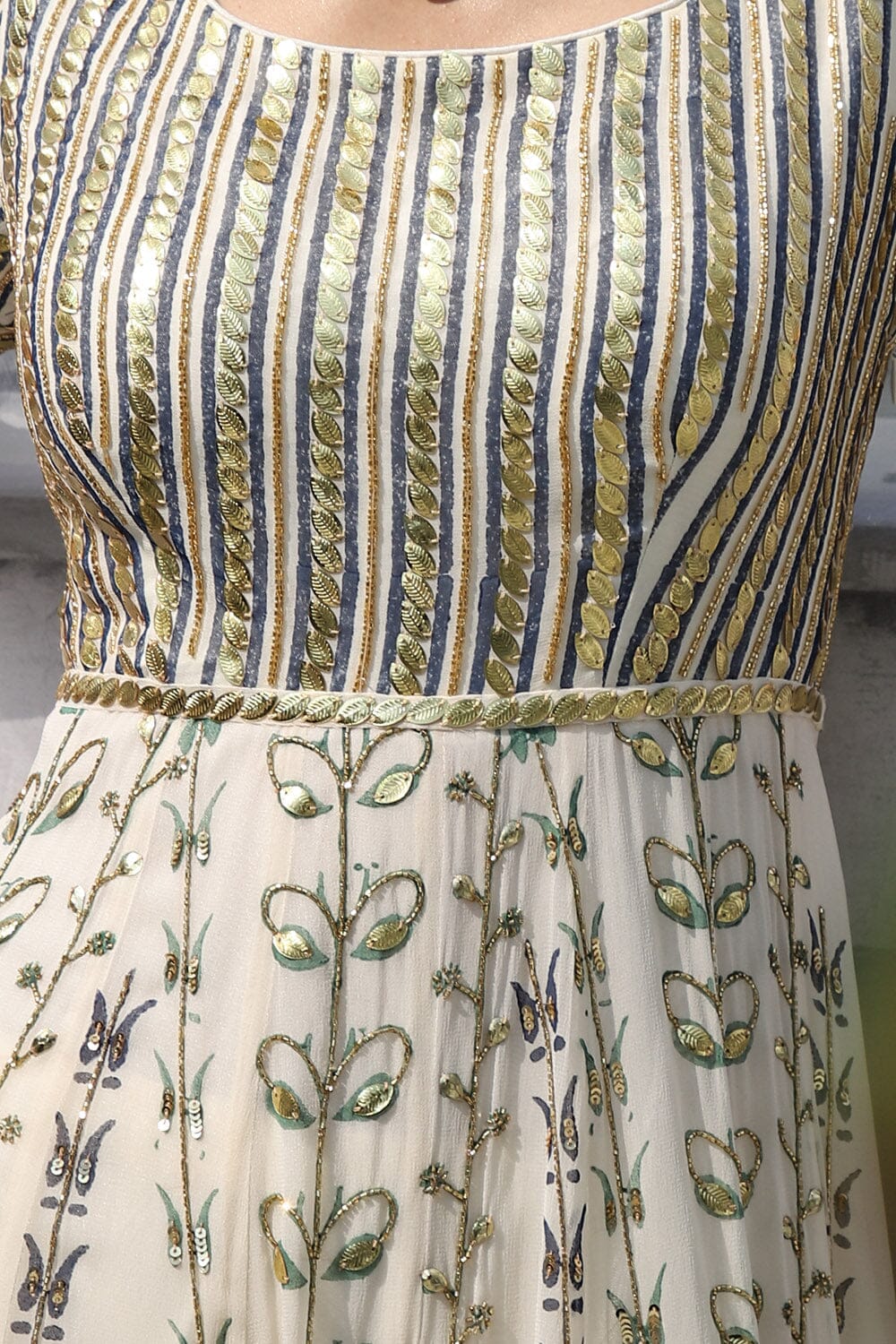 Conjunto Anarkali en color blanco roto confeccionado en georgette con base de estampado personalizado. La parte superior está totalmente bordada a mano con lentejuelas metálicas doradas en forma de hojas. El flow Ghera está bordado a mano utilizando intrincados elementos de lentejuelas geométricas y cut-dana en 3D. Está rematado con un interesante detalle de crochet. Viene con una dupatta de georgette y pantalones blancos con el mismo detalle de crochet.