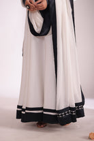 This three piece set includes Anarkali, Chooridar and dupatta White satin round neckline anarkali with black satin border in the hem and sleeves. White chooridar. White gerogette dupatta with black satin border with floral black lace finishings.