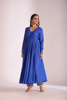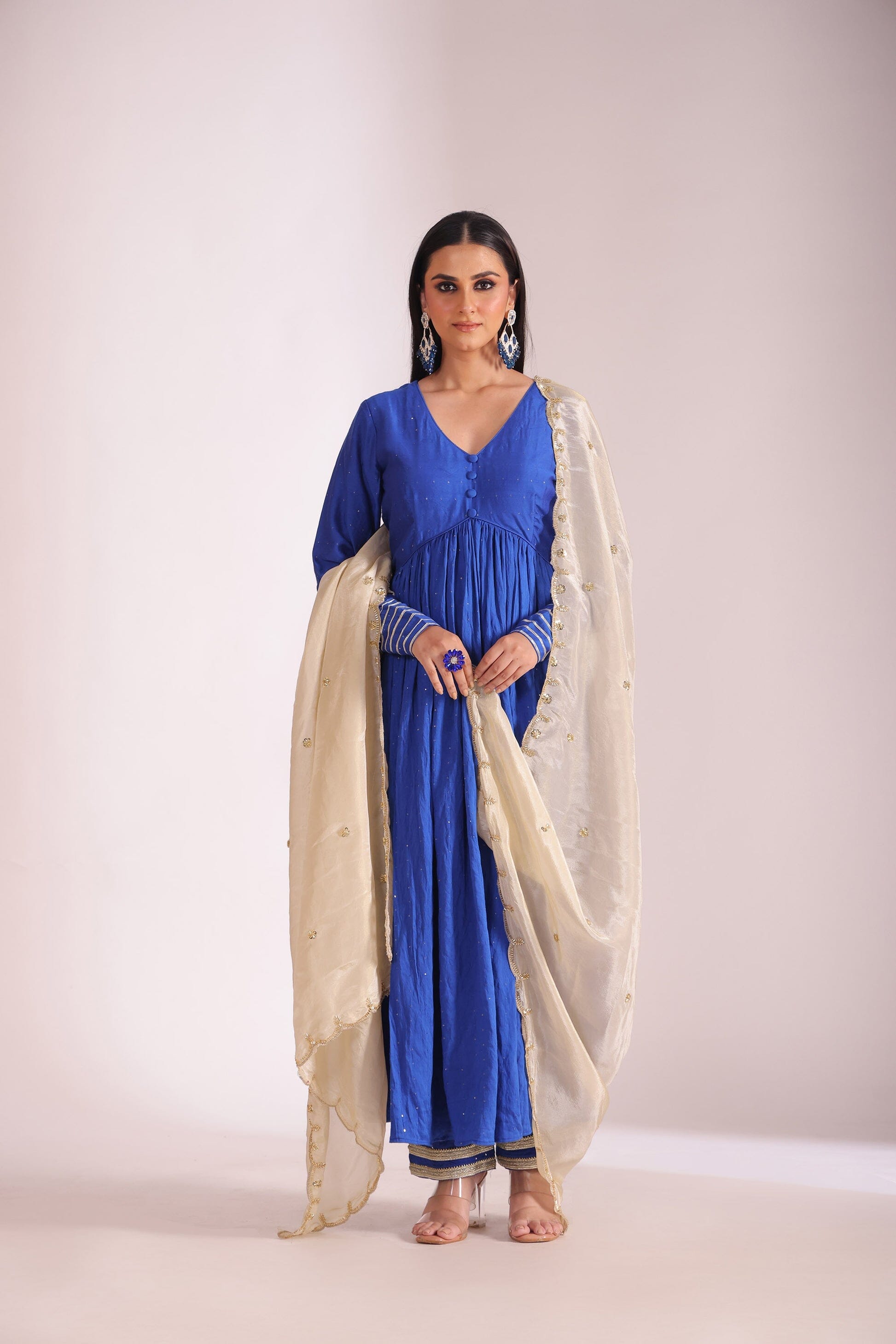 This set includes Anarkali, Palazzo, and Dupatta. The Anarkali features delicate sequins in Blue Chanderi, designed with a flattering V-neckline and sleeves with gota detailing, leading into soft gathers that create a flowing, elegant silhouette. It is paired with chanderi Palazzo for comfort and fluidity with detailed gota and dori work at the hem . The look is completed with a contrast tissue dupatta, finished with intricate embroidery and scalloped edges for a graceful and festive finish.