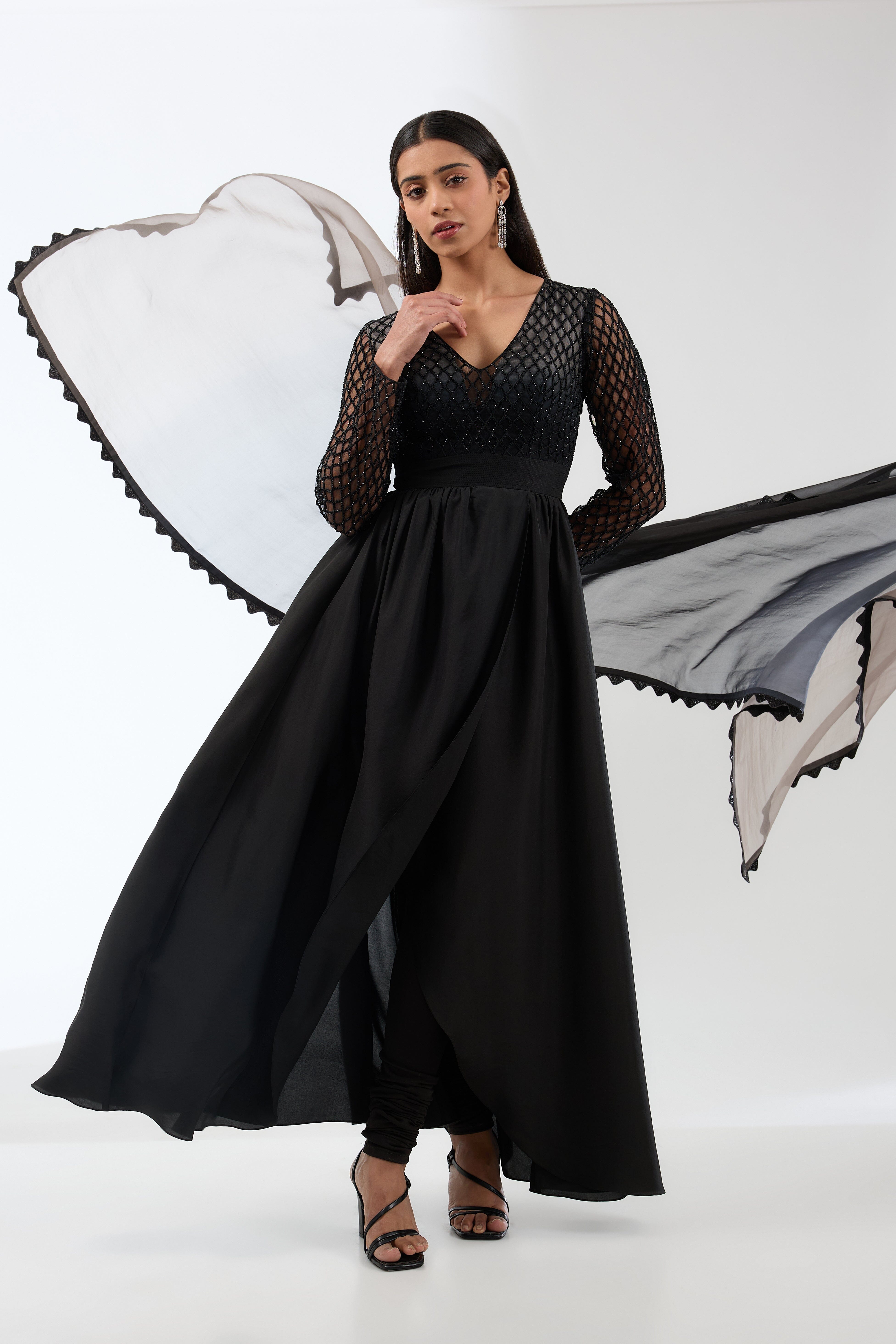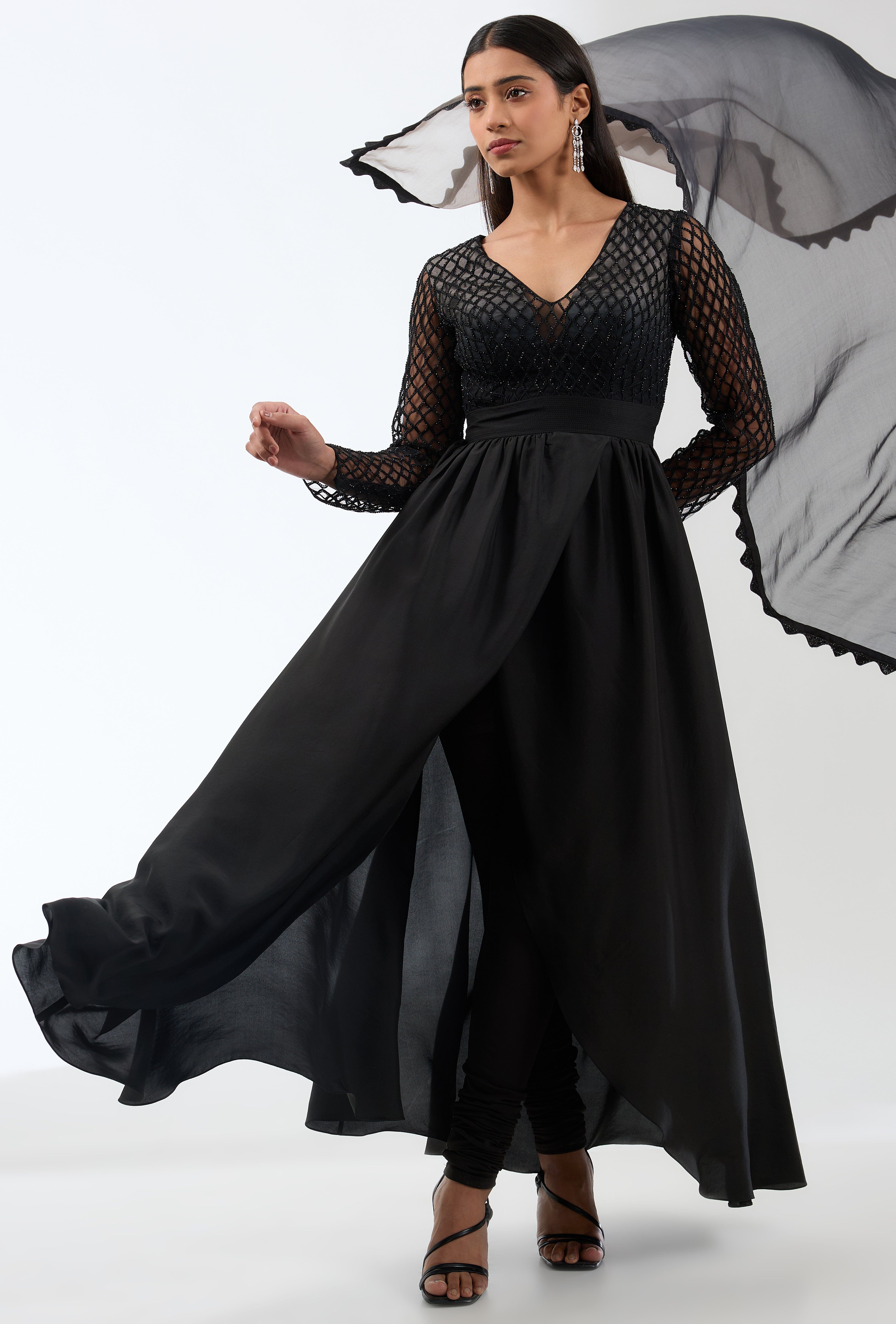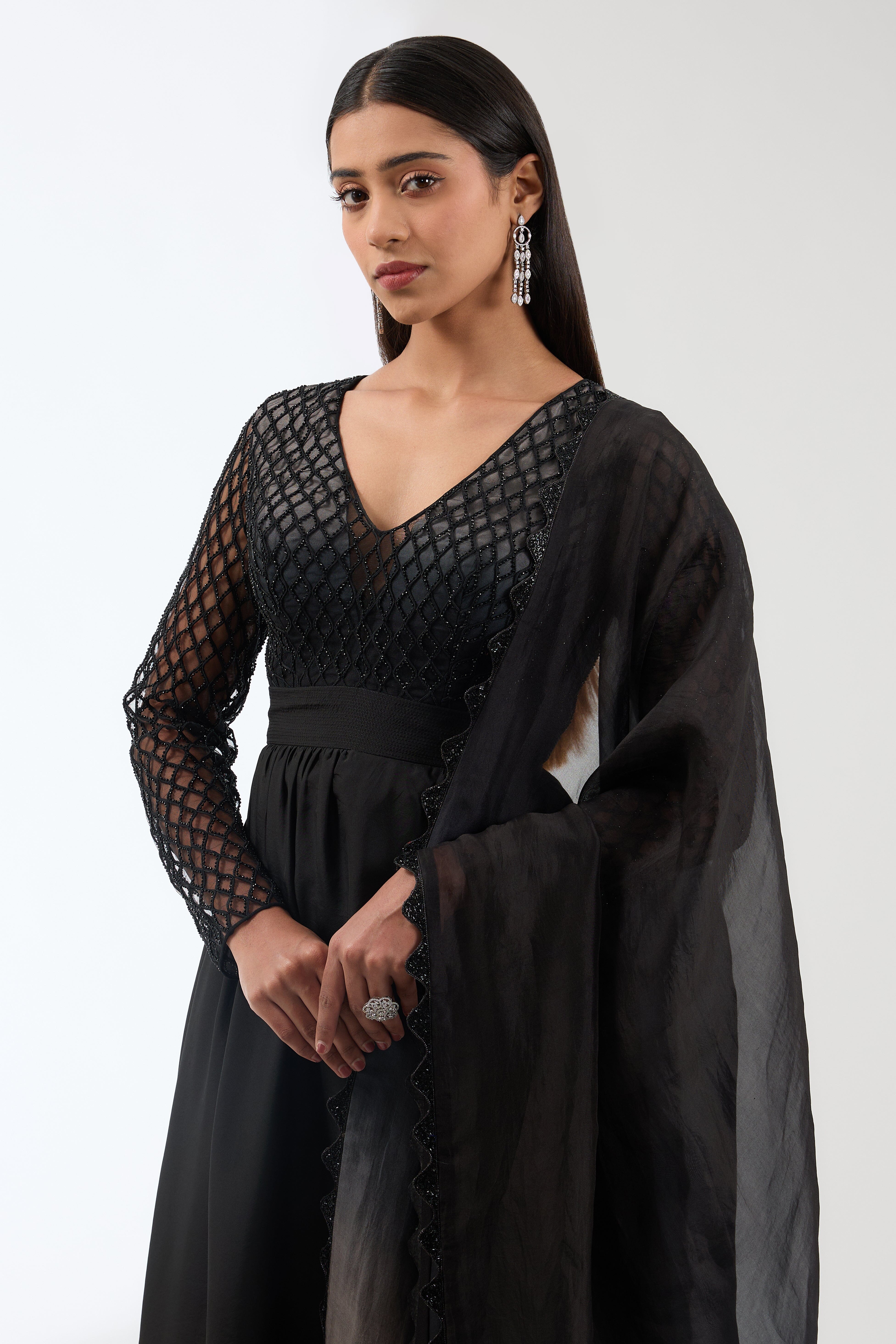Sparkle in this draped silk kurta set with a beaded hand embroidered body and ombre silk organza stole.