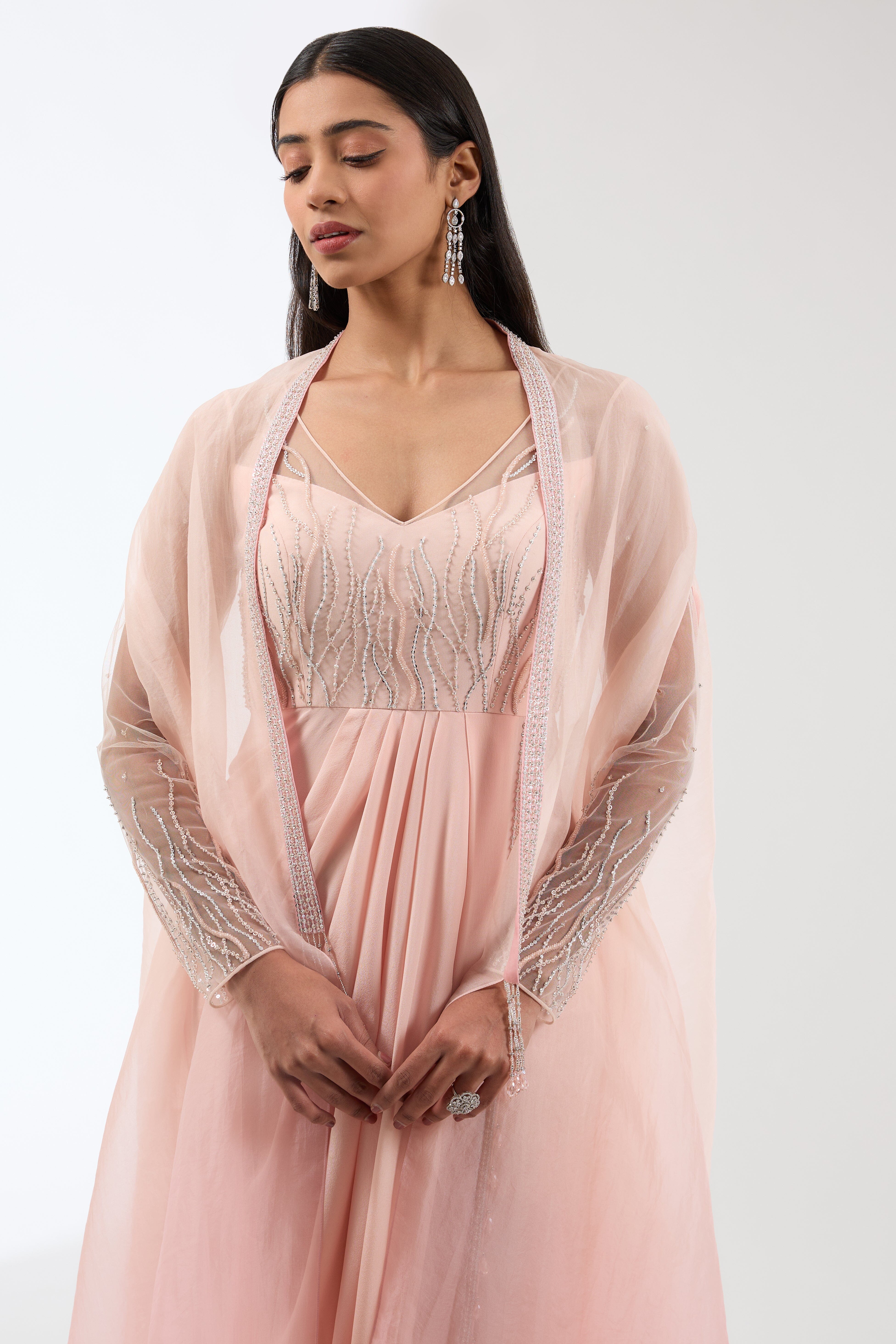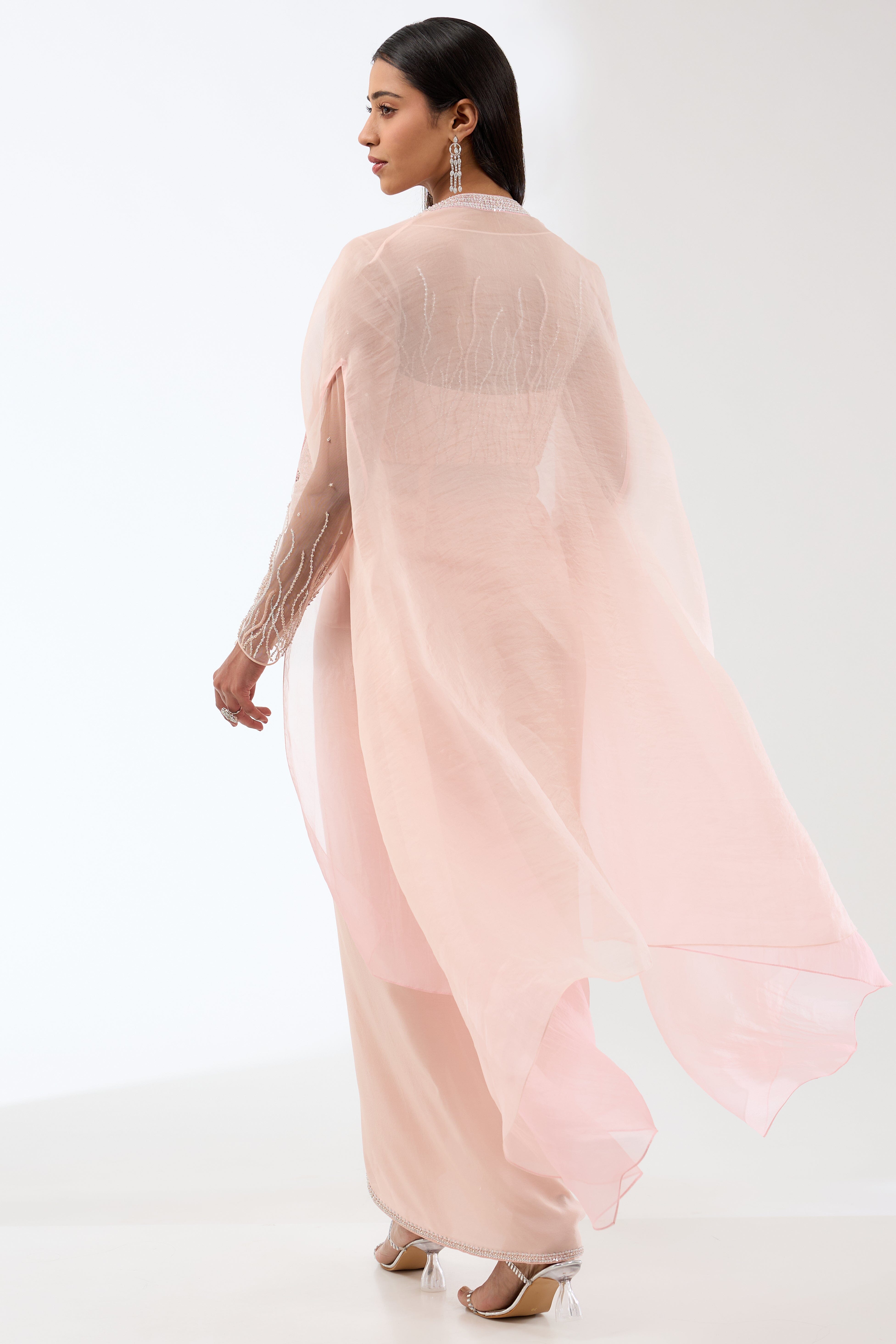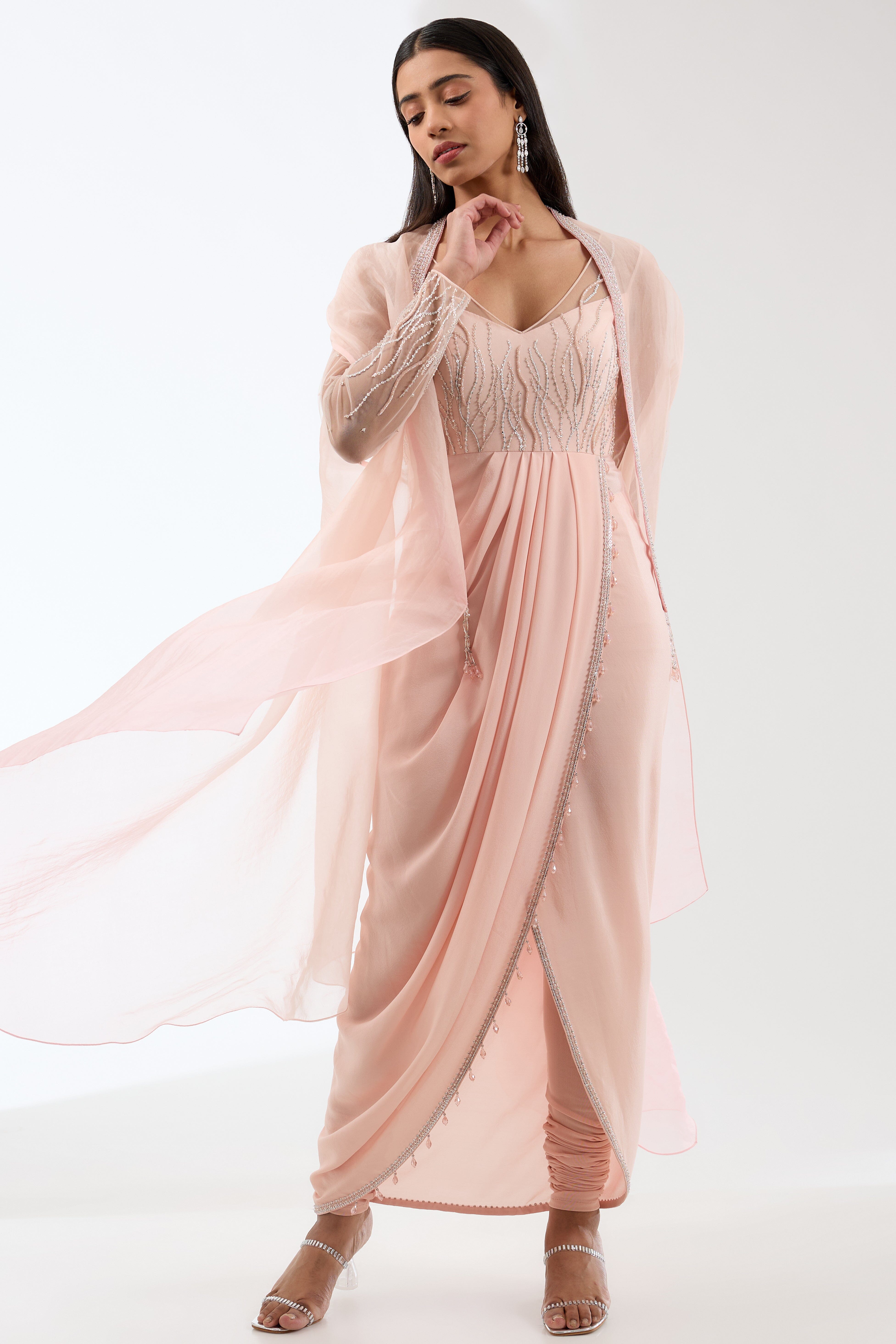 Be bold with this trendy draped kurta featuring crystal and sequins embroidery and a silk organza ombre cape.