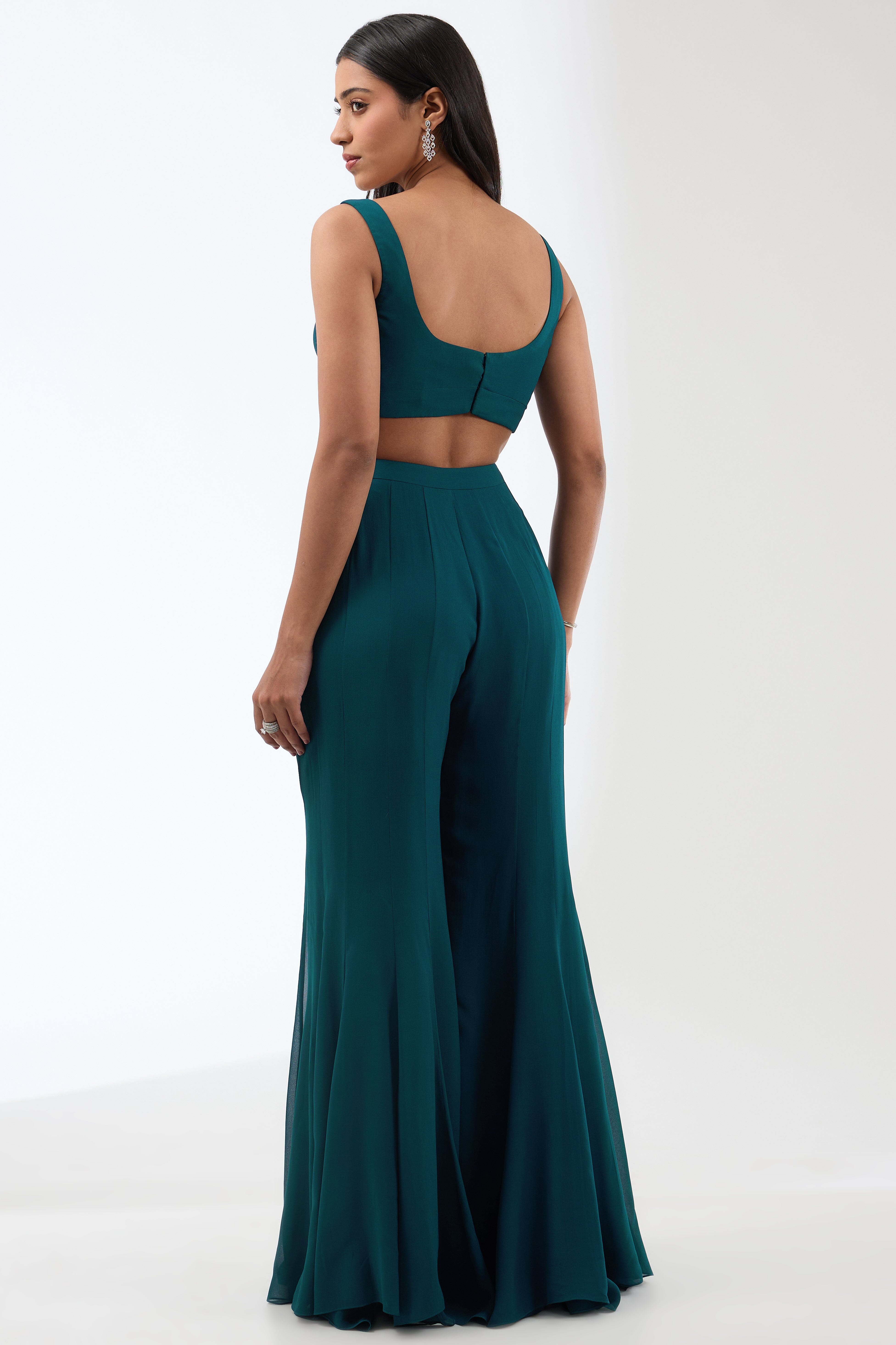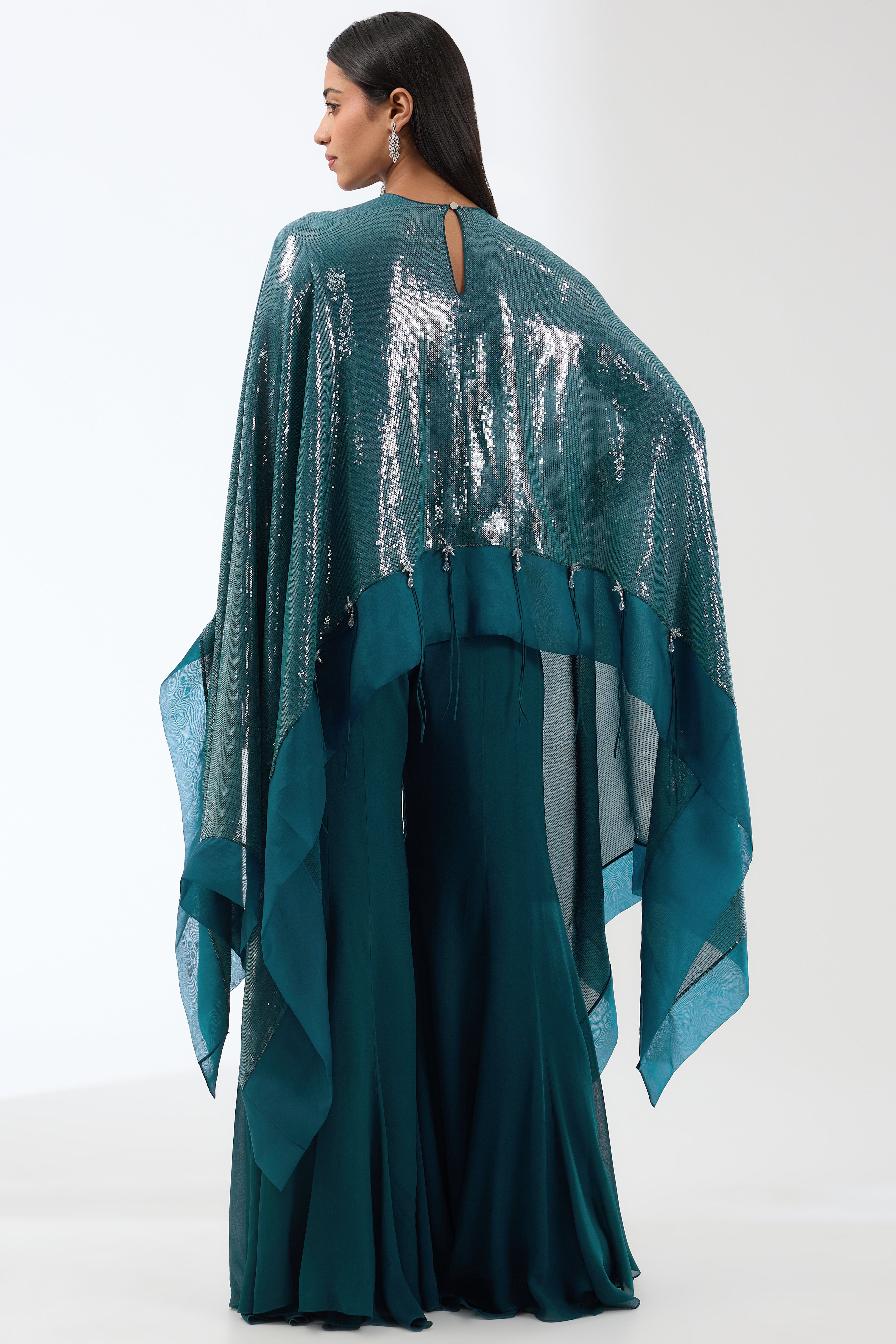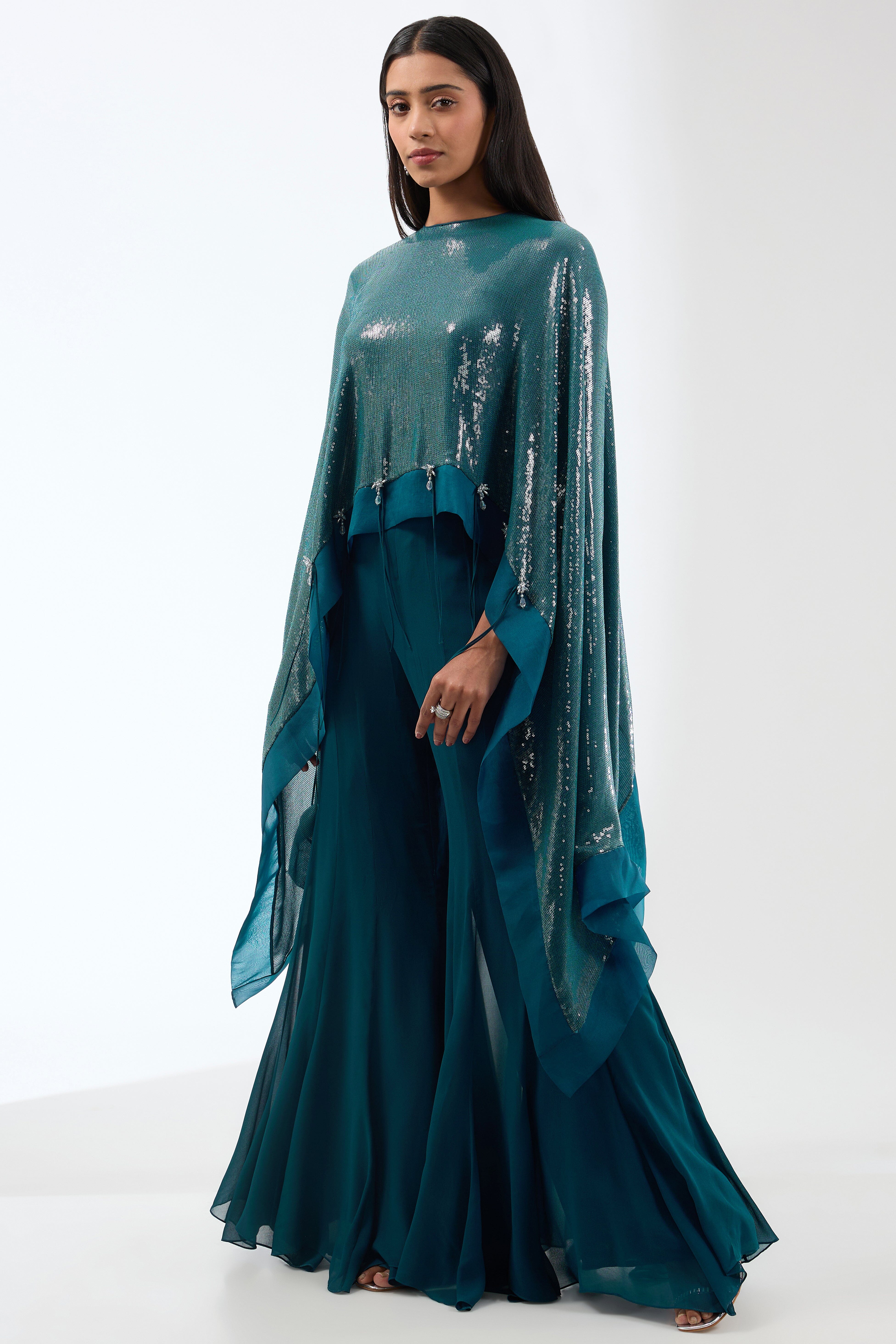 Dazzle at your soirée with our Fully Sequinned long cape paired with bustier and trousers set designed for both comfort and style. The flowy pants with cape is perfect for a stylish gathering in the summer.