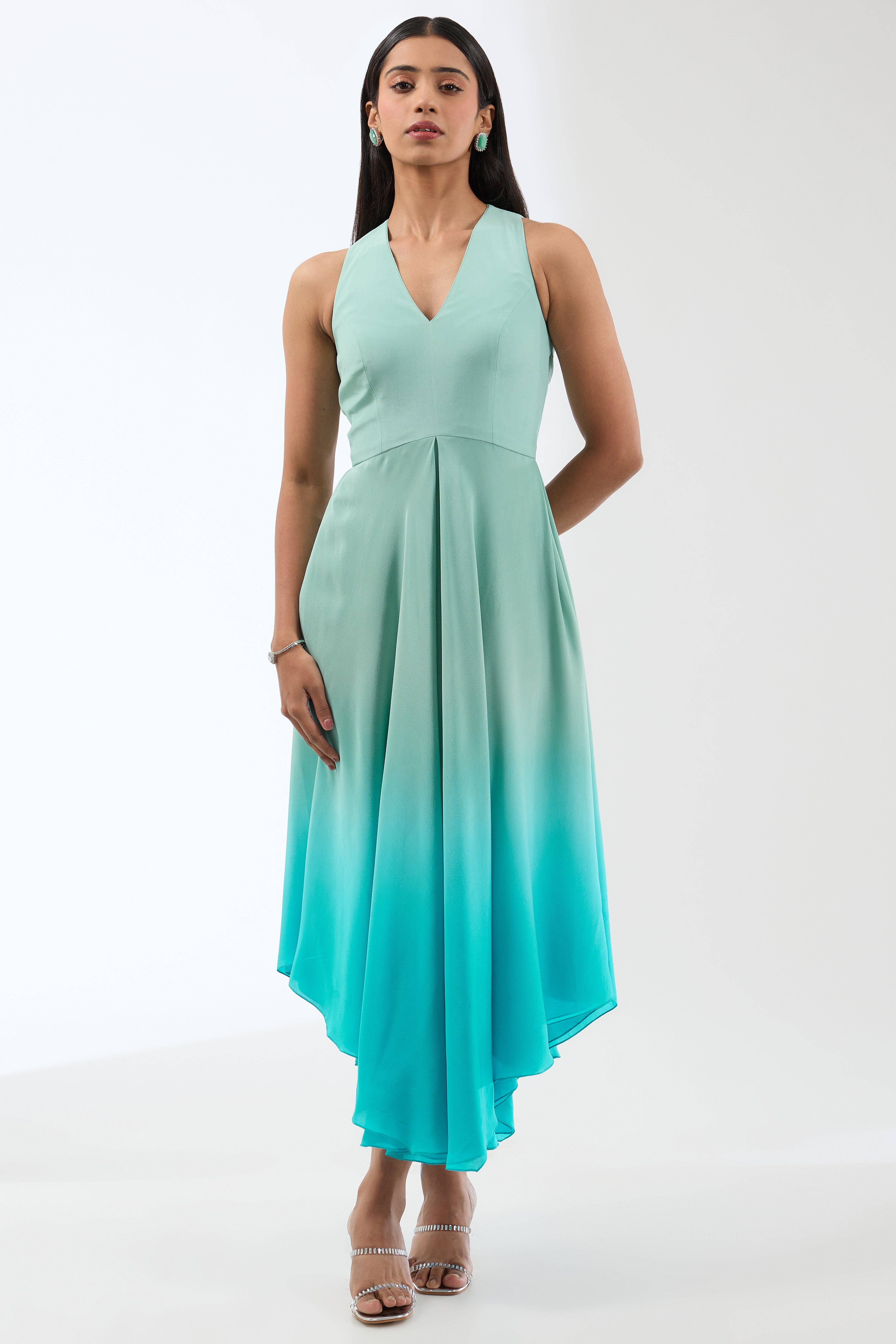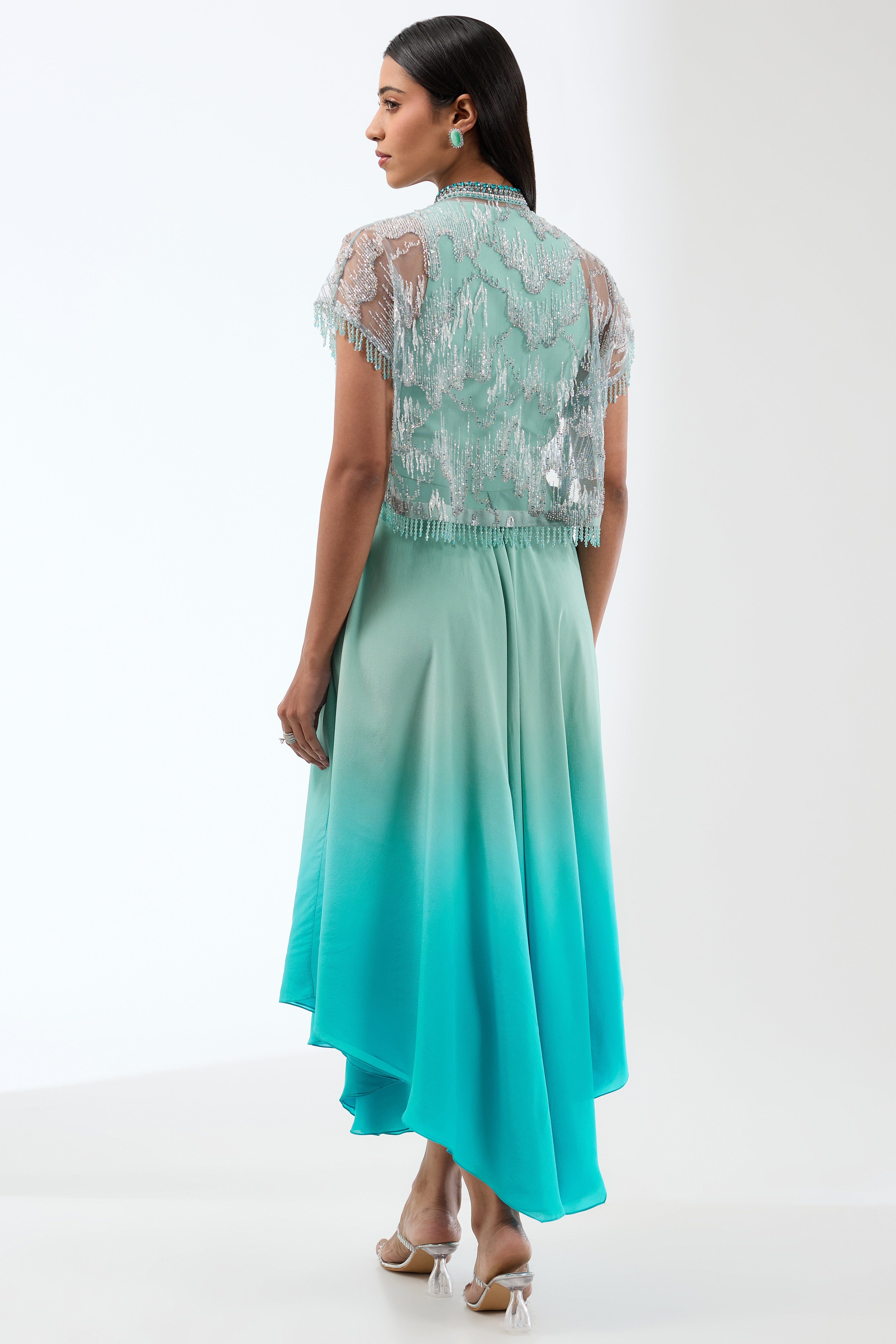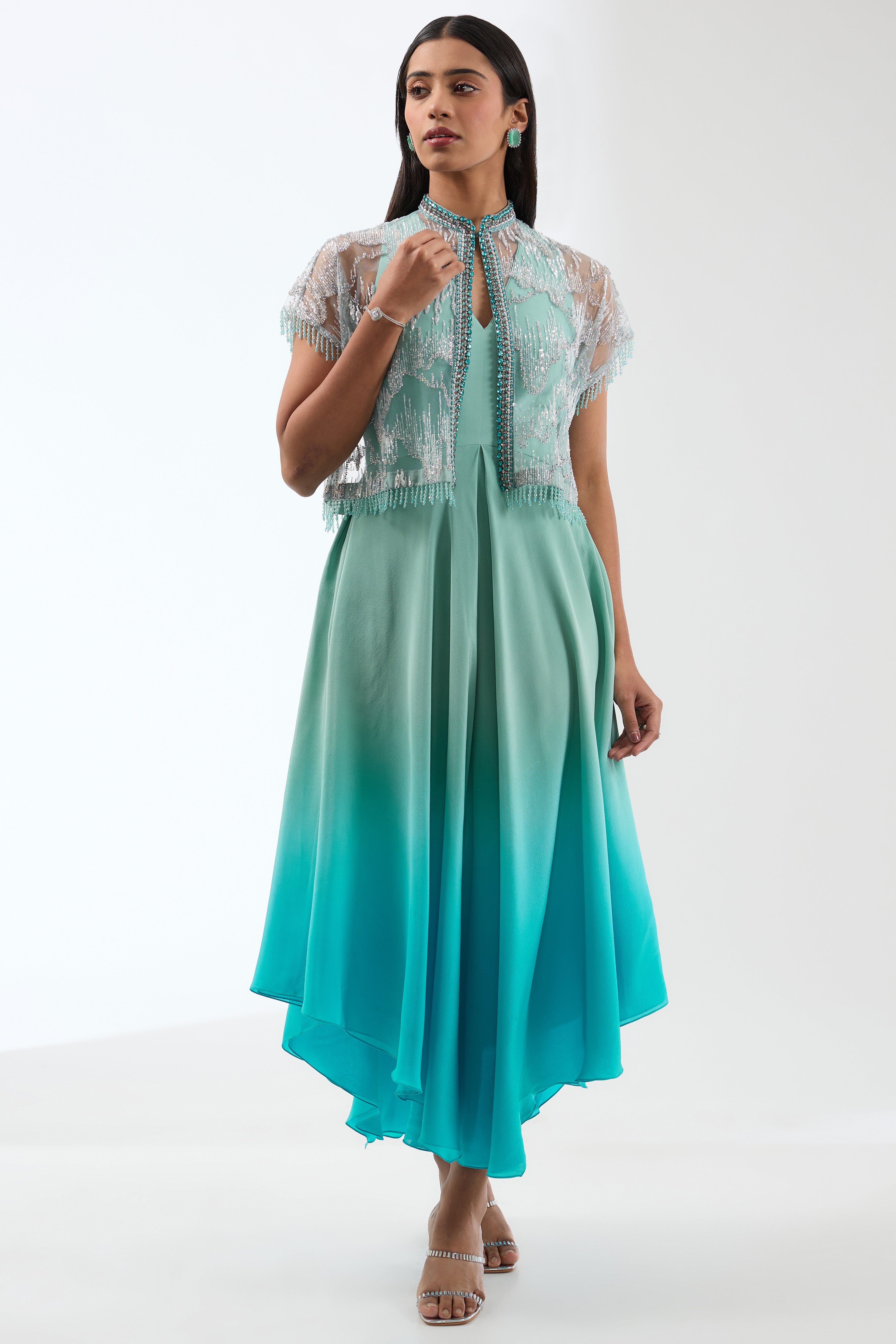 Elevate your style effortlessly with its flattering gathers and dazzling short cape, perfect for making a chic statement at any event.