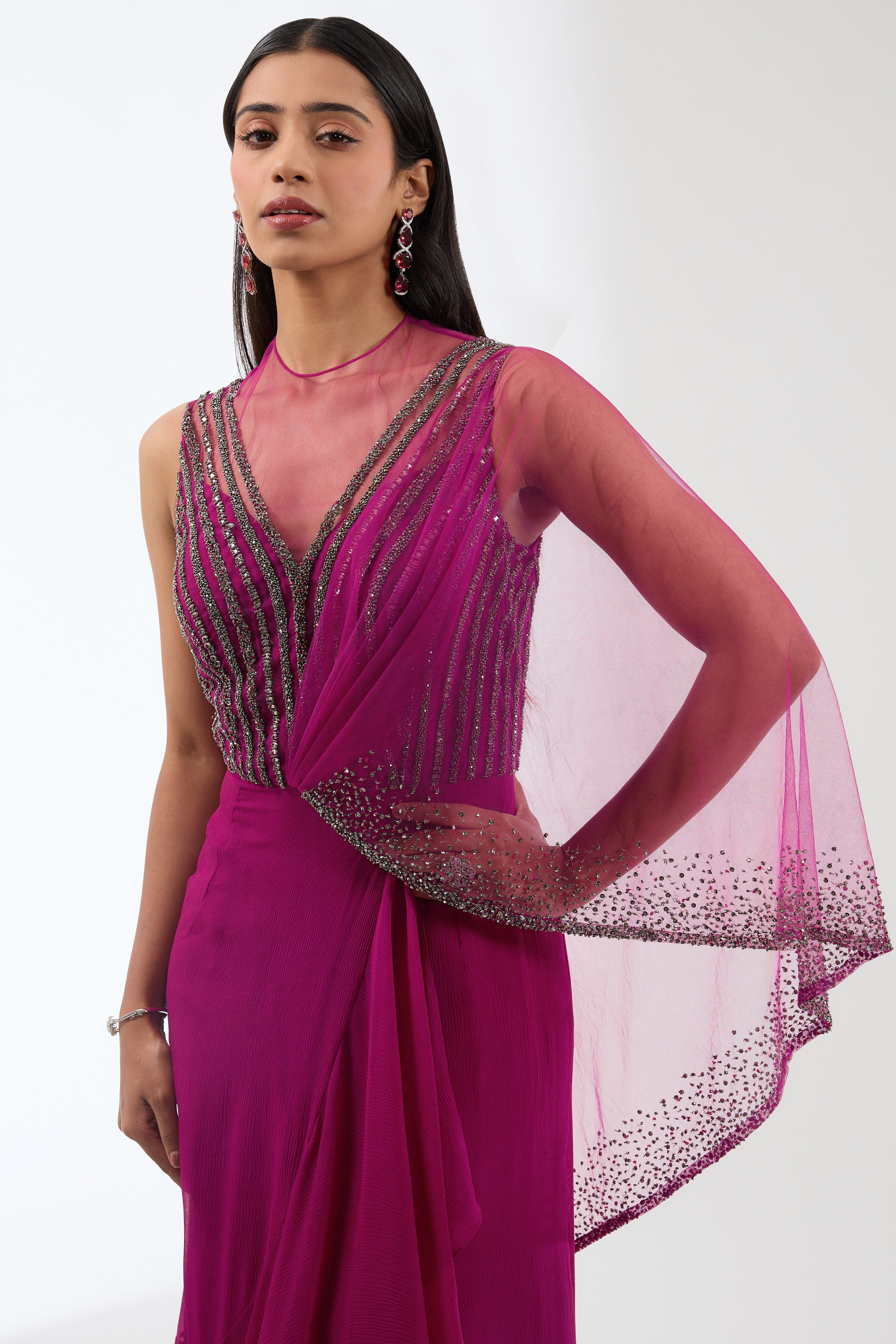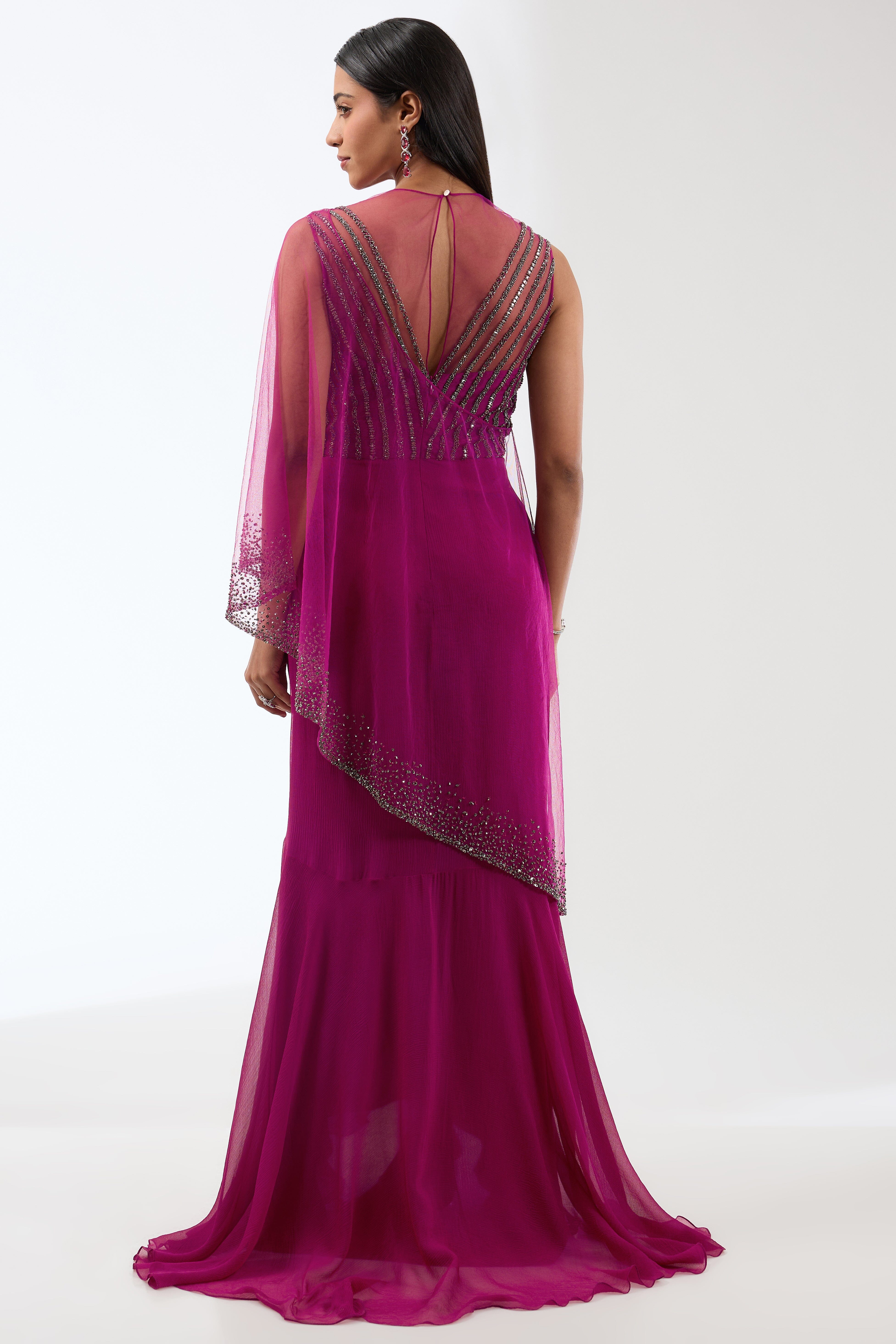 Make a bold statement in this draped georgette saree gown with hand embroidery.