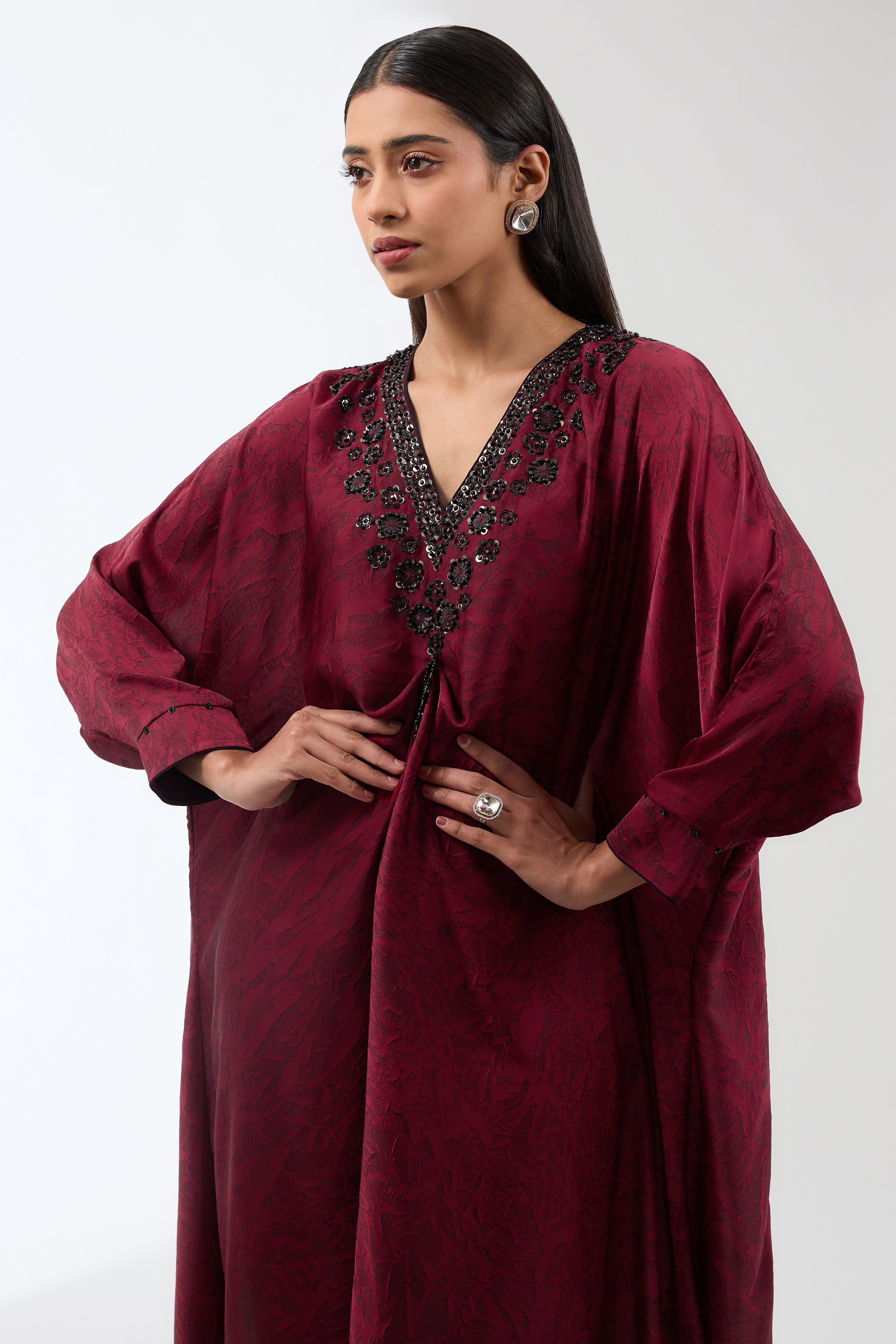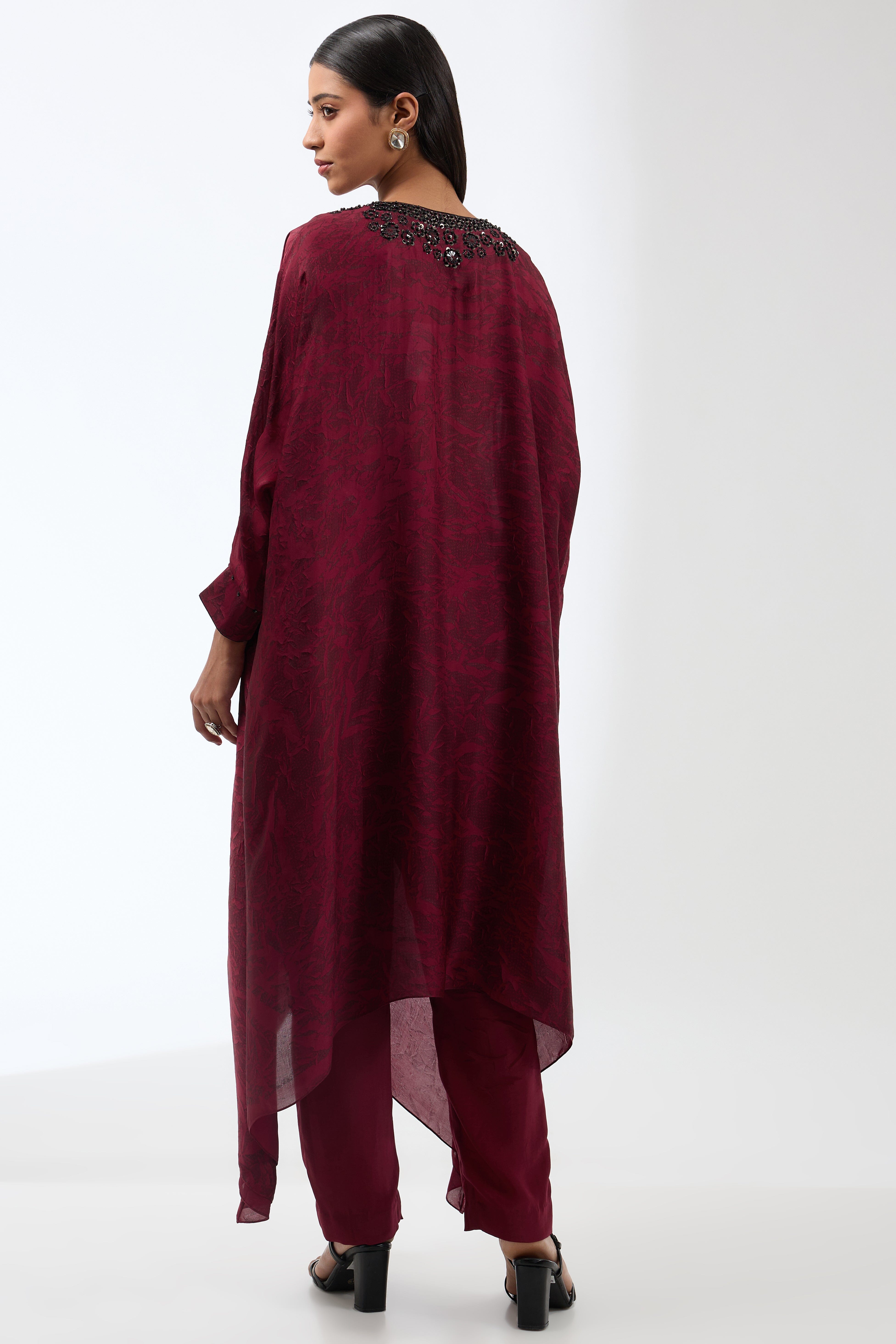 Paint the town maroon in this printed tunic embroidered with pants sequins, paired with trousers.