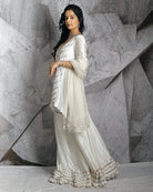 Envuelto entre la gracia eterna del marfil y el brillo sutil de la gota se encuentra este conjunto. La rica tela de chanderi lleva adornos de gota para crear una apariencia vanguardista. El chanderi de la kurta y los pantalones está tejido a mano con amor por tejedoras de los interiores de Madhya Pradesh. El conjunto se combina con una dupatta de red con un borde adornado.