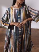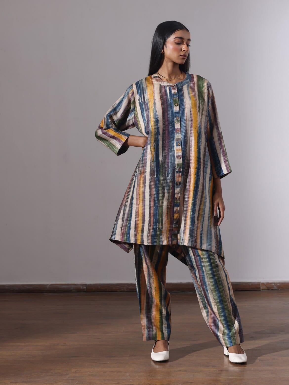 A flowing composition of colour and movement, this silk co-ord set is a dream brought to life. Thick, hand-painted stripes stretch across its beige base in deep olive, golden yellow, soft mauve, and rich indigo- each stroke a testament to the beauty of imperfection.