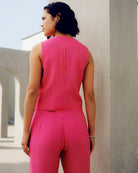 The Pink Margot waistcoat co-ord set is made of double georgette. It features delicate floral embroidery and sequins detailing at the hemline of the shirt and trousers.
