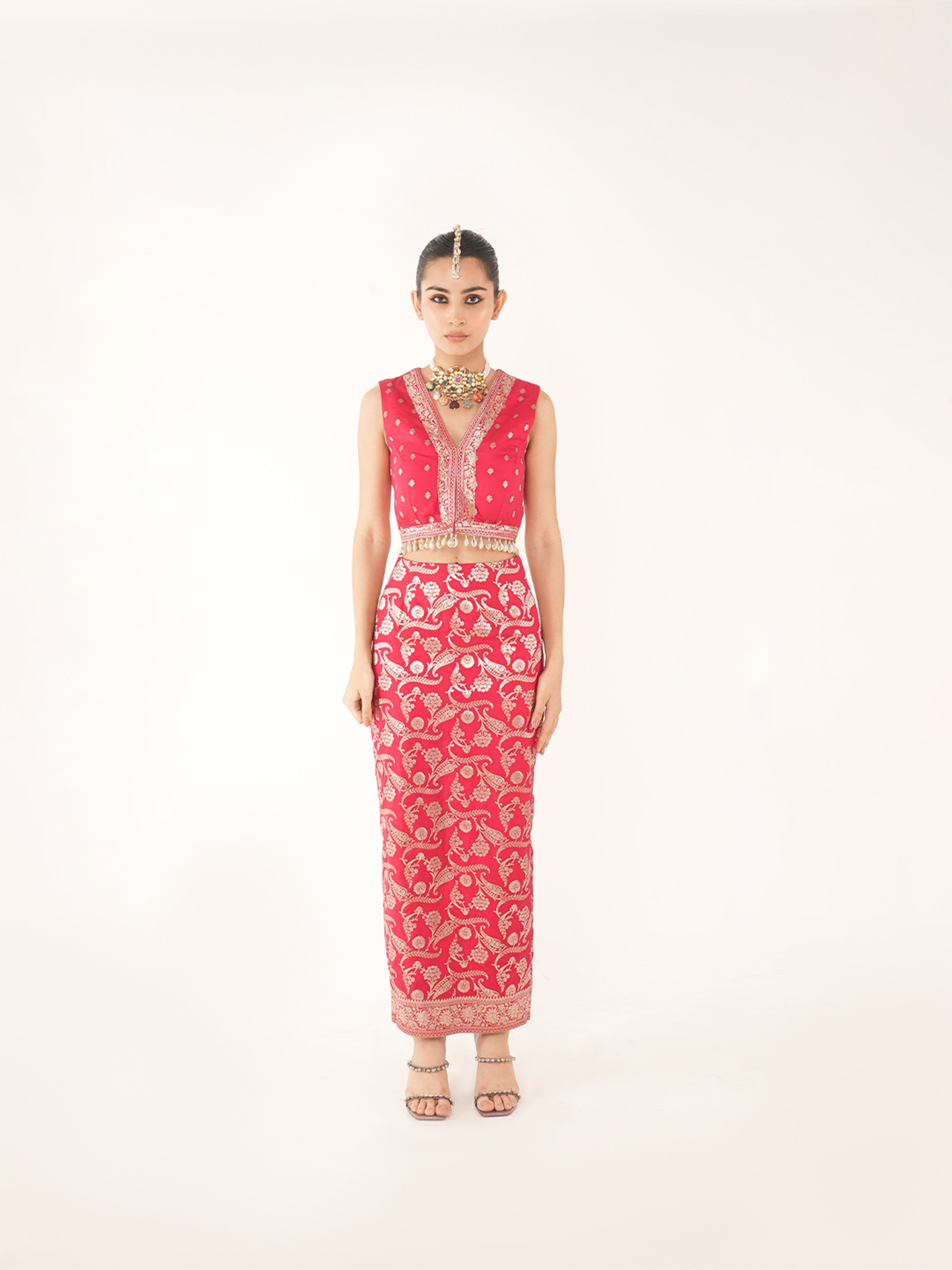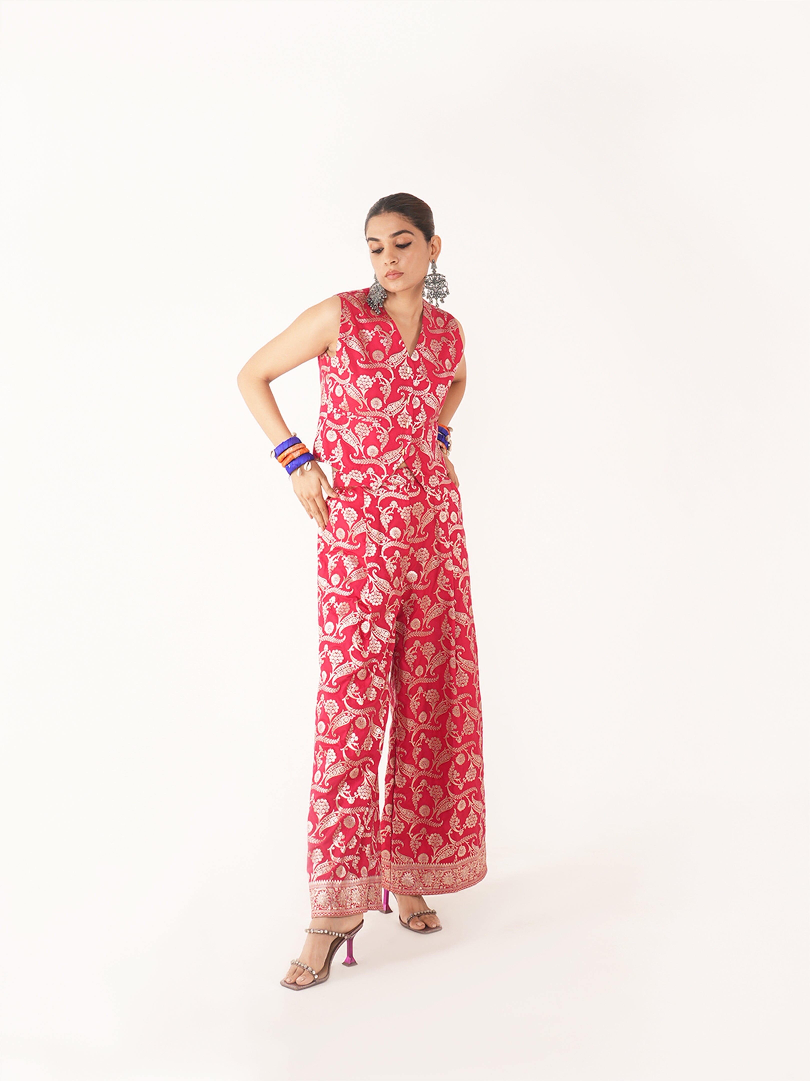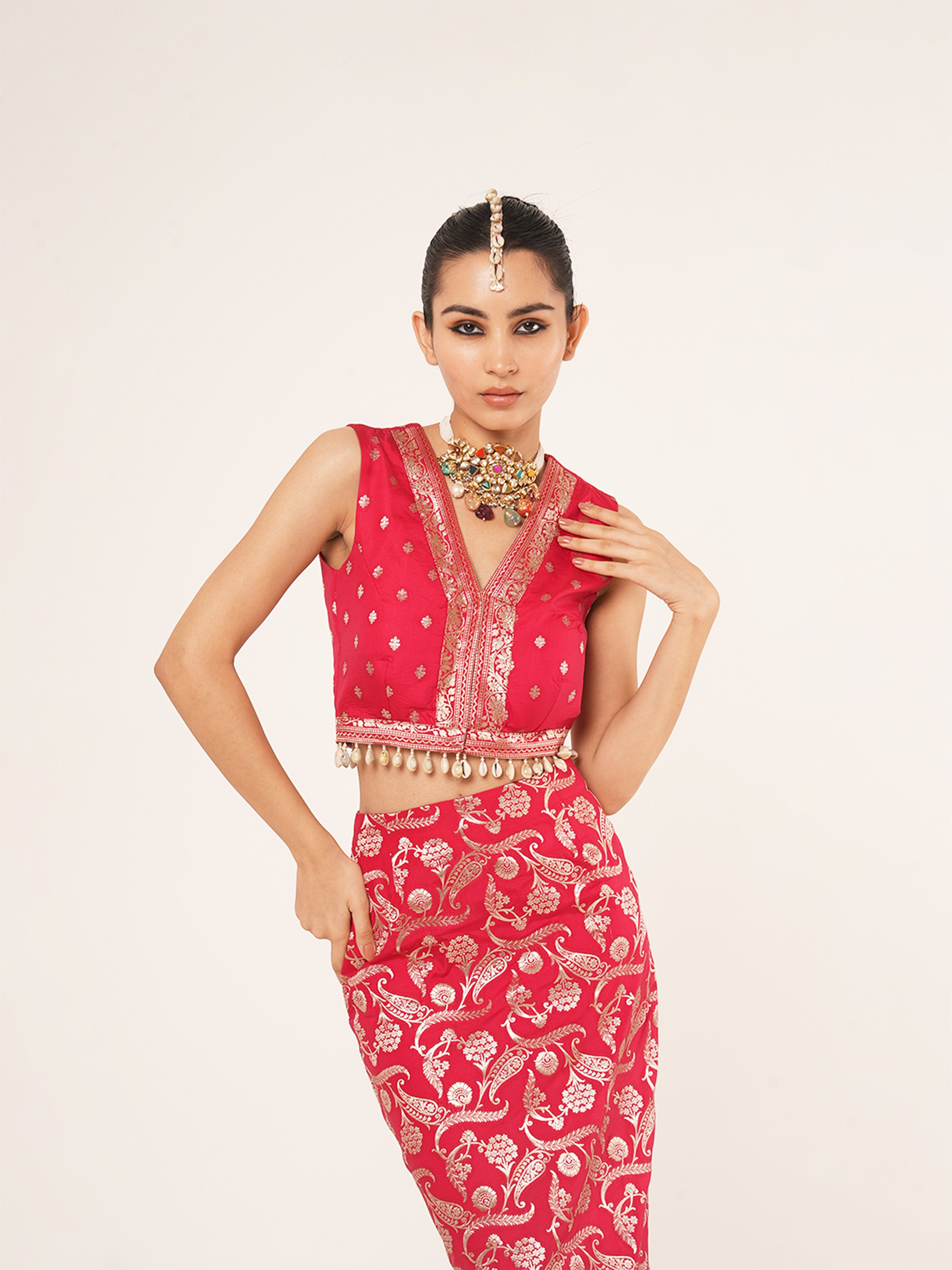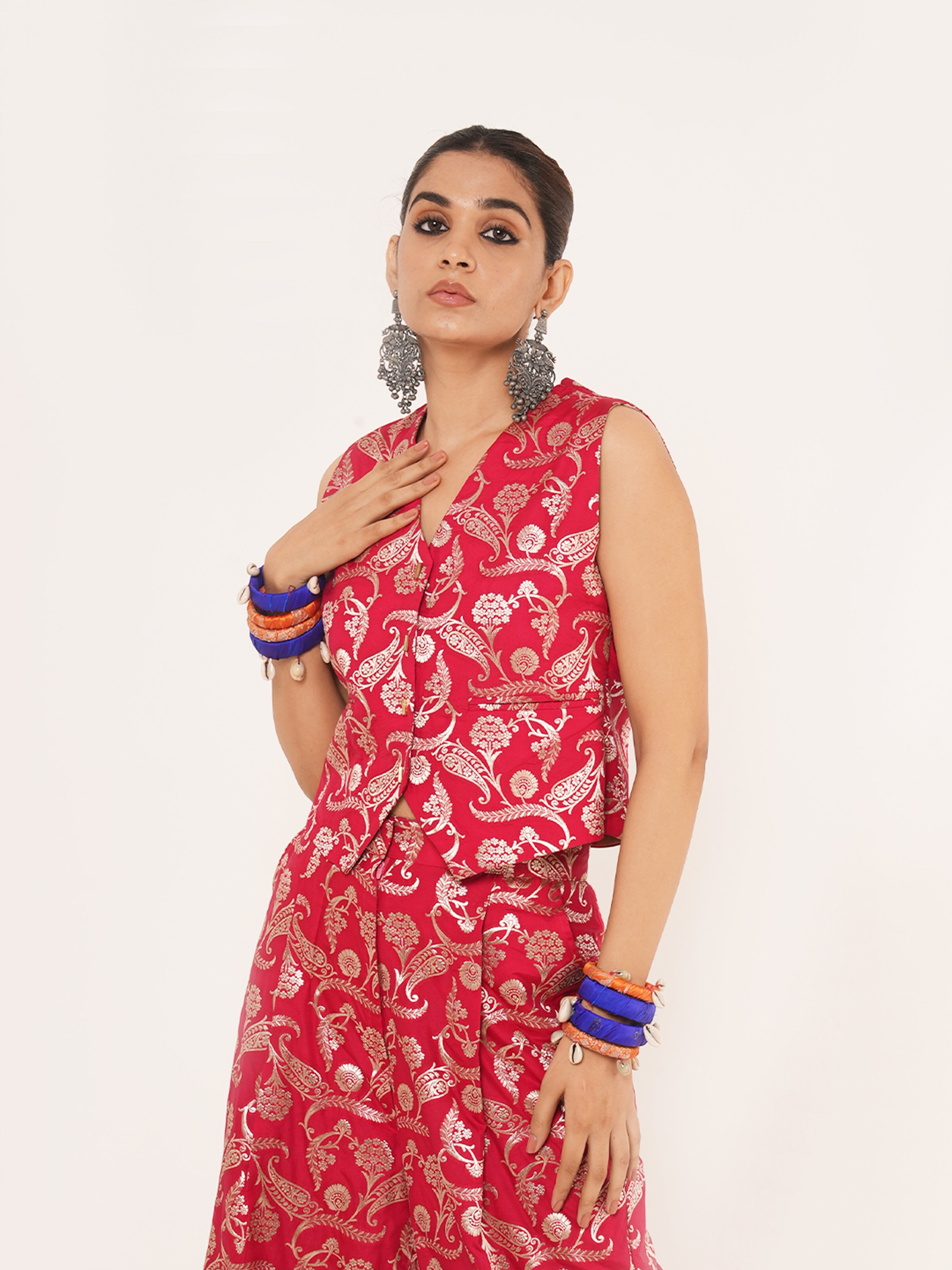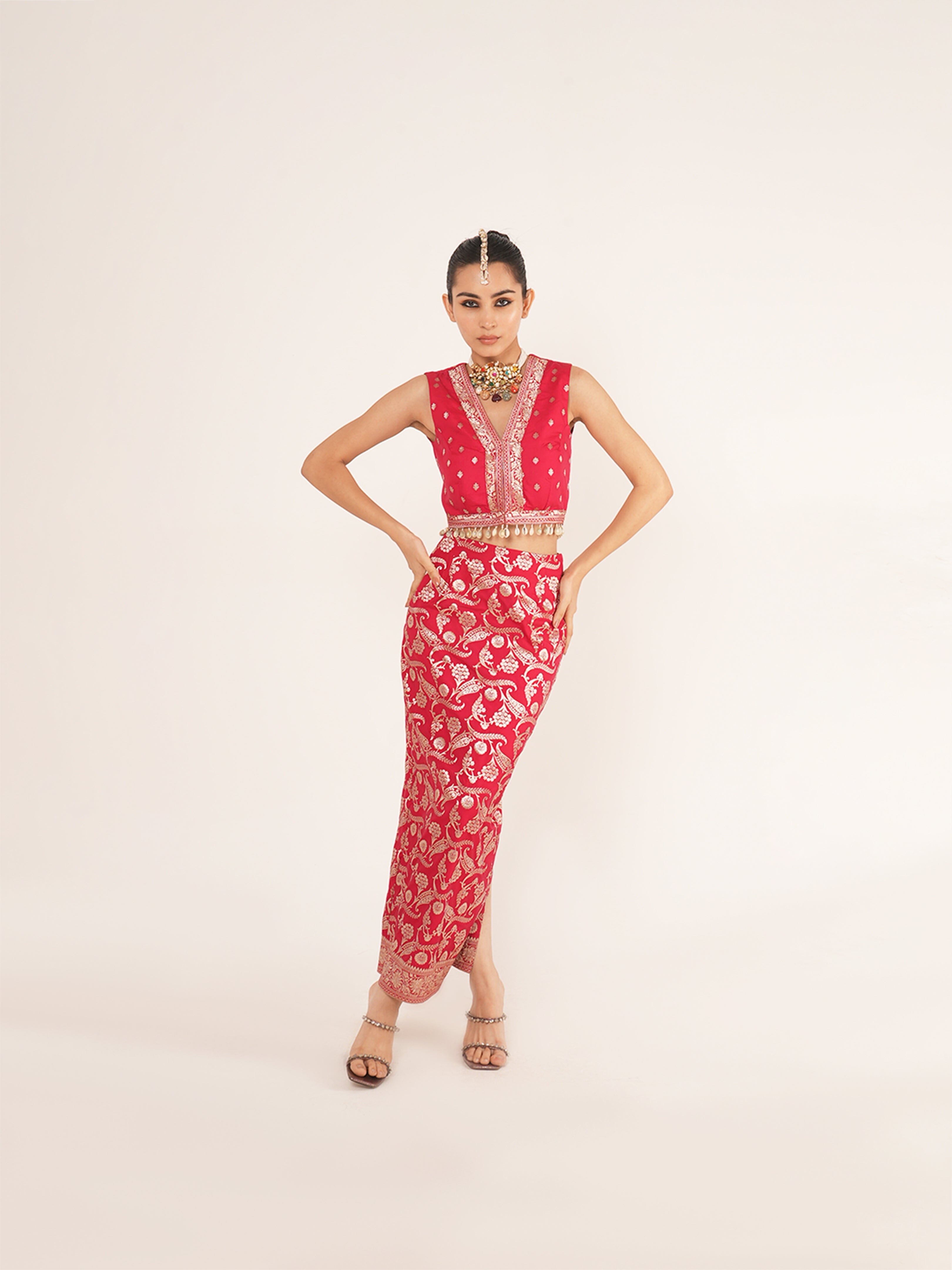 Conjunto de pantalón y cinturilla de seda roja Amyra