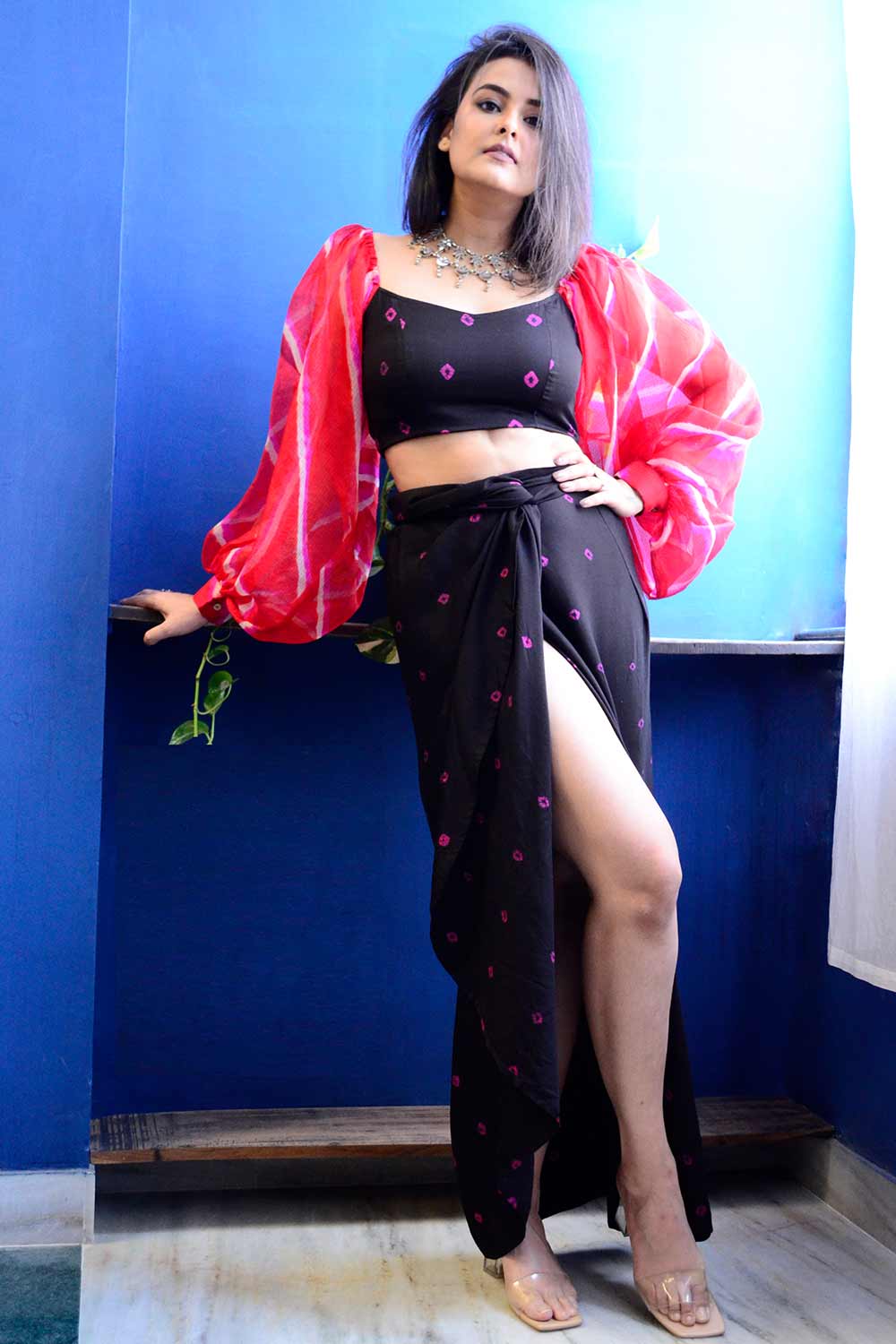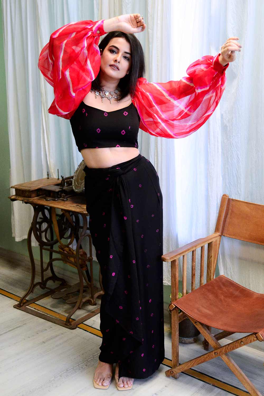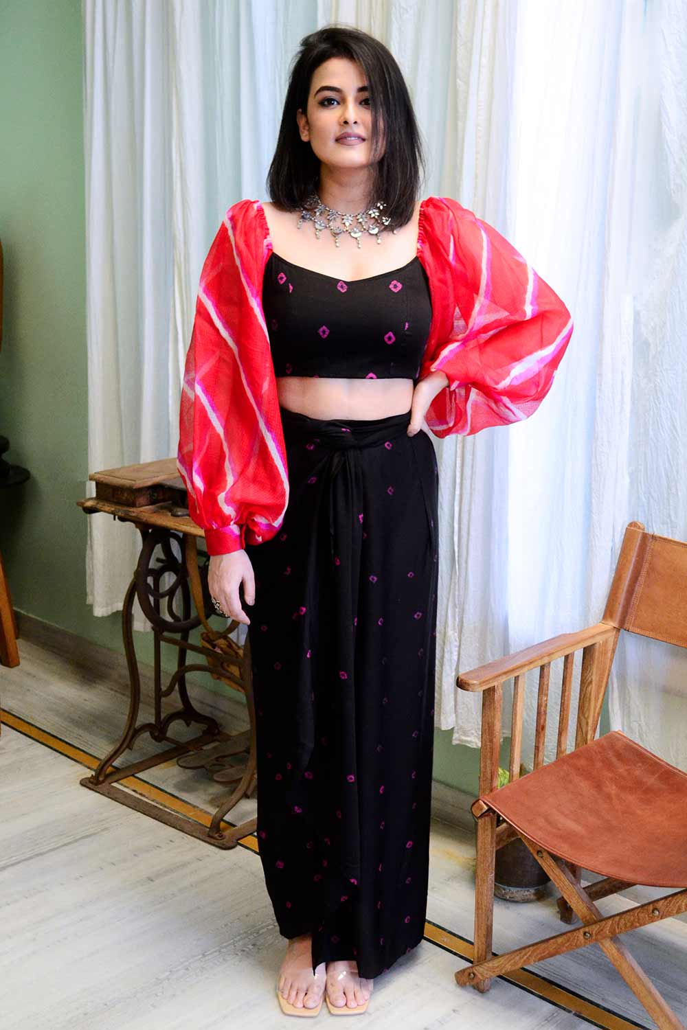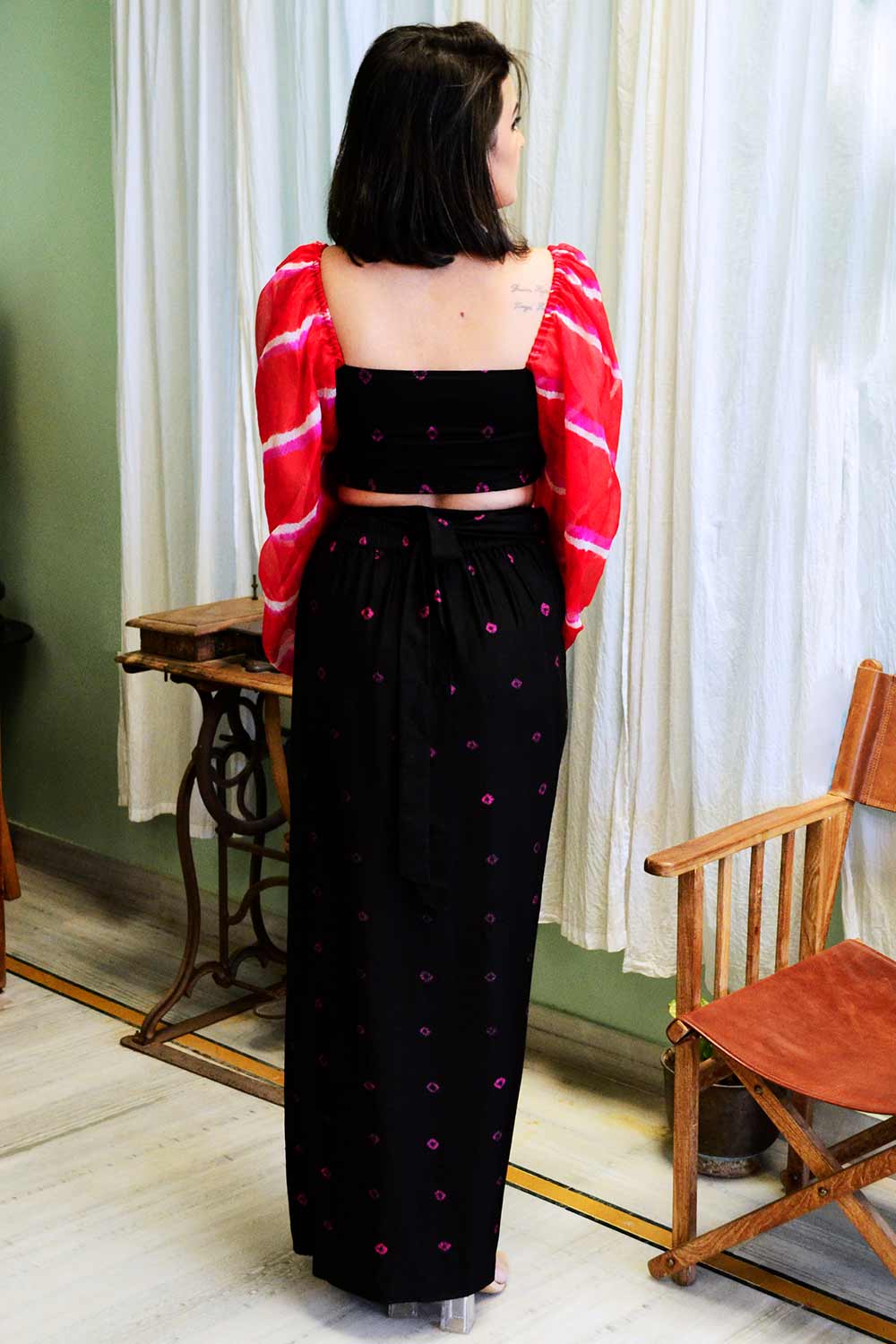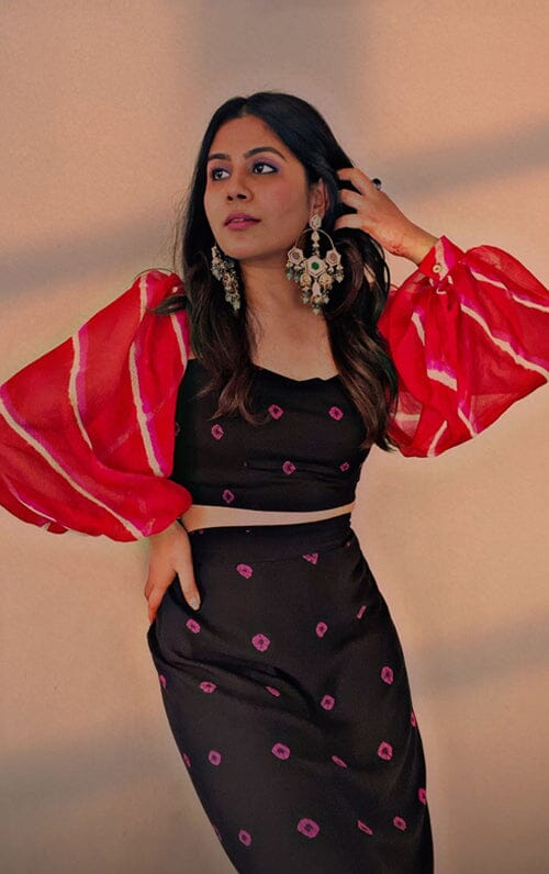 Conjunto corto de falda cruzada Bandhej con mangas Lehriya