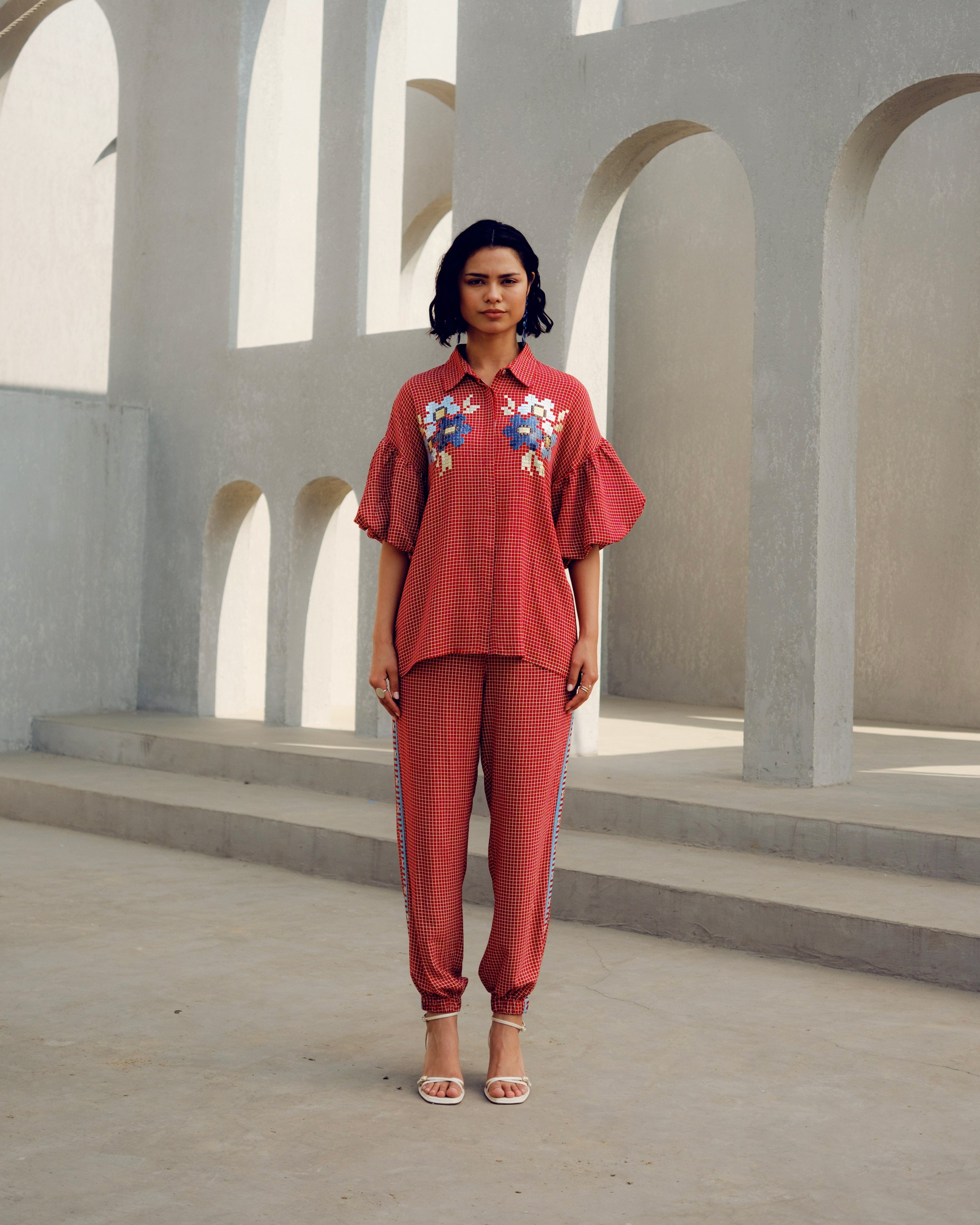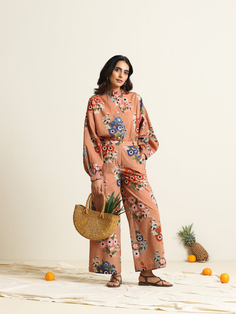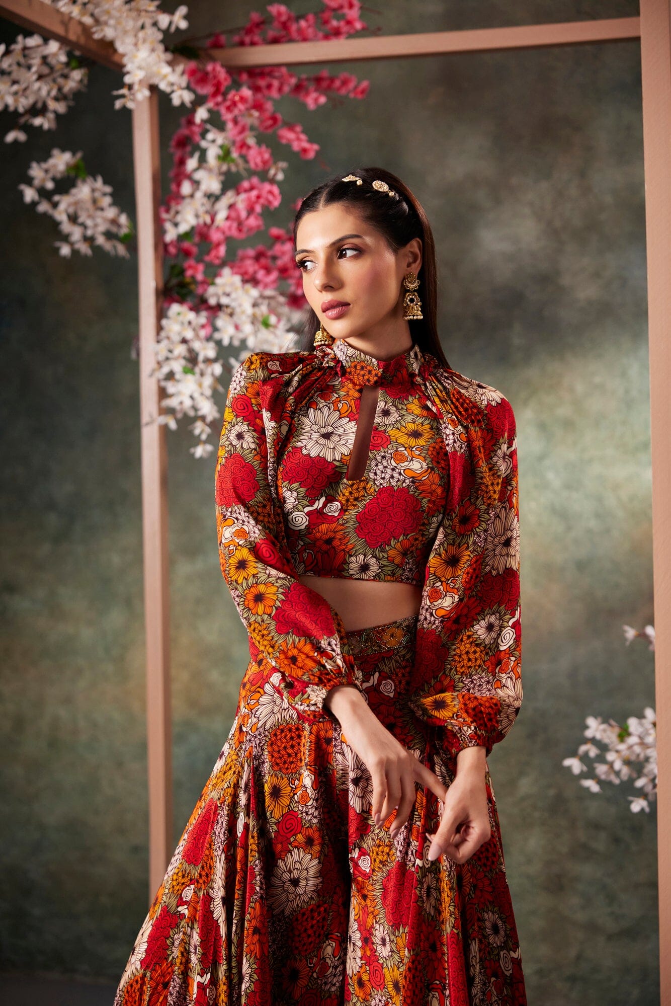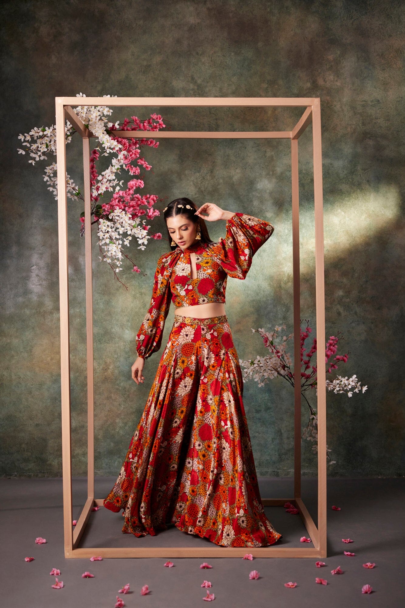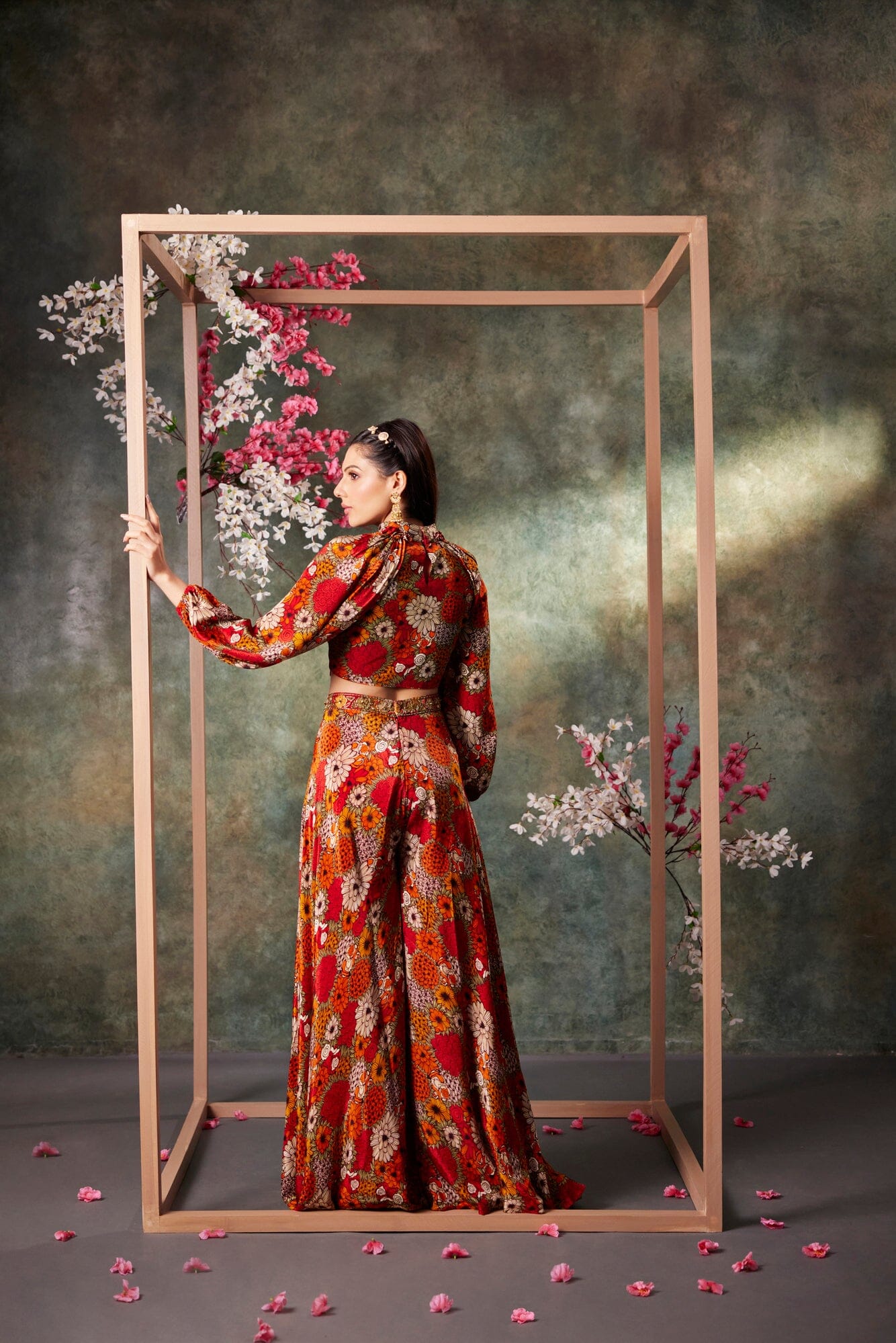 Orange Printed Balloon Sleeves Top And Panel Pants Set With Embroidery