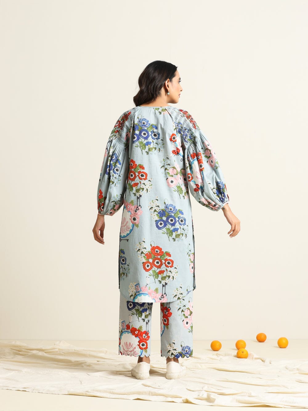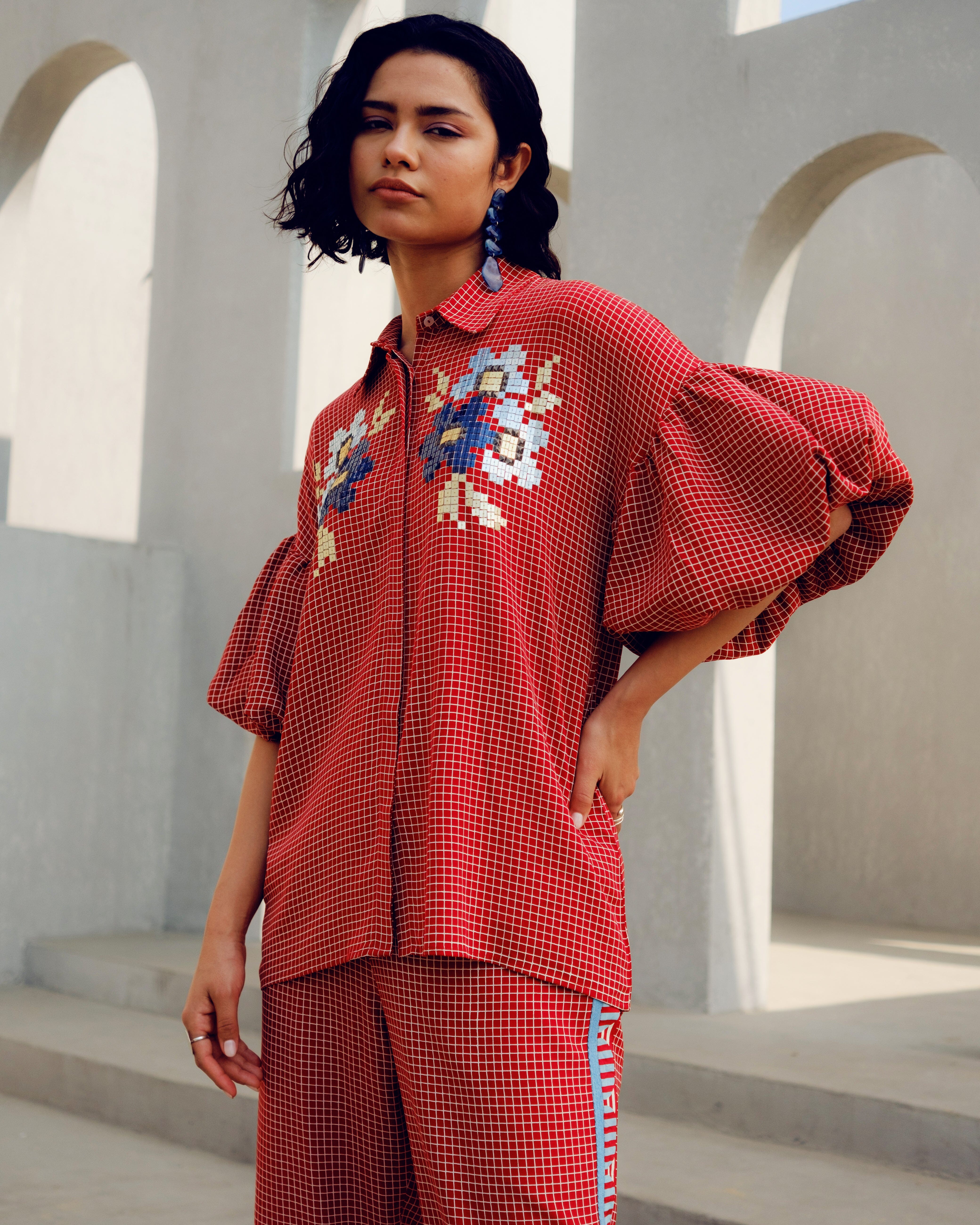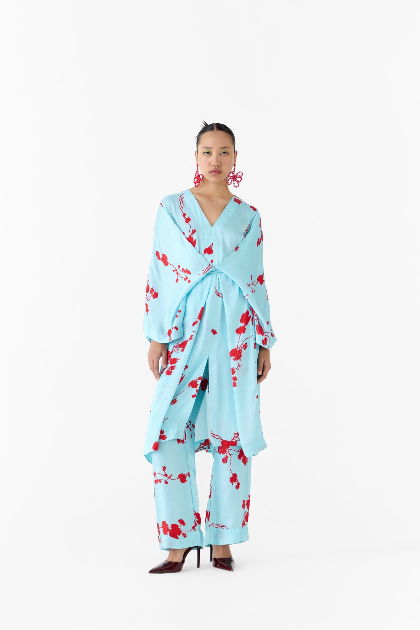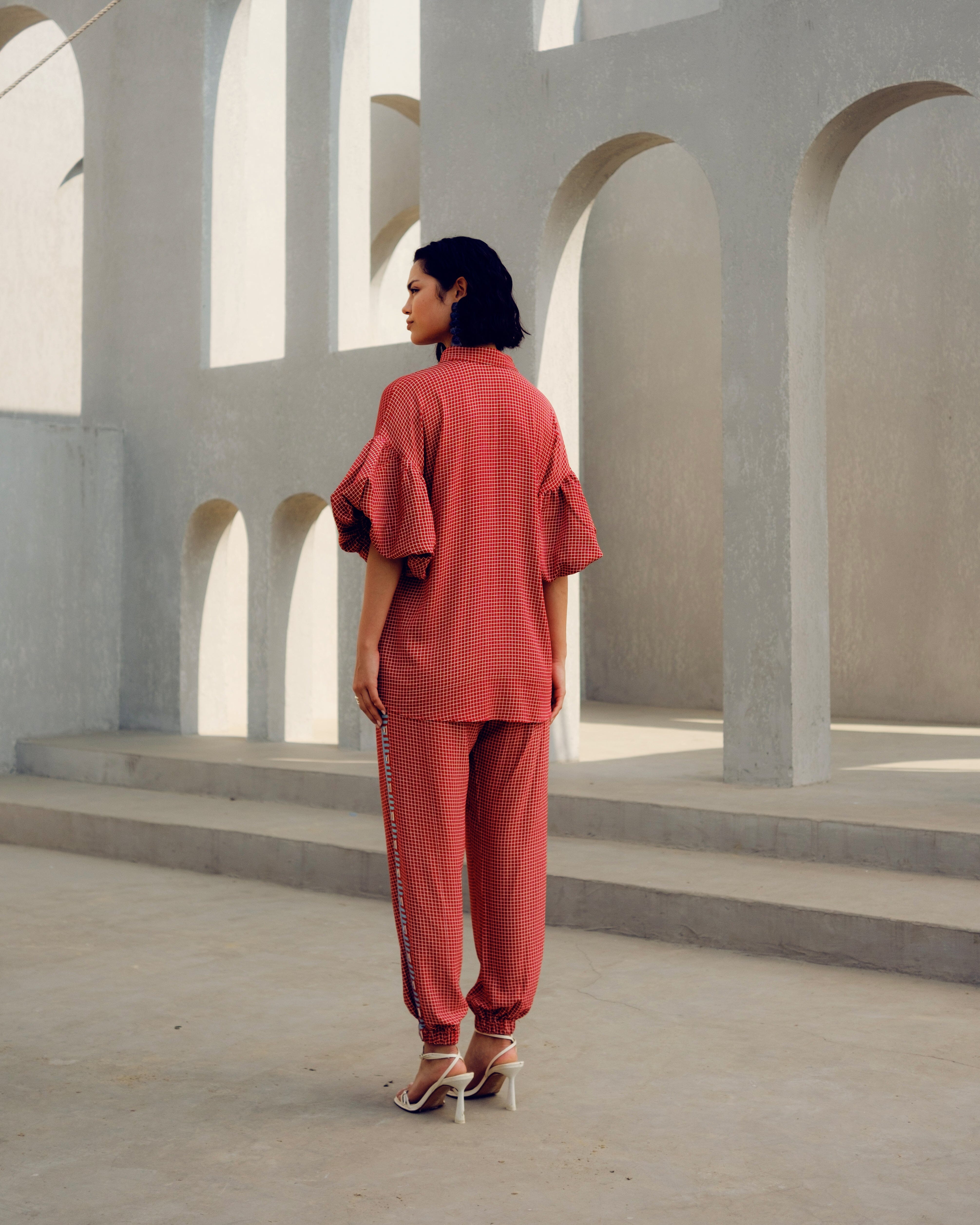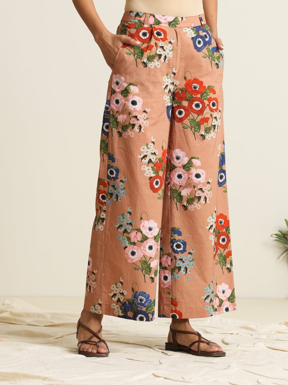 Orange Printed Balloon Sleeves Top And Panel Pants Set With Embroidery